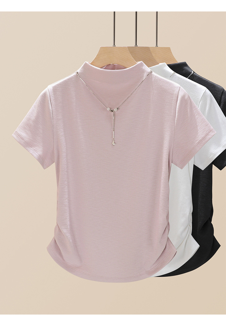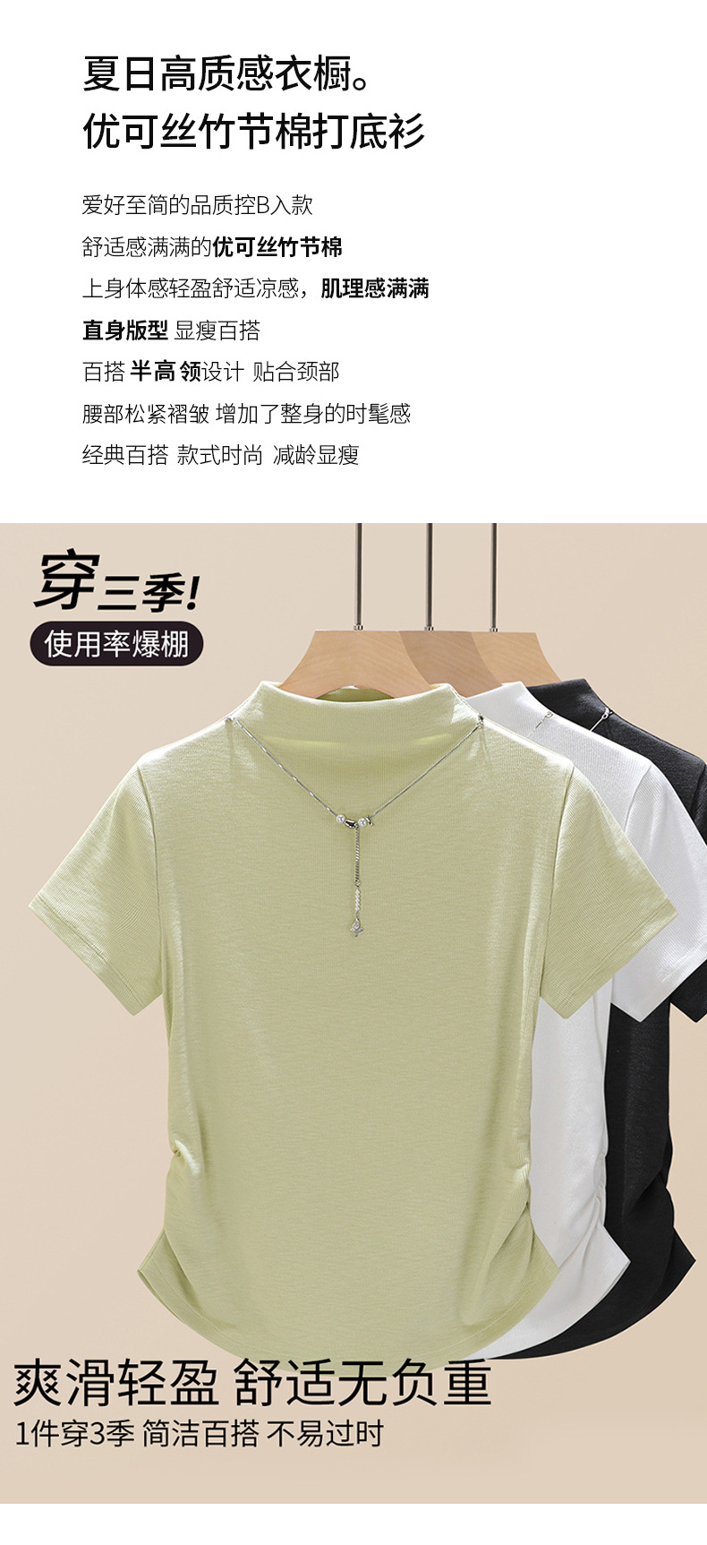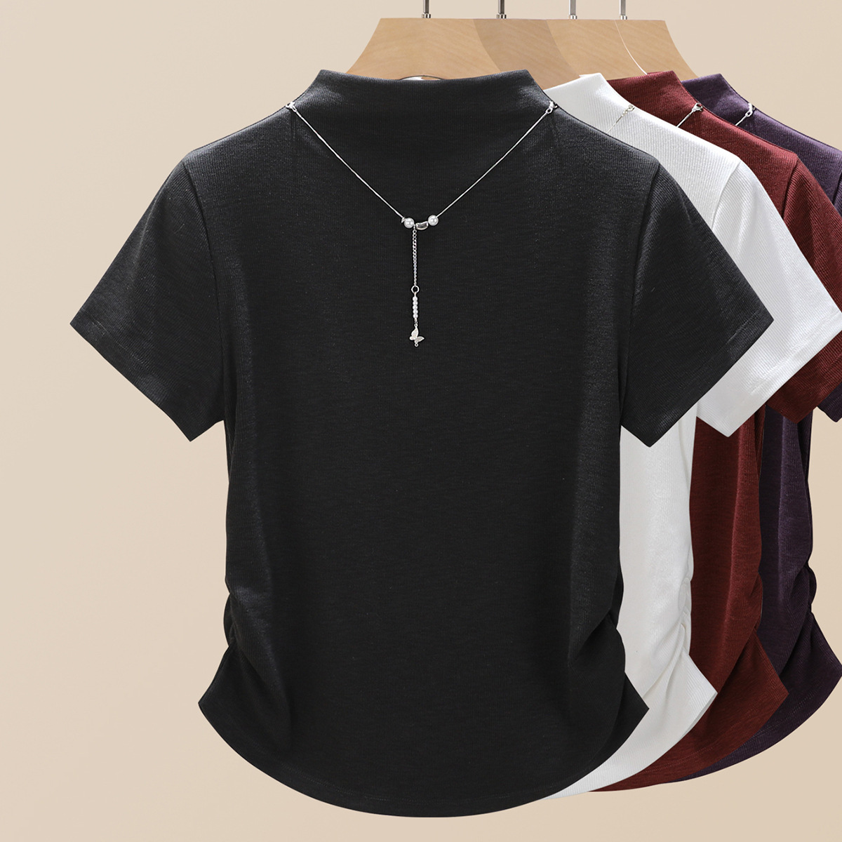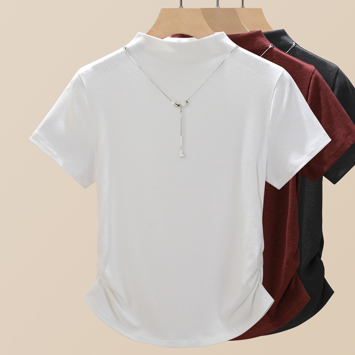 반 높이 칼라 반팔 티셔츠 여성용 2025 년 새 여름 꽉 조이는 허리 탑 슬림 핏 어깨 스타일 베이싱 내부