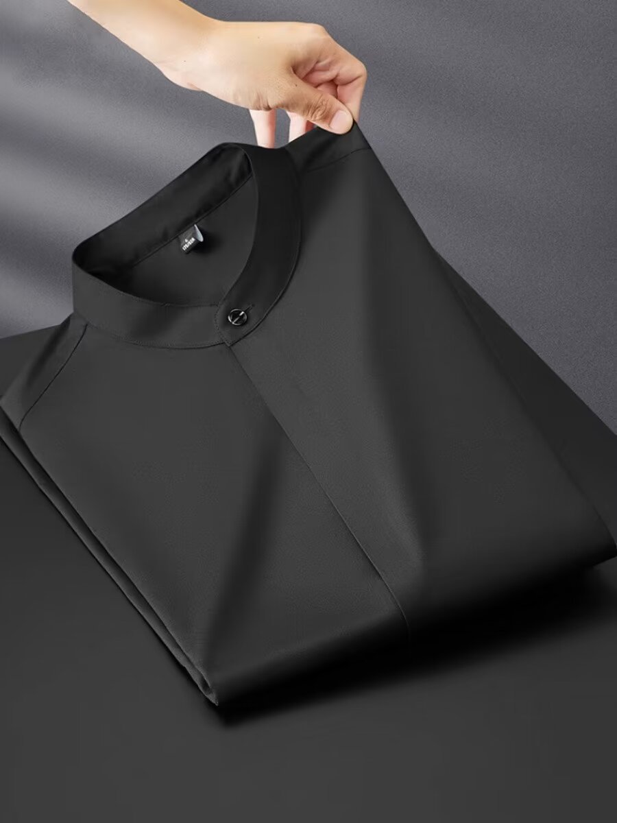 봄, 가을 남성용 실키한 노다림질 스탠드업 칼라 긴팔 셔츠 남성용 슬림 솔리드 컬러 셔츠 캐주얼 비즈니스 정장 셔츠