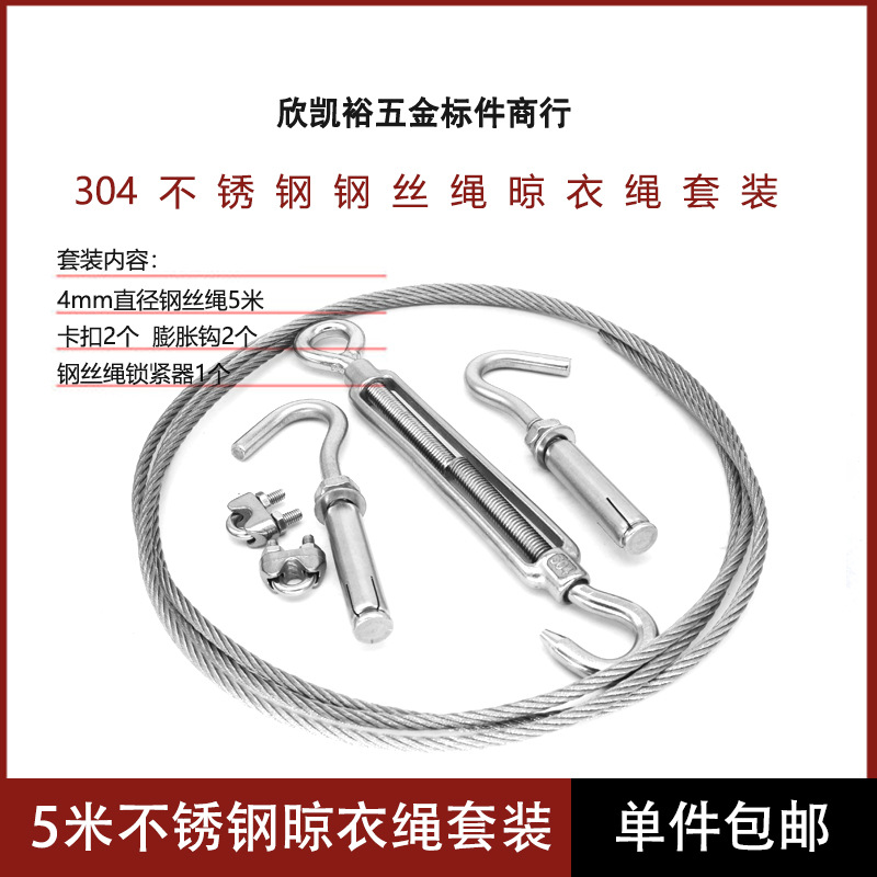 • 빨랫줄 세트(와이어 로프 4mm 두께 5m 길이 + 로프 클램프 2개 + 확장 후크 2개 + 텐셔너 1개)