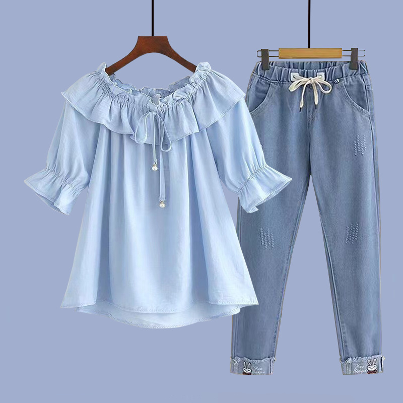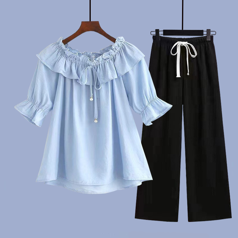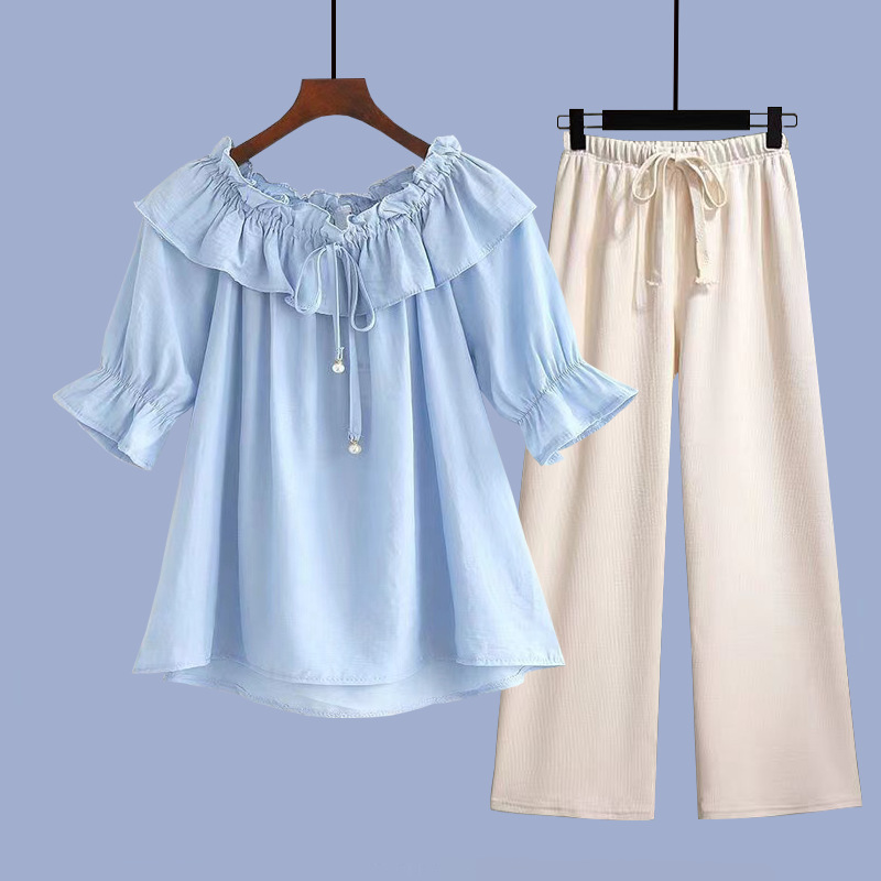 • 파란색 반팔 + 황백색 와이드 팬츠 정장