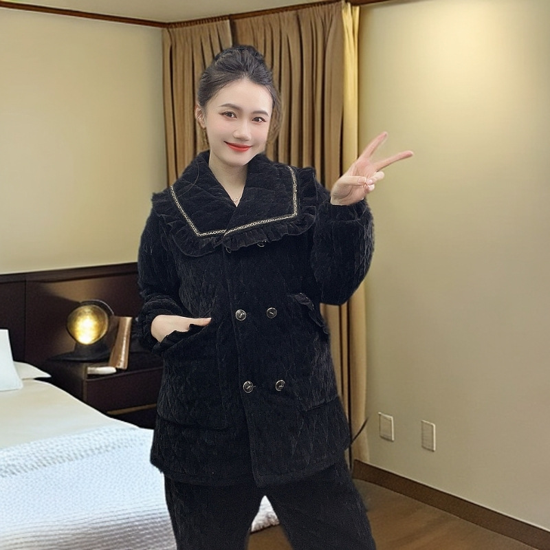 플러스 사이즈 겨울 따뜻한 가정 의류 세트 잠옷 뚱뚱한 여자를위한 여성 겨울 벨벳 원단 플러스 벨벳 두꺼운 잠옷 세트