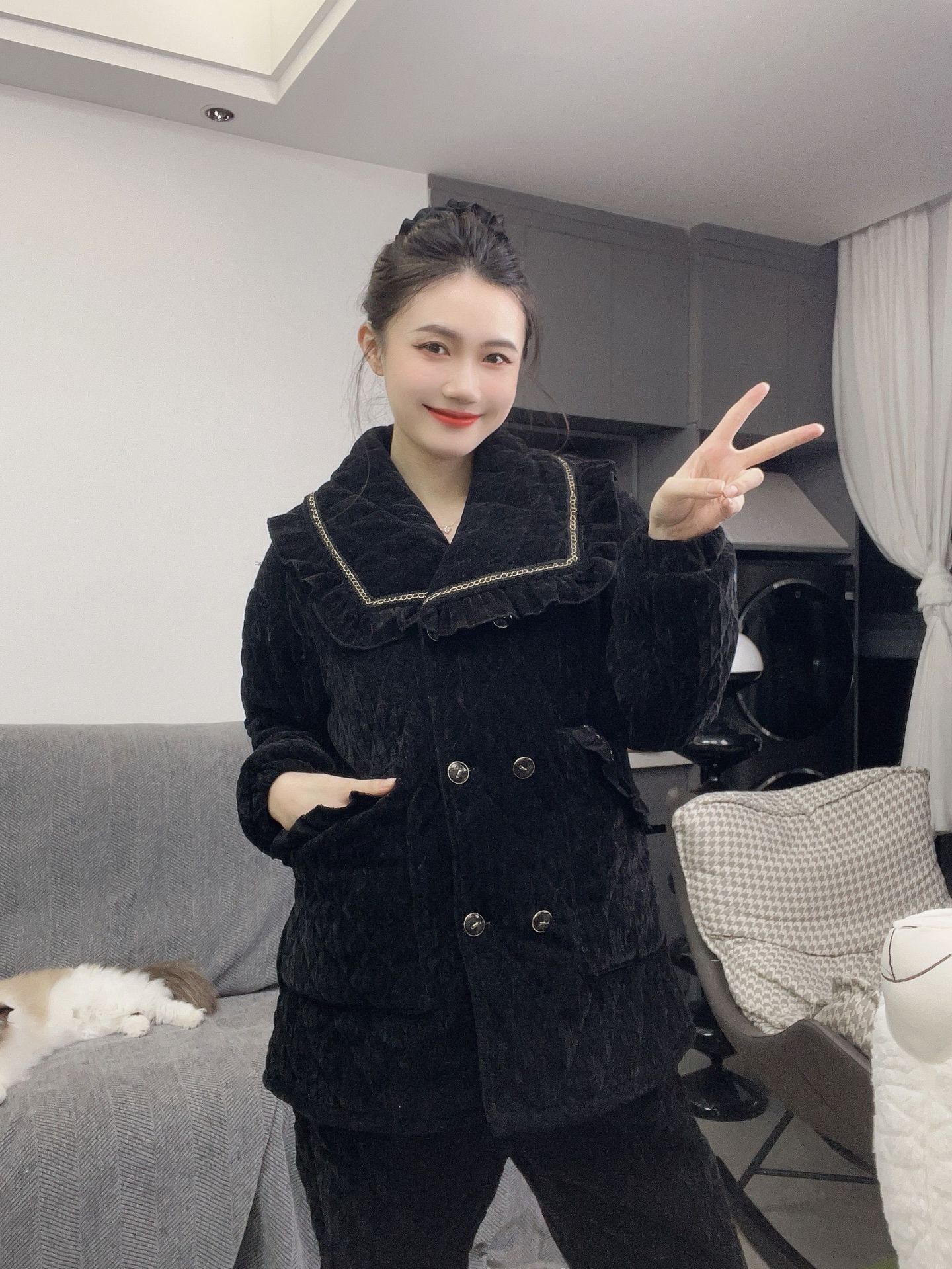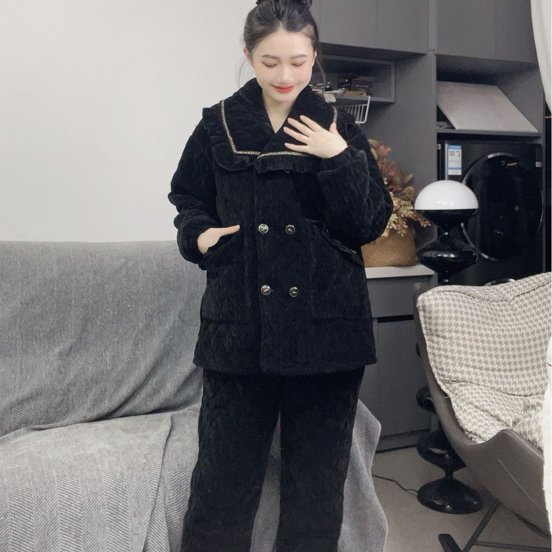 플러스 사이즈 겨울 따뜻한 가정 의류 세트 잠옷 뚱뚱한 여자를위한 여성 겨울 벨벳 원단 플러스 벨벳 두꺼운 잠옷 세트스토어 가기