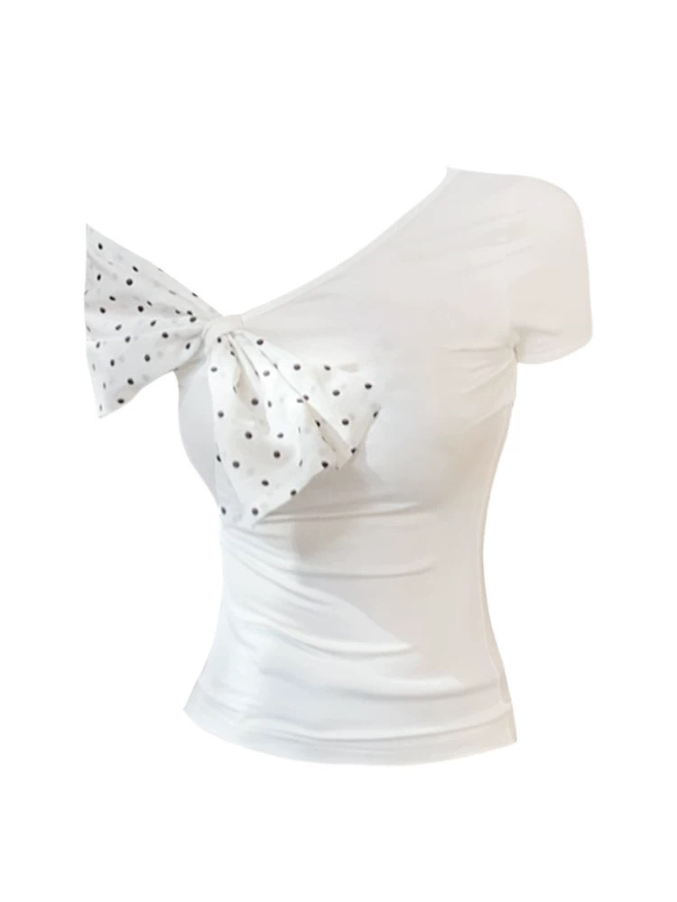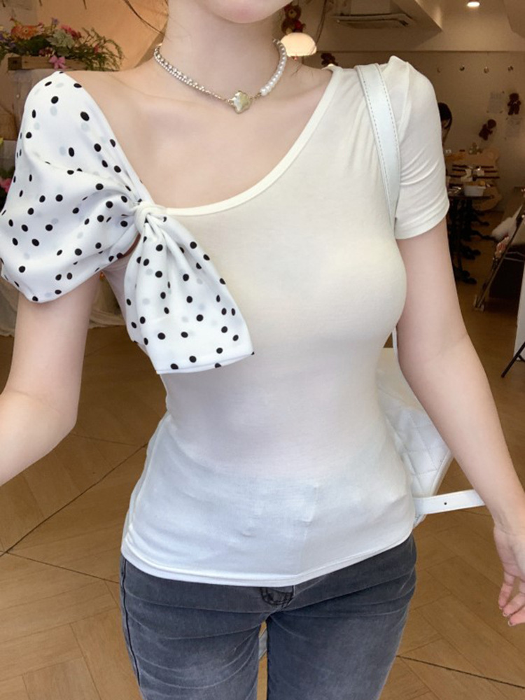 사우스 프렌치 화이트 재스민 도트 스티칭 활 디자인 어깨 티셔츠 여성용 여름 순수한 욕망 슬림 핏 반팔 탑