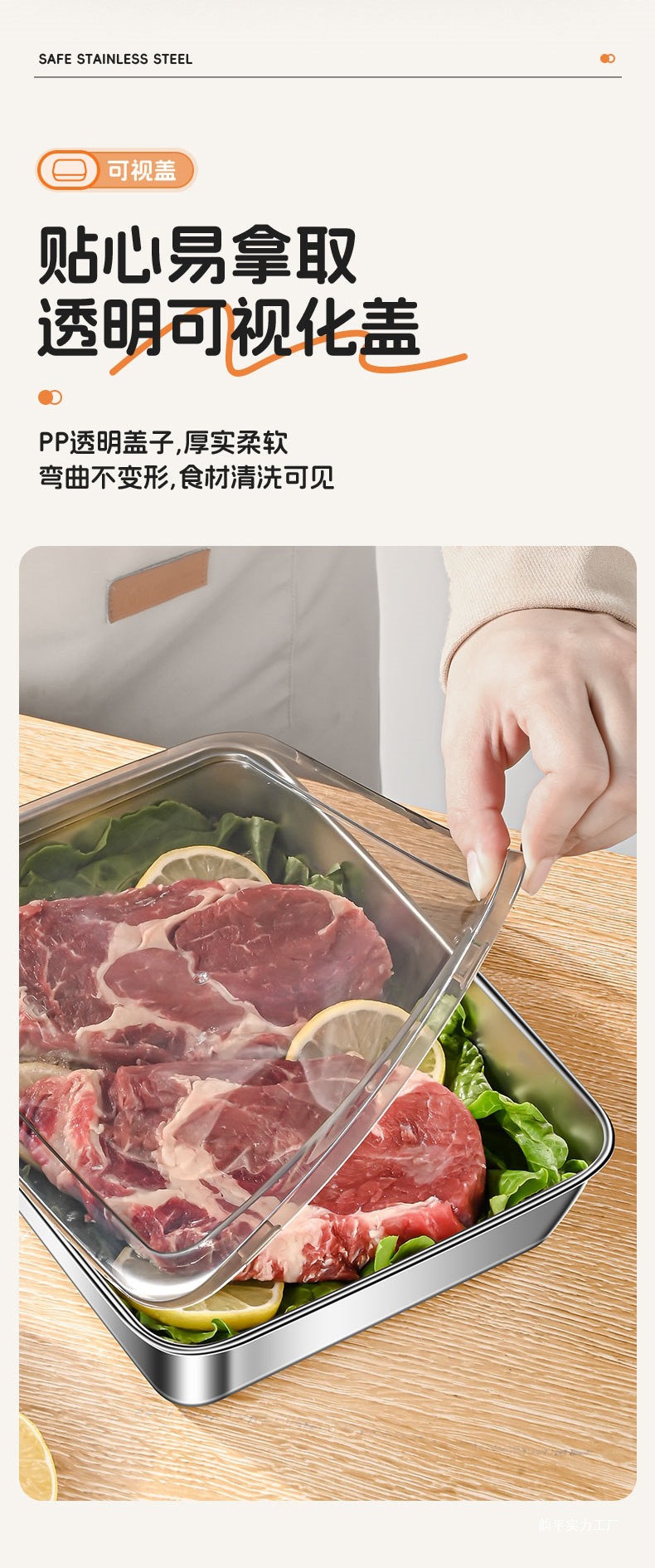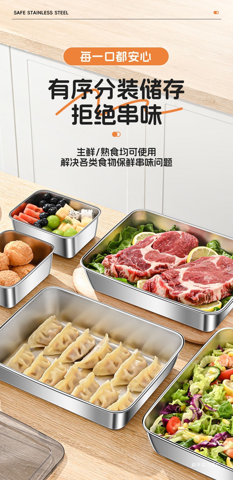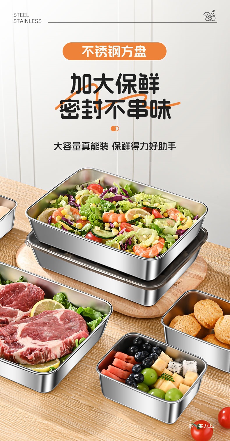 304 스테인레스 스틸 신선한 보관 상자 사각형 접시 냉장고 보관 상자 뚜껑 바베큐 요리 과일 접시 찐 생선 구이 접시
