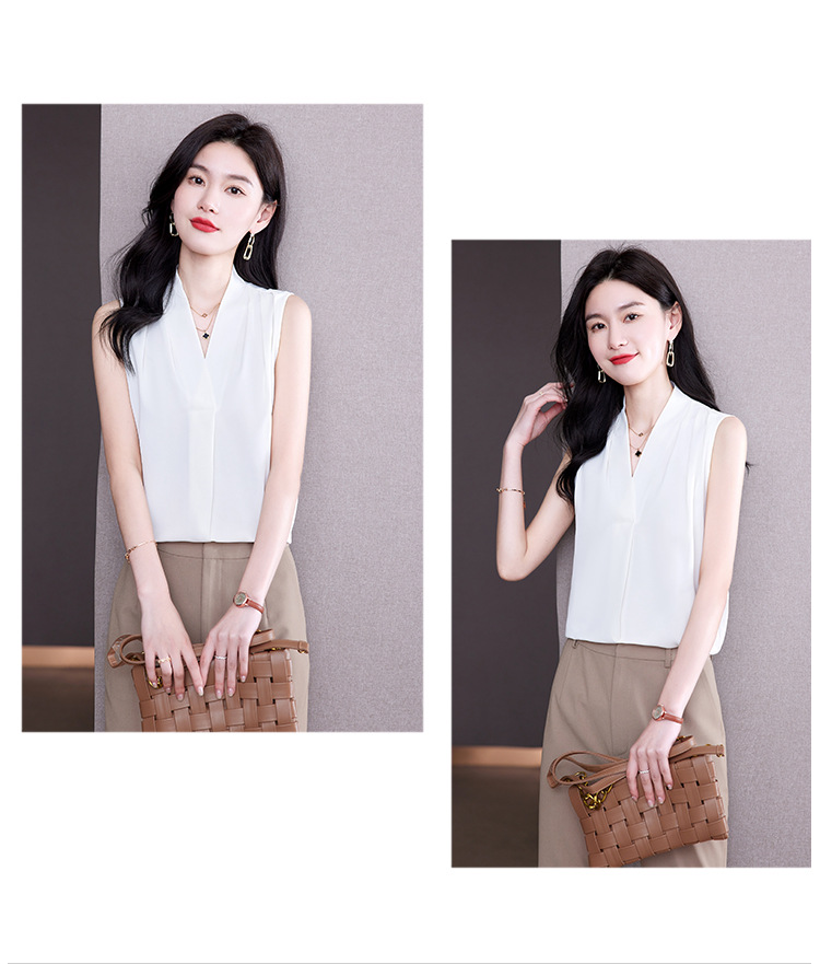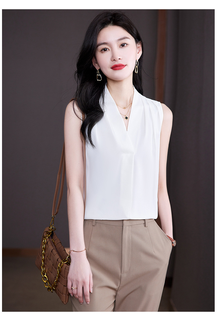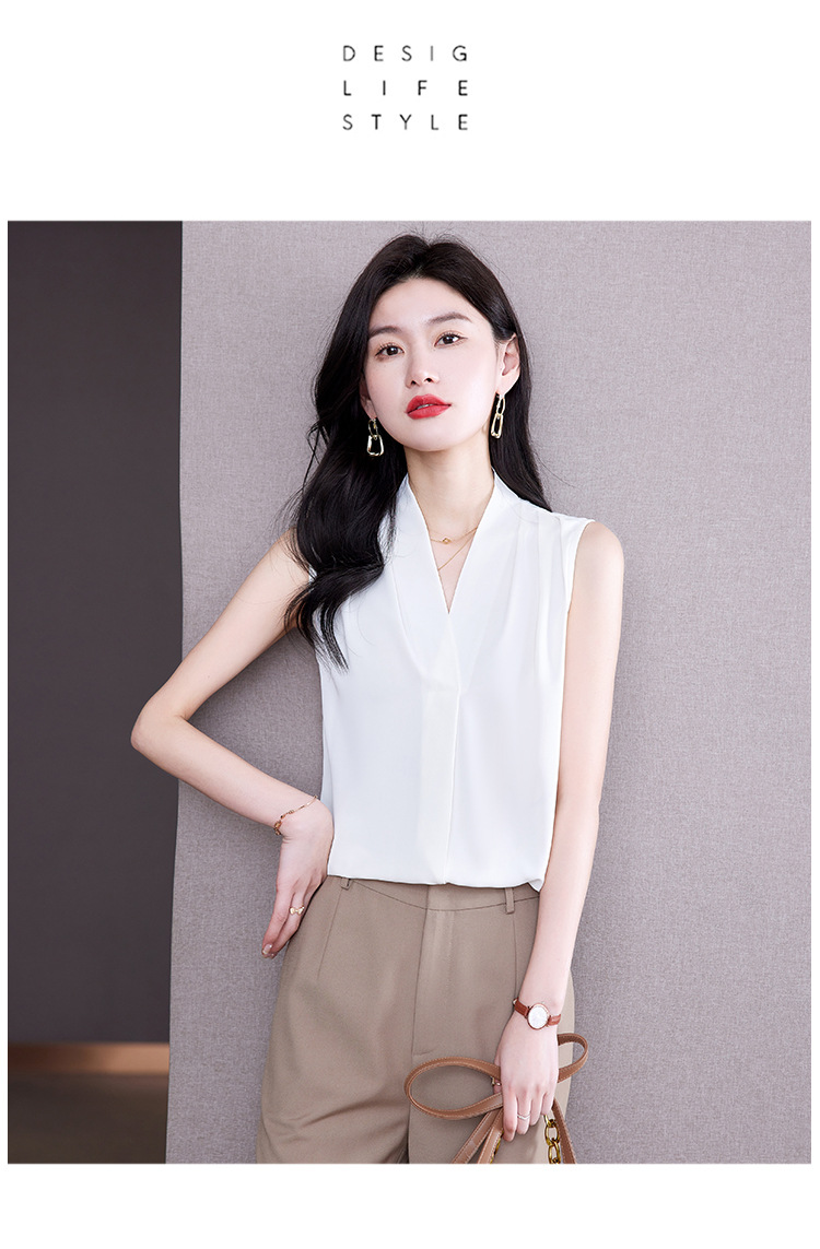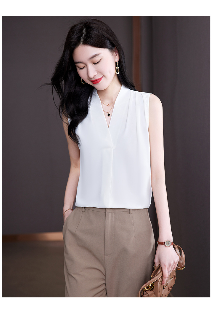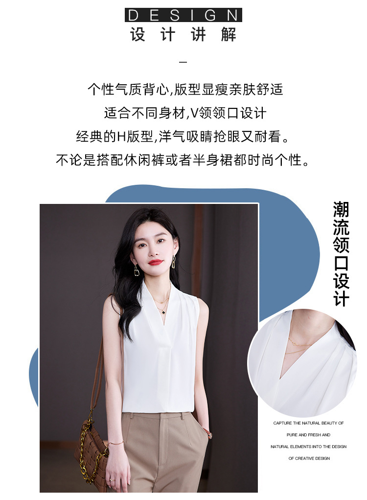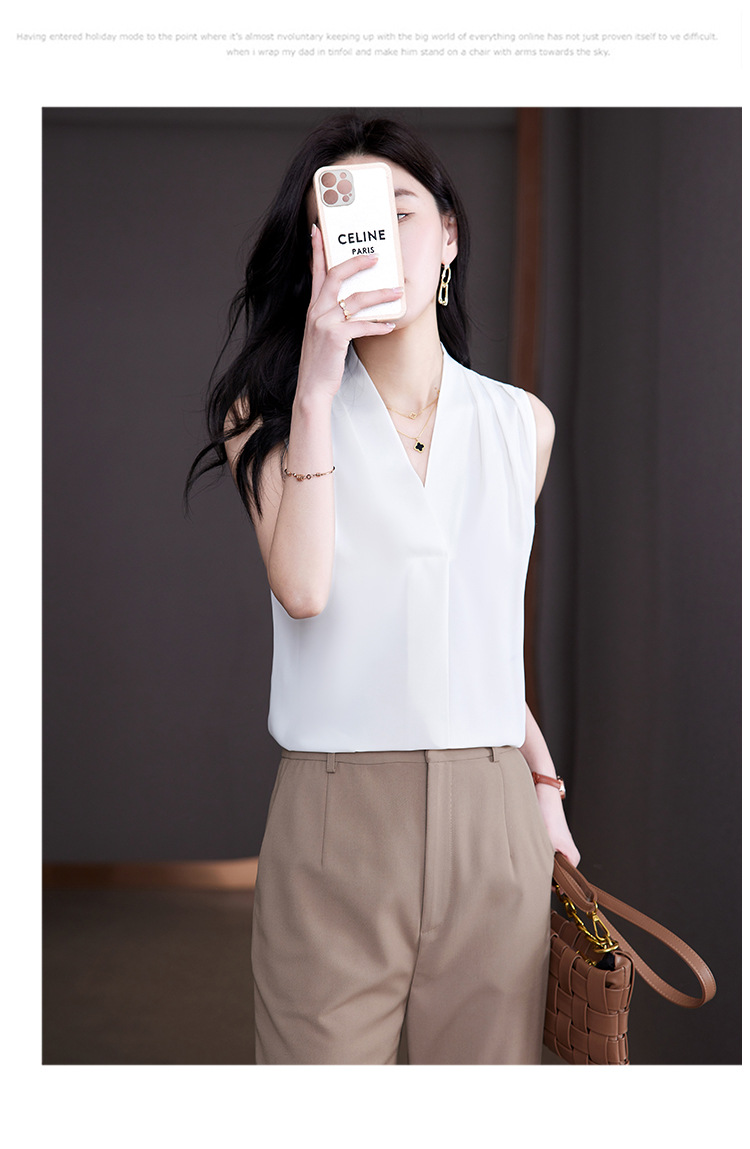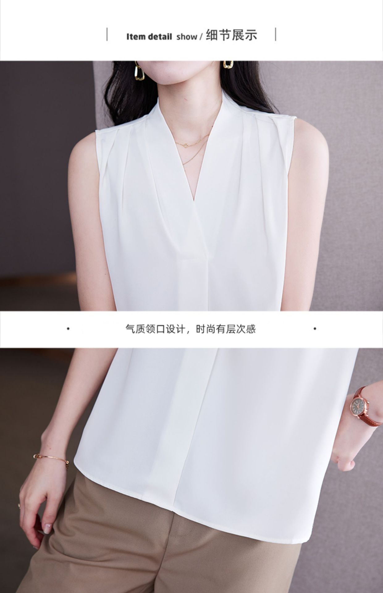 셔츠 여성 디자인 틈새 민소매 여름 얇은 흰색 셔츠 홍콩 스타일 반팔 새틴 V 넥 탑