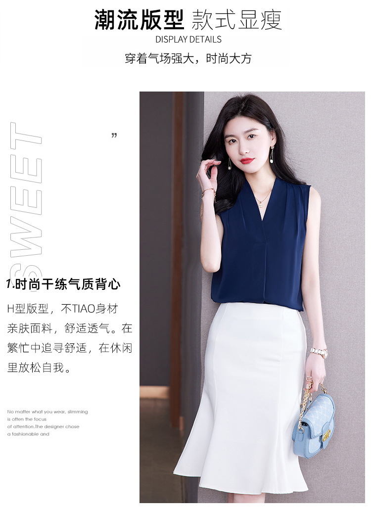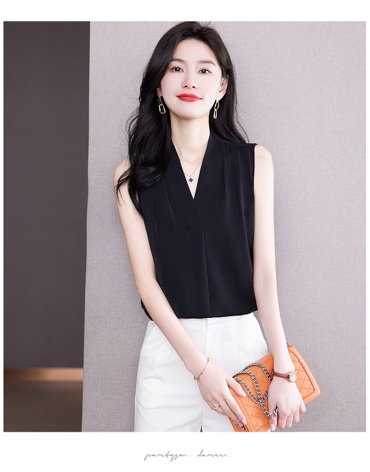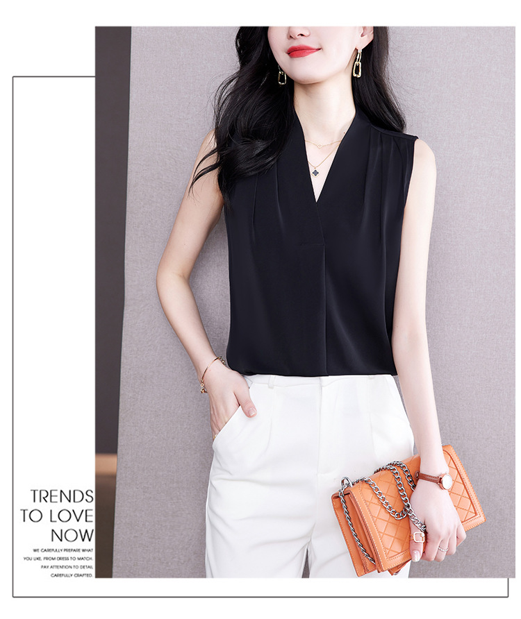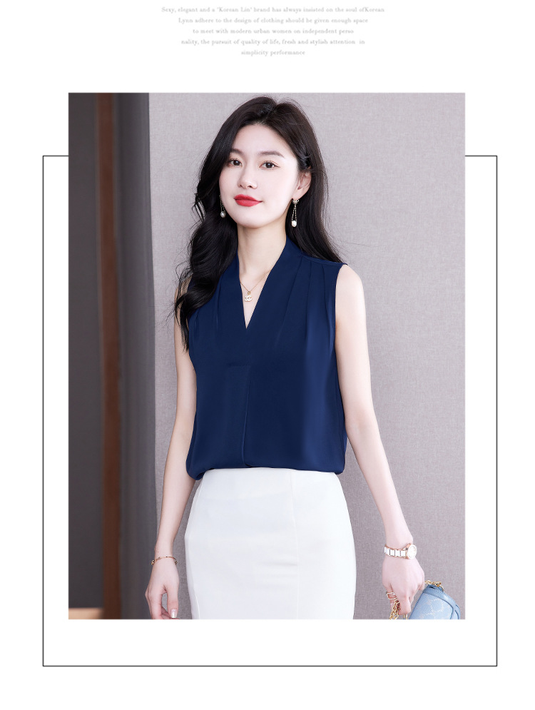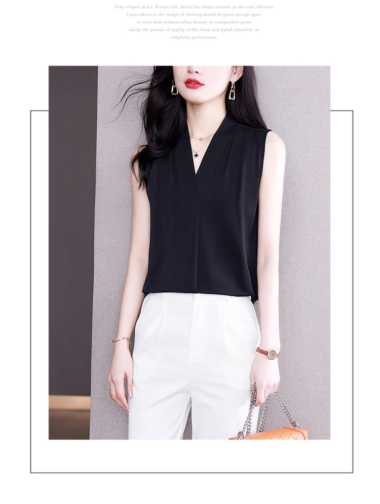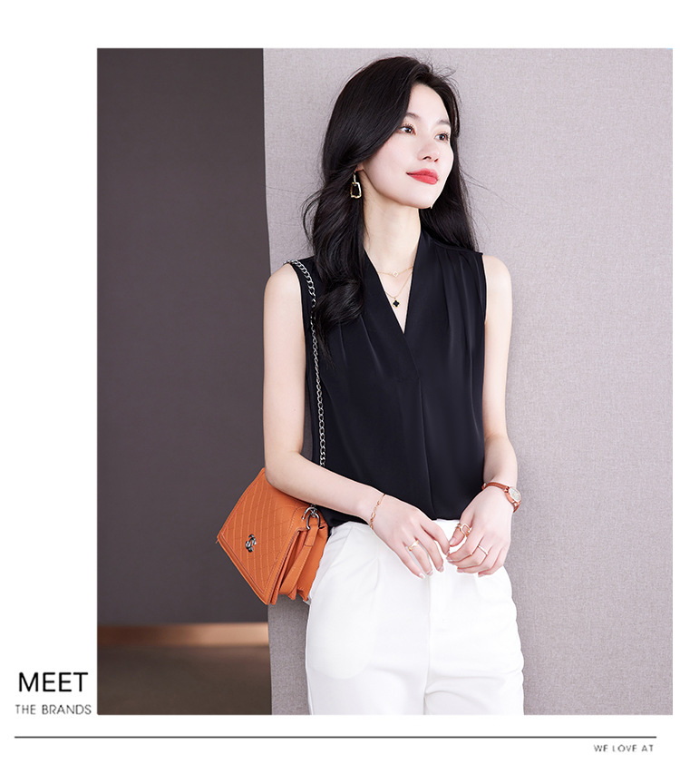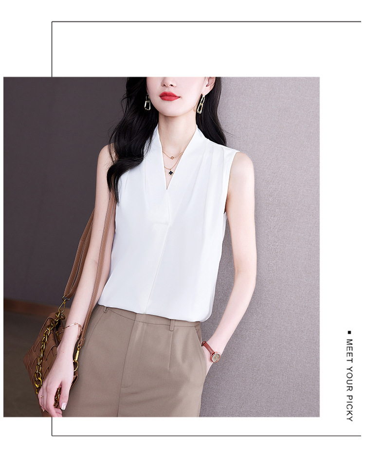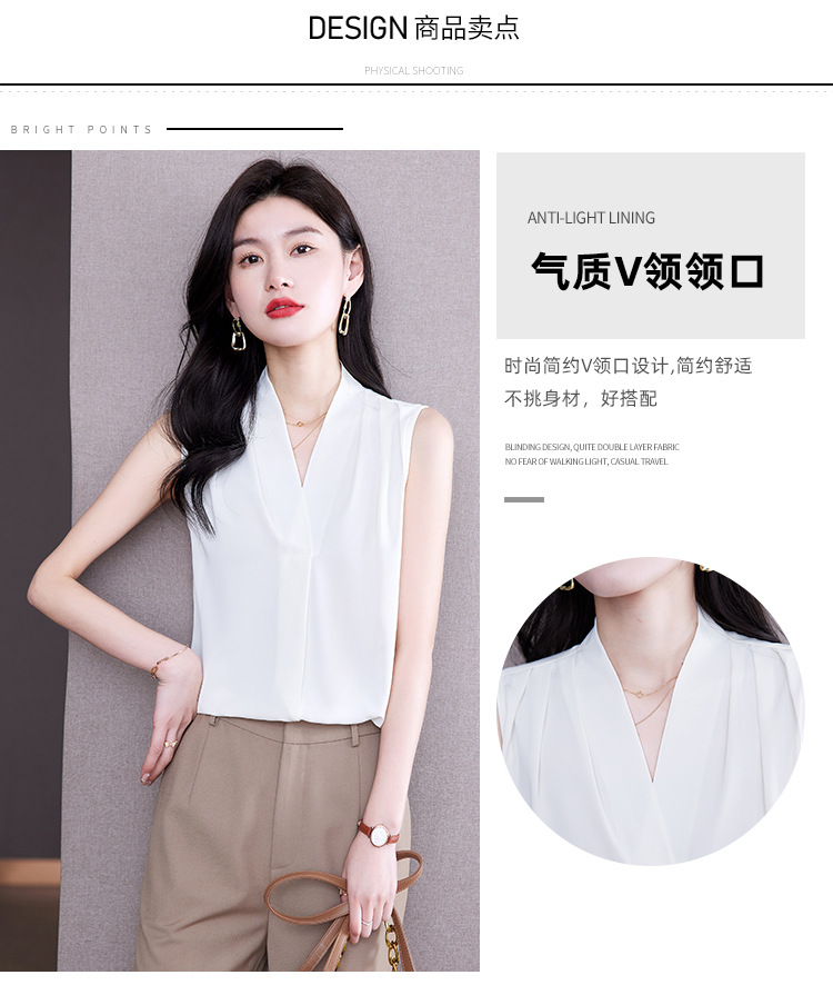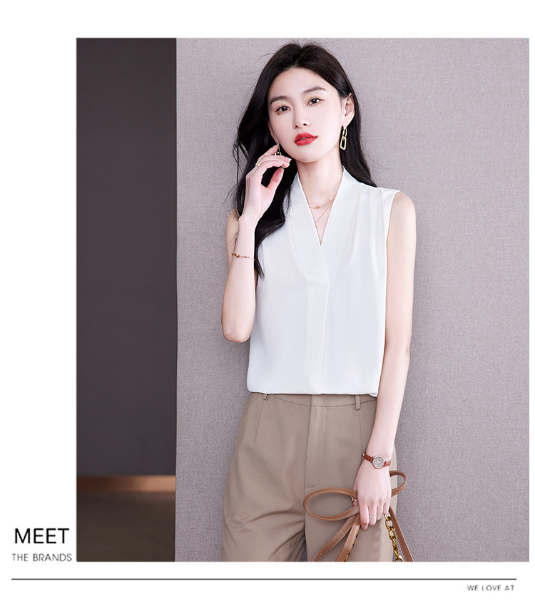 셔츠 여성 디자인 틈새 민소매 여름 얇은 흰색 셔츠 홍콩 스타일 반팔 새틴 V 넥 탑