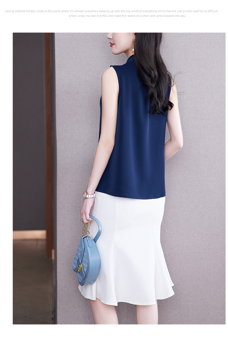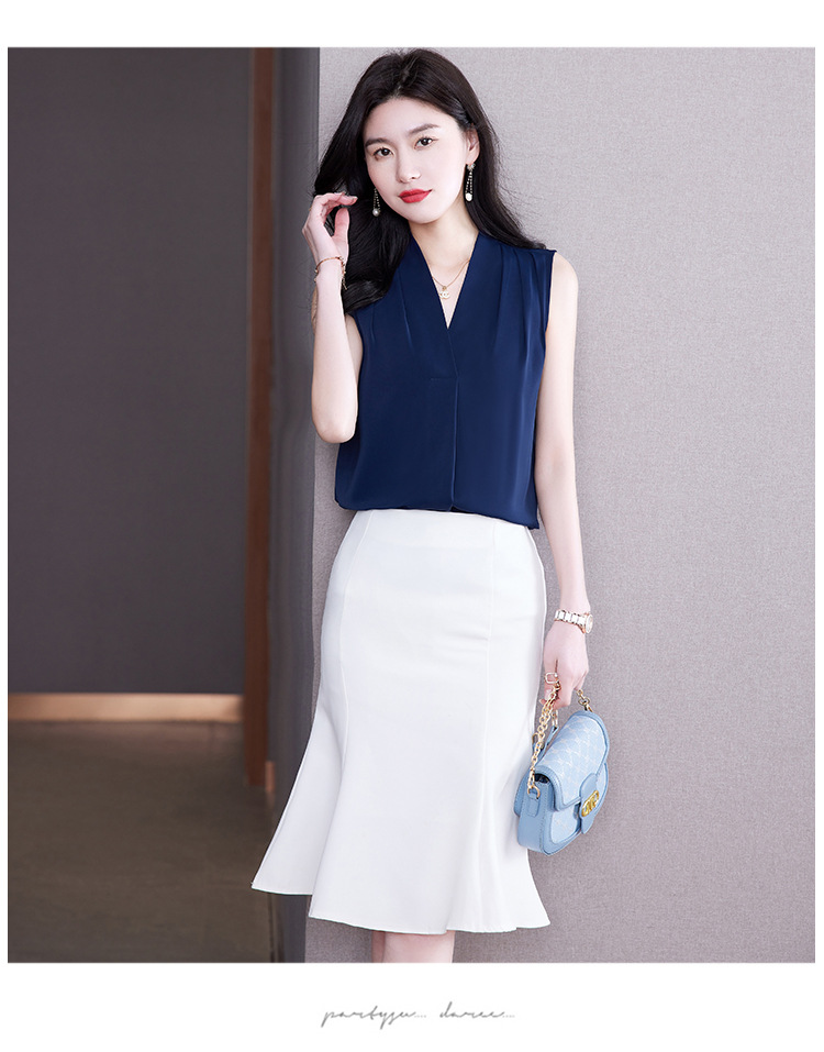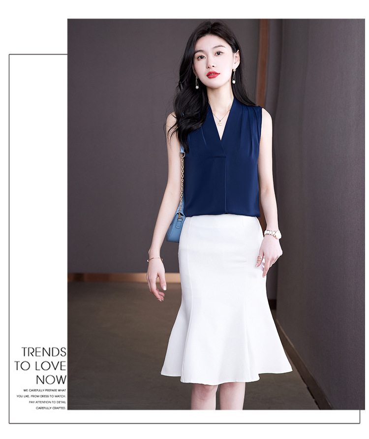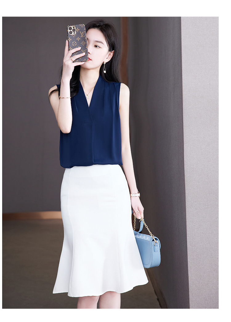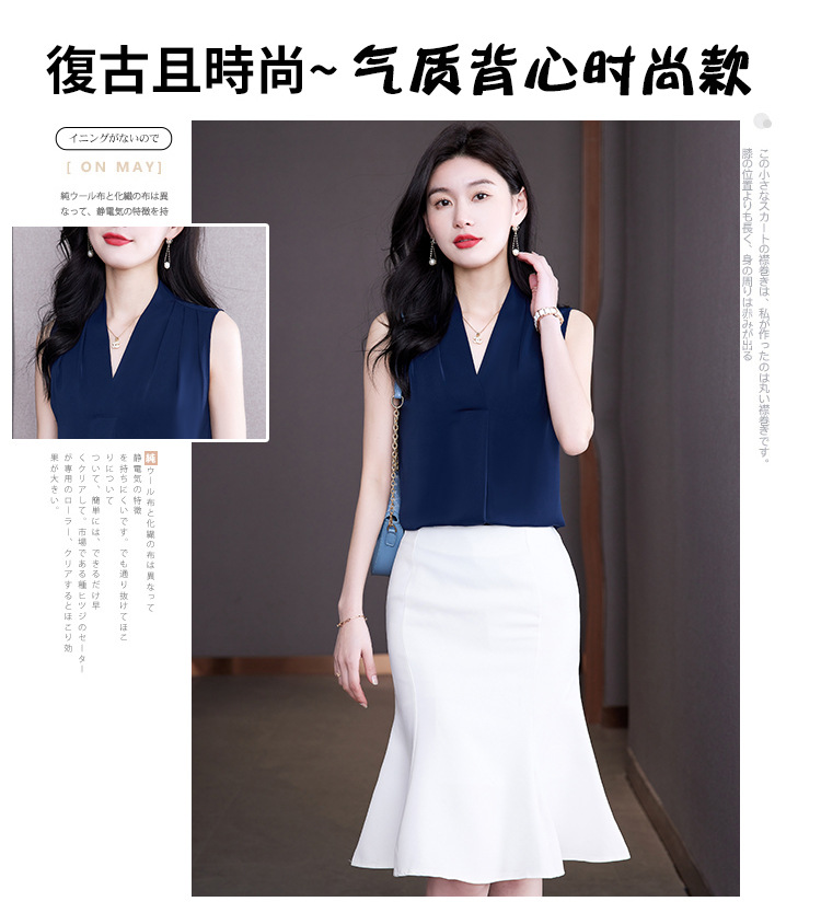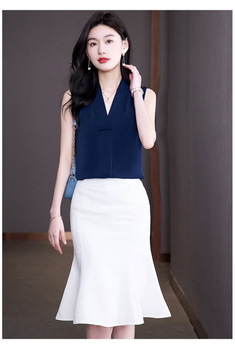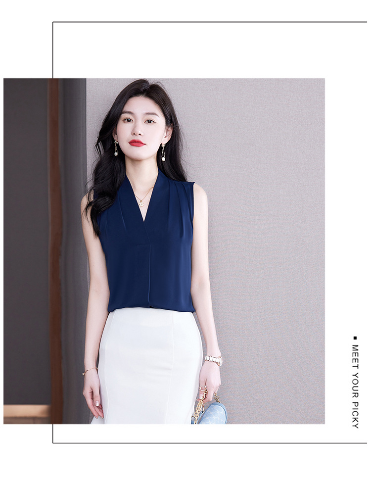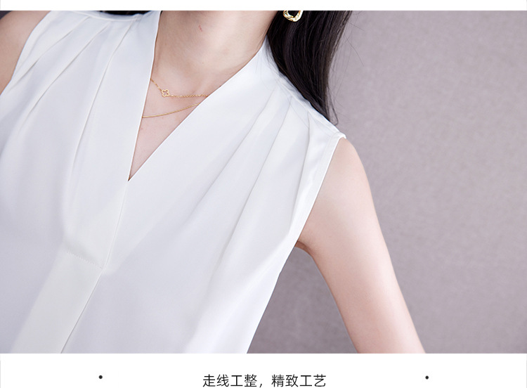 셔츠 여성 디자인 틈새 민소매 여름 얇은 흰색 셔츠 홍콩 스타일 반팔 새틴 V 넥 탑