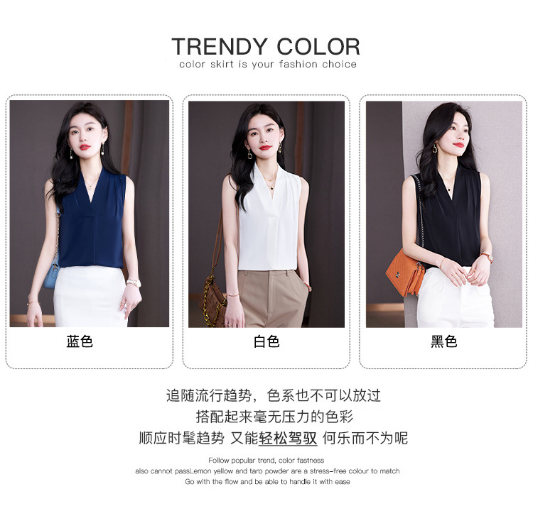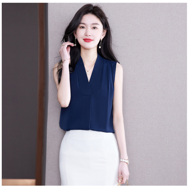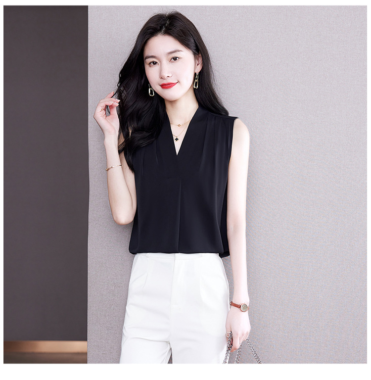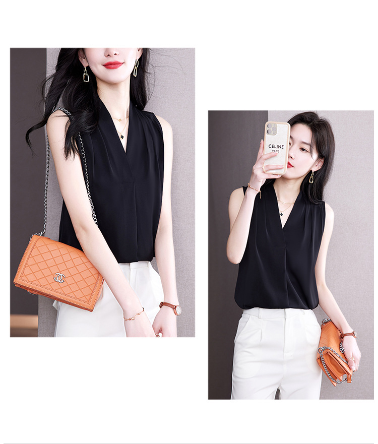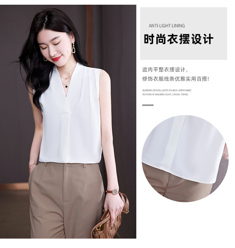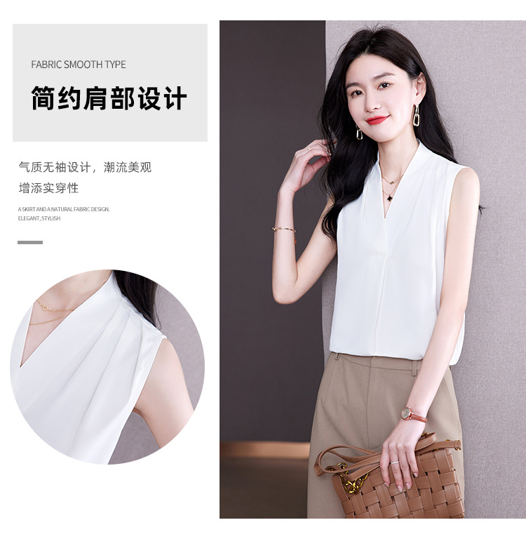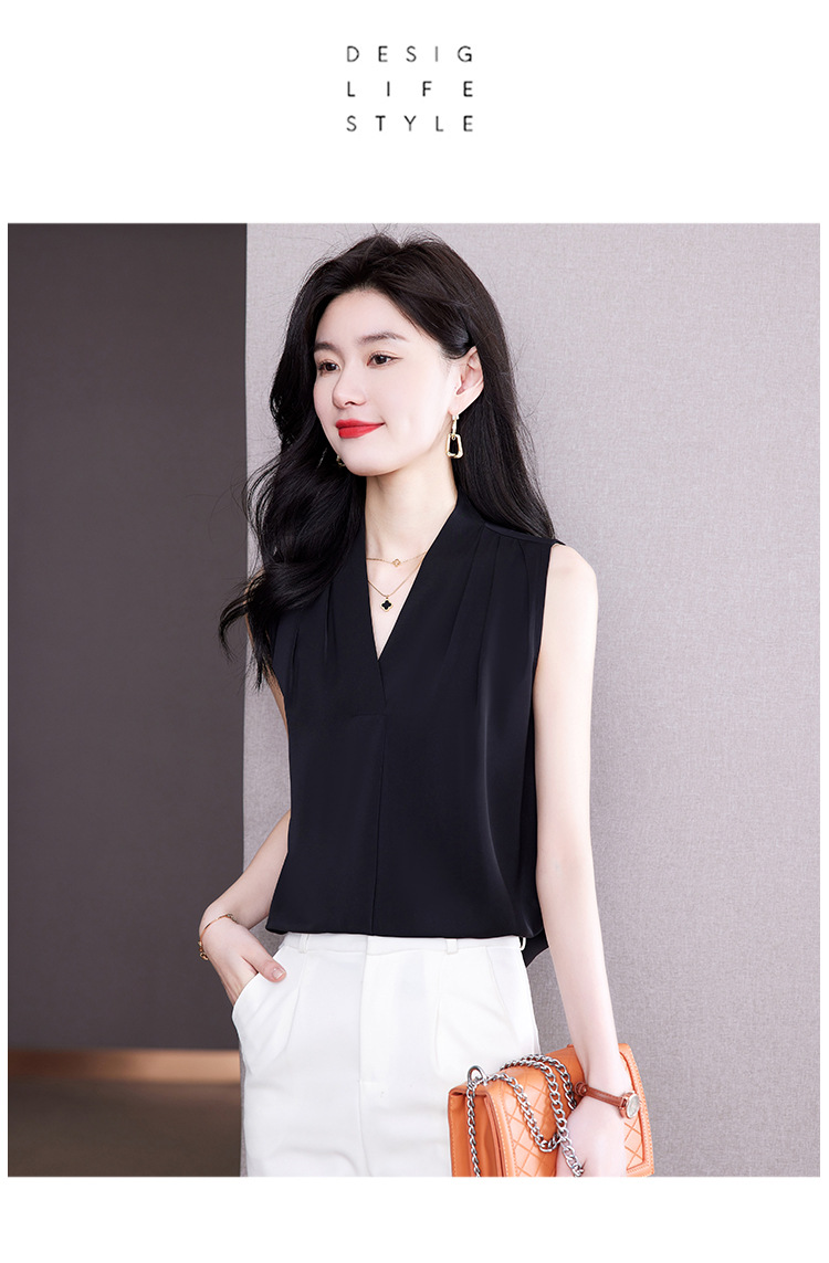 셔츠 여성 디자인 틈새 민소매 여름 얇은 흰색 셔츠 홍콩 스타일 반팔 새틴 V 넥 탑스토어 가기