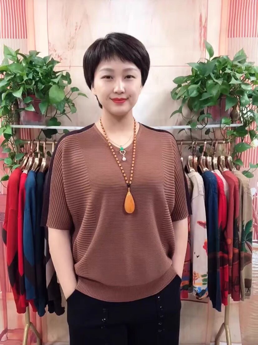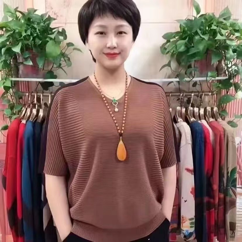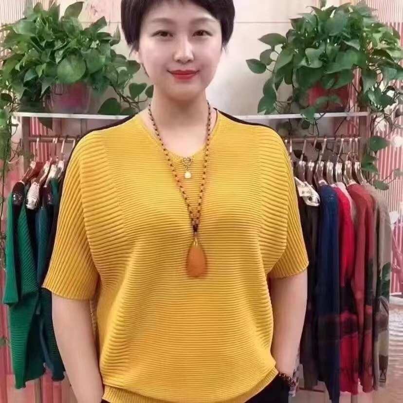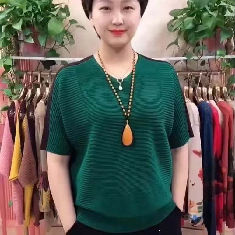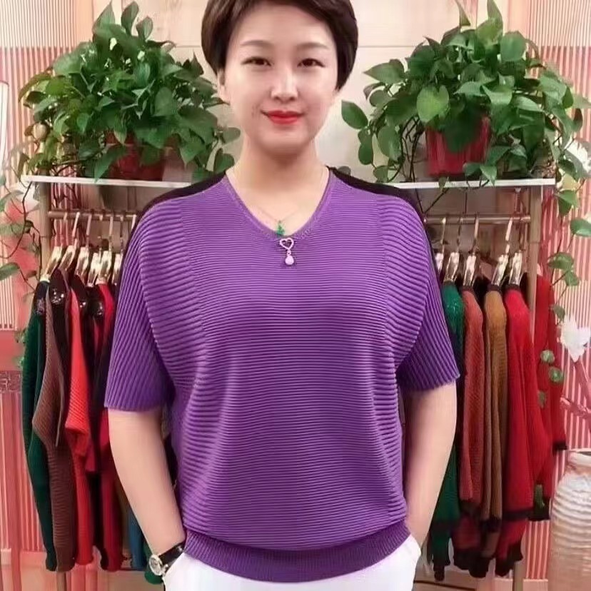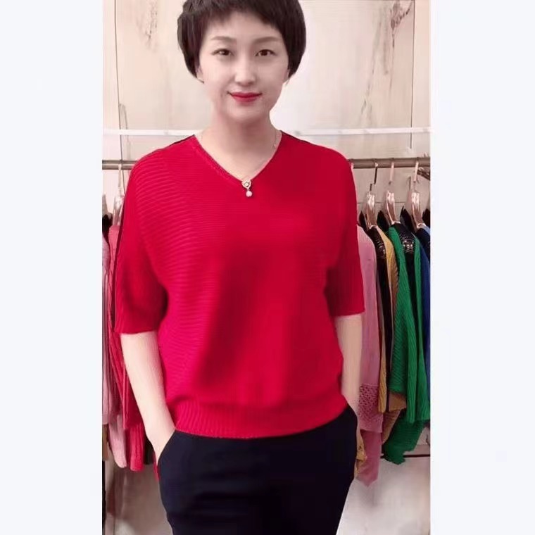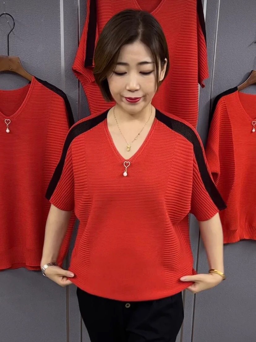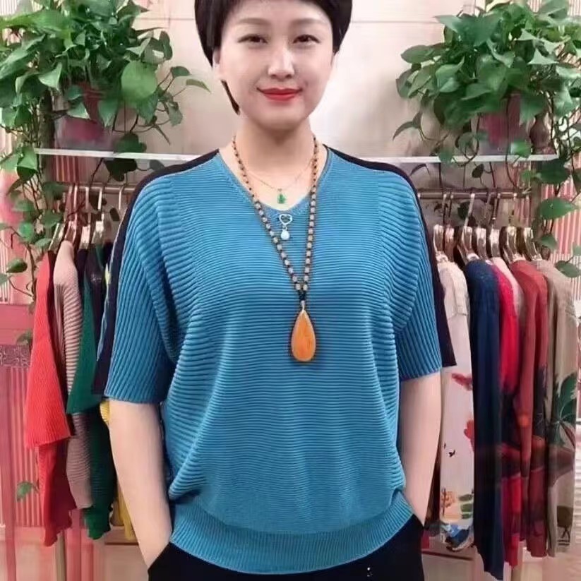동남아시아 인기 여름 브이넥 5부소매 배트셔츠 여성 캐주얼 슬리밍 컬러 블록 외국 스타일 복고풍 니트 티셔츠 여성용스토어 가기