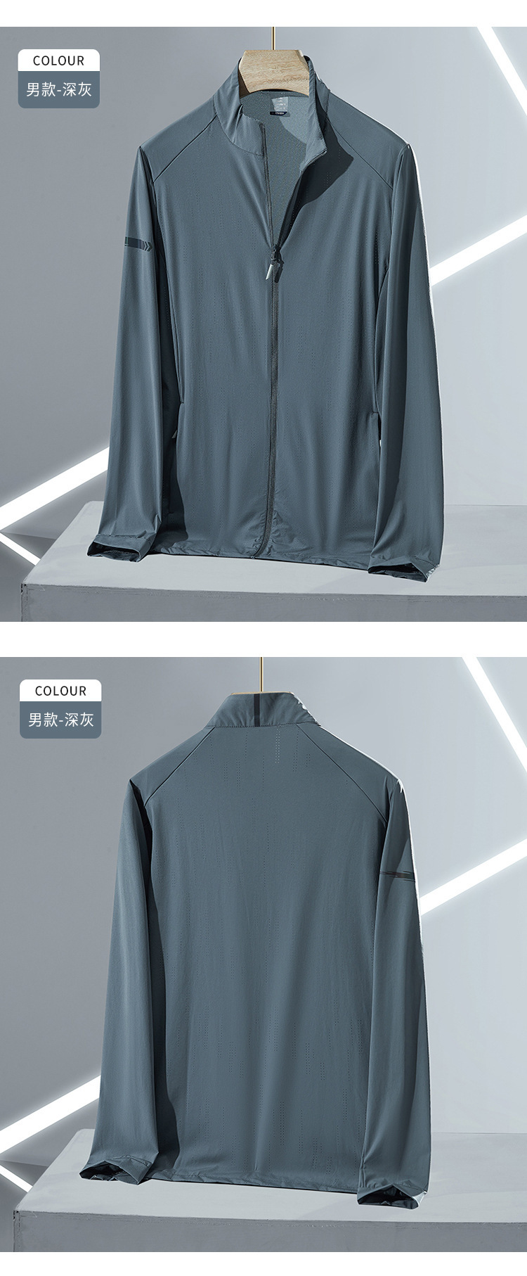 봄과 여름 피부 의류 남성 스탠드 칼라 얼음 실크 태양 보호 의류 탄성 양산 산 스타일 야외 사이클링 낚시 의류 유행 UPF40 +