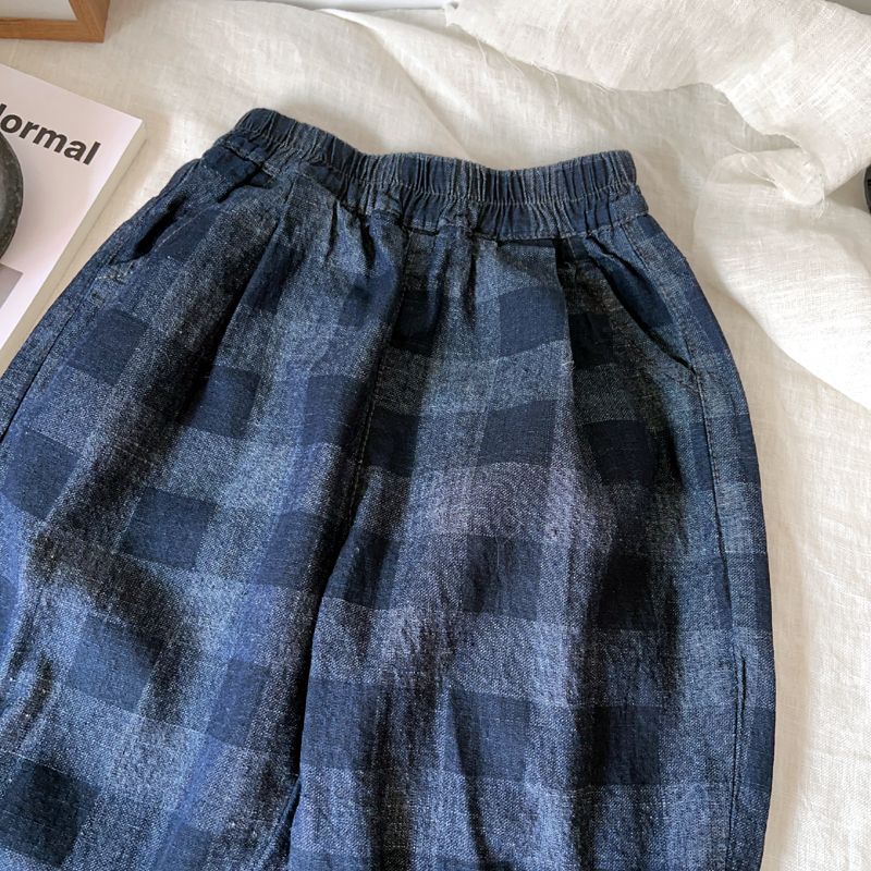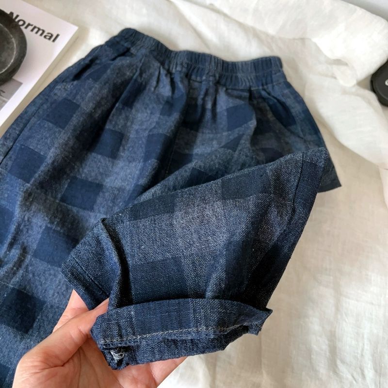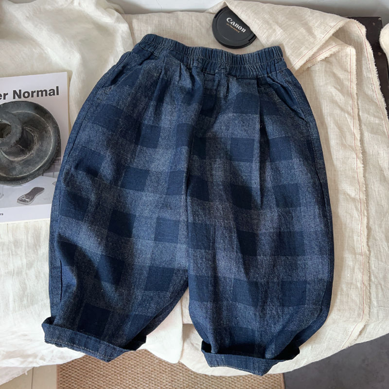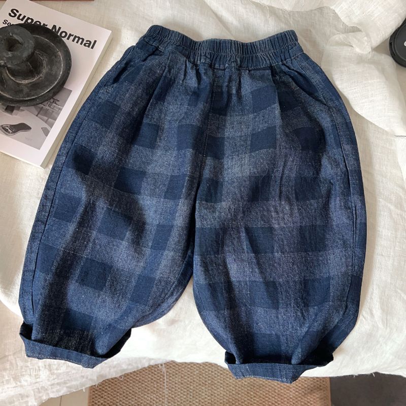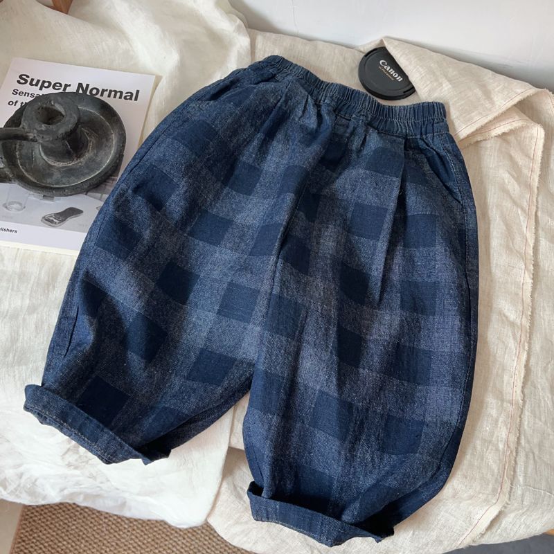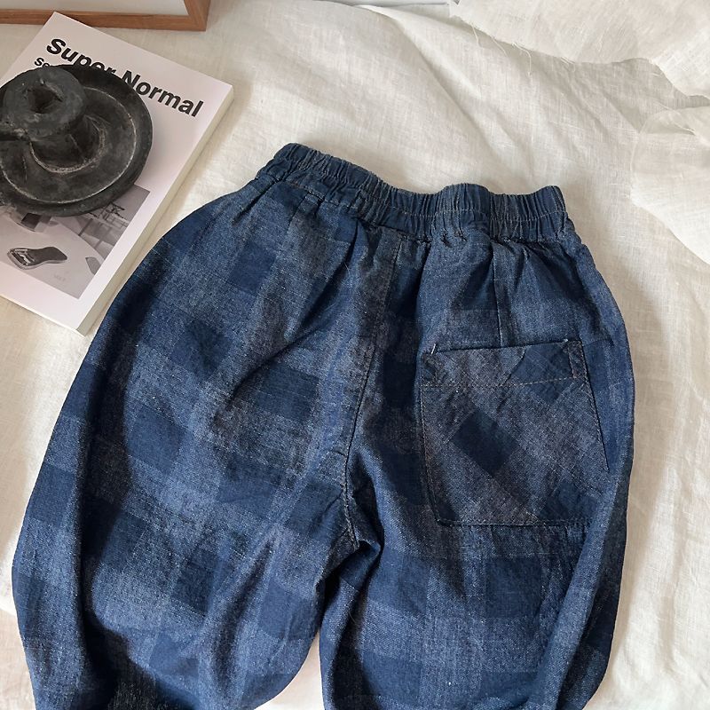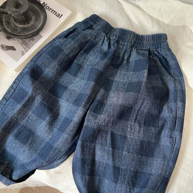 데님 블루 ~ 코튼 앤 리넨 ~ 남학생과 여학생을위한 한국 어린이 격자 무늬 바지 일본 캐주얼 느슨한 할란 바지 서양식스토어 가기