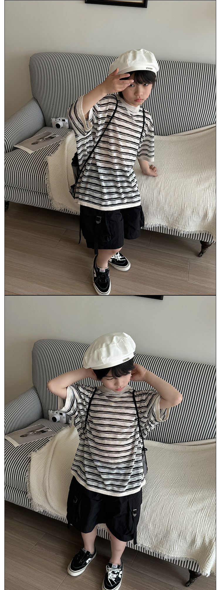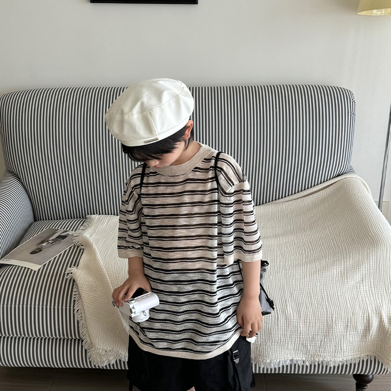이홍 의류 소년의 니트 선 스크린 반팔 블라우스 2025 여름 어린이 의류 새로운 어린이 줄무늬 에어컨 셔츠스토어 가기