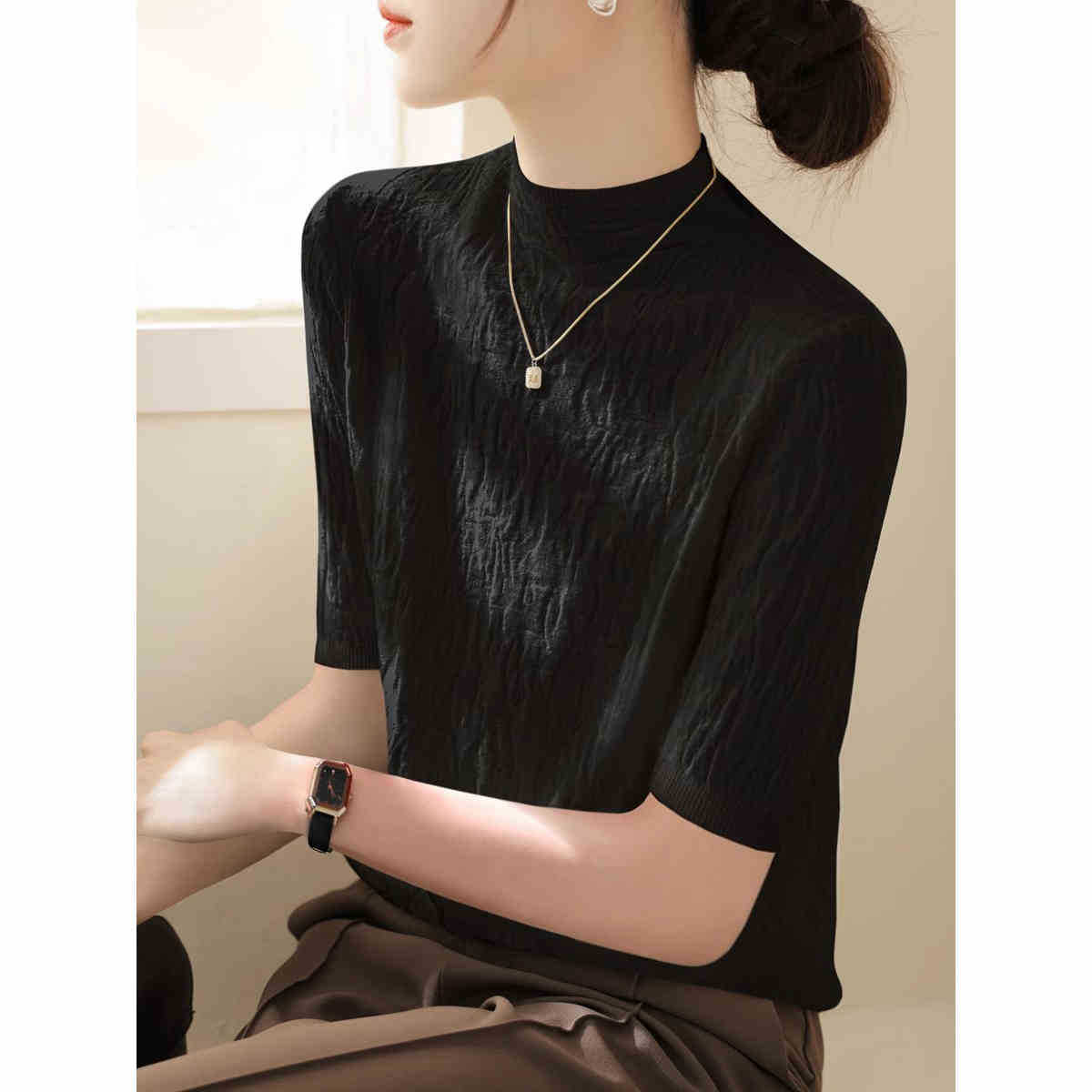 여름 2025 새로운 반 높은 목 반 소매 내부 니트베이스 셔츠 스웨터 여성 외부 착용 탑 짧은 소매 티셔츠스토어 가기