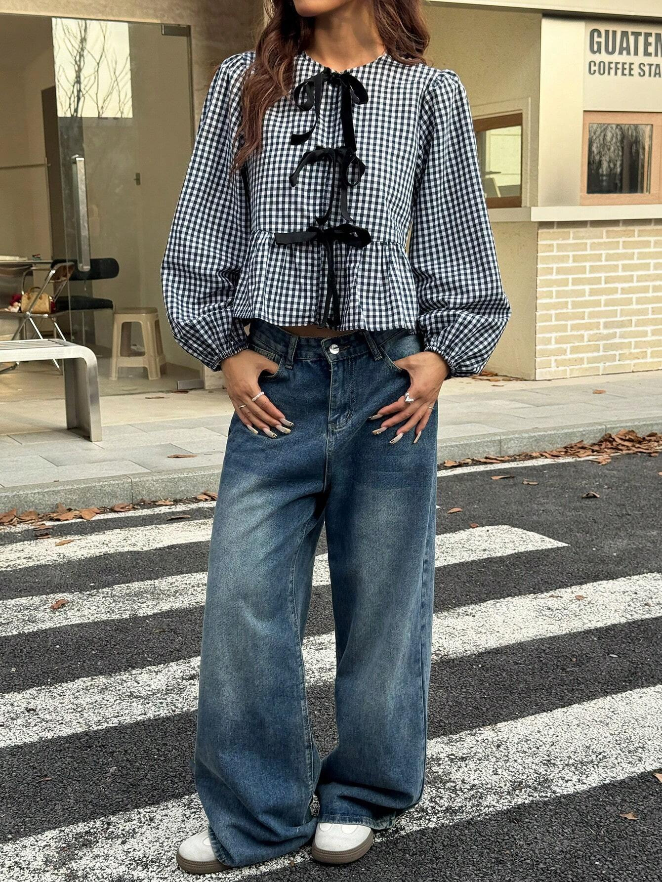 2025 여성 복고풍 현대 흑백 격자 무늬 푹신한 긴 소매 느슨한 셔츠 느슨한 버전 패션 기질스토어 가기