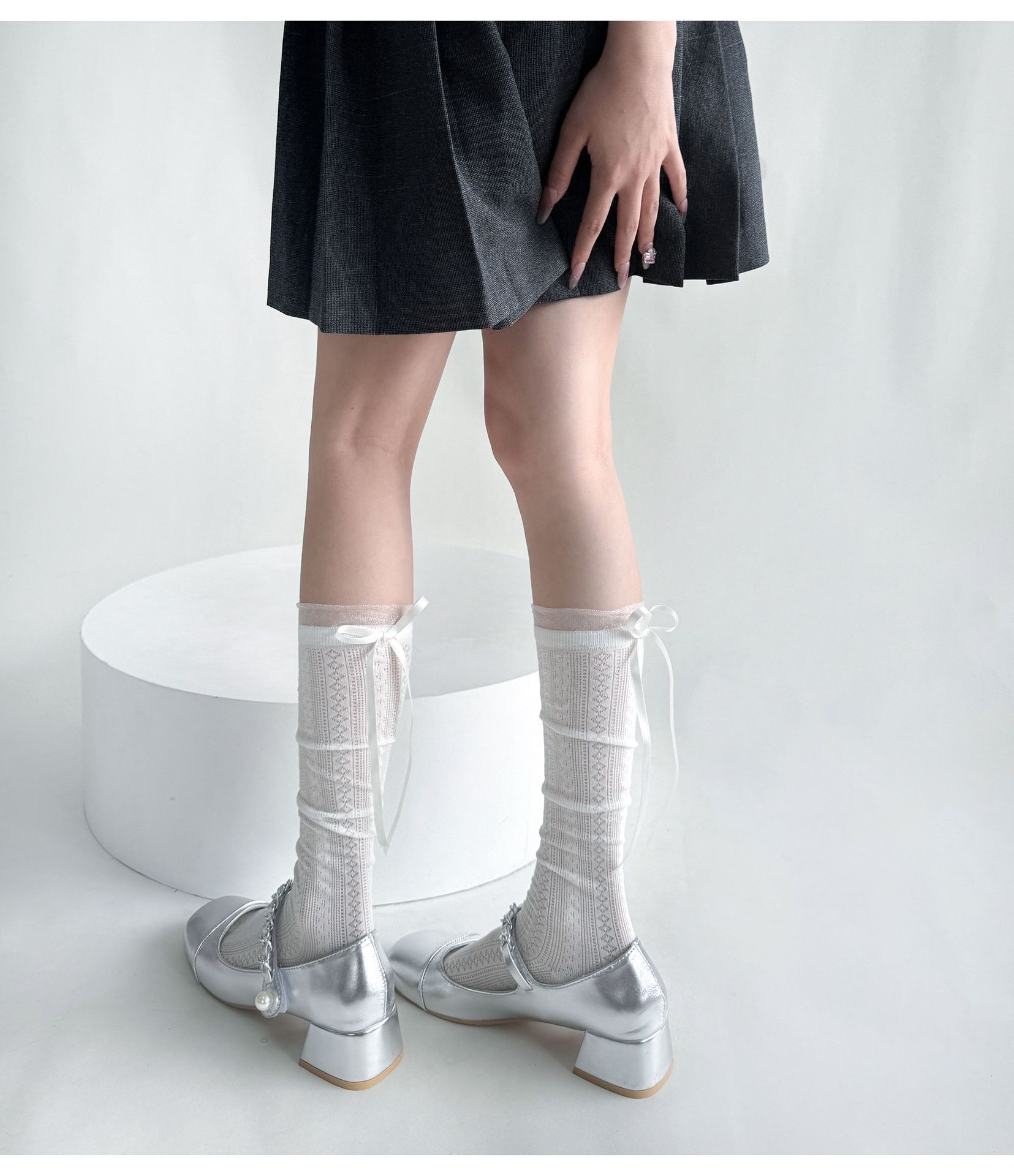 여름 얇은 일본 할로우 통기성 메쉬 힙 스택 솔리드 컬러 올 매치 힐 리본 밀크 화이트 미드 송아지 양말