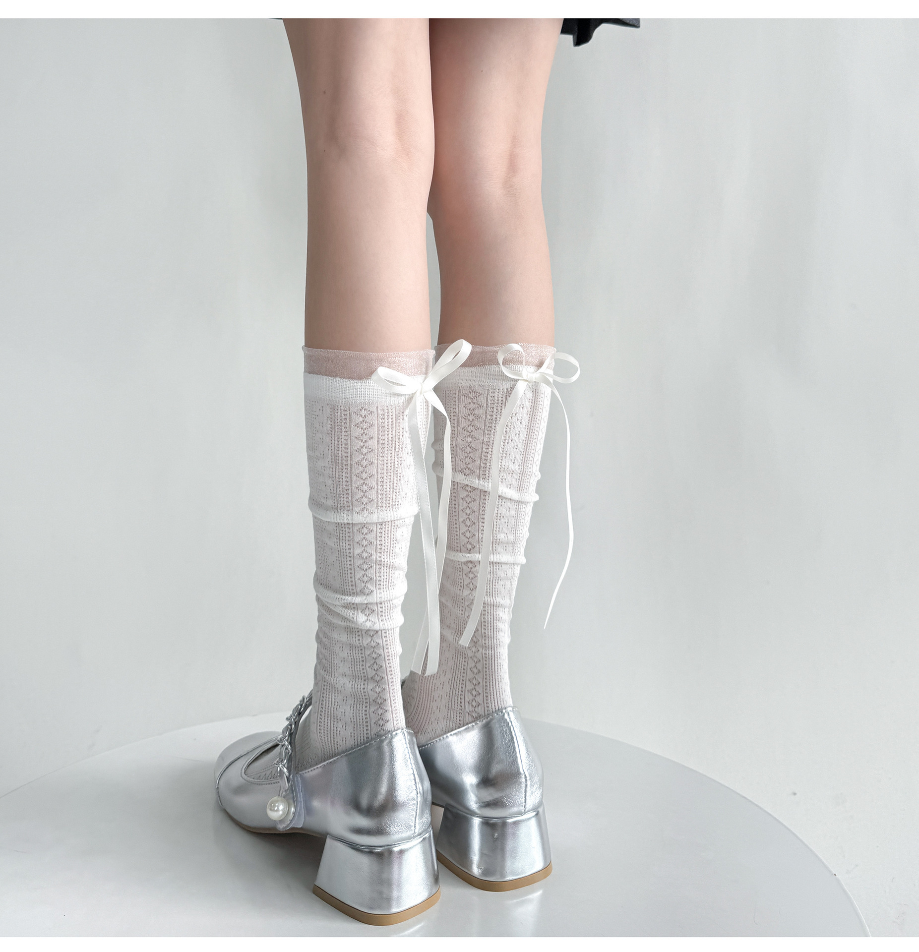 여름 얇은 일본 할로우 통기성 메쉬 힙 스택 솔리드 컬러 올 매치 힐 리본 밀크 화이트 미드 송아지 양말스토어 가기