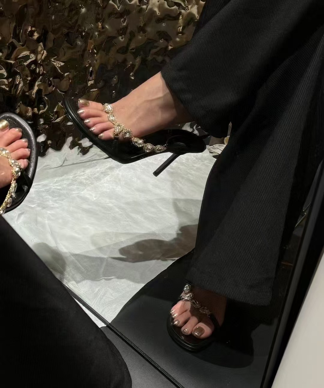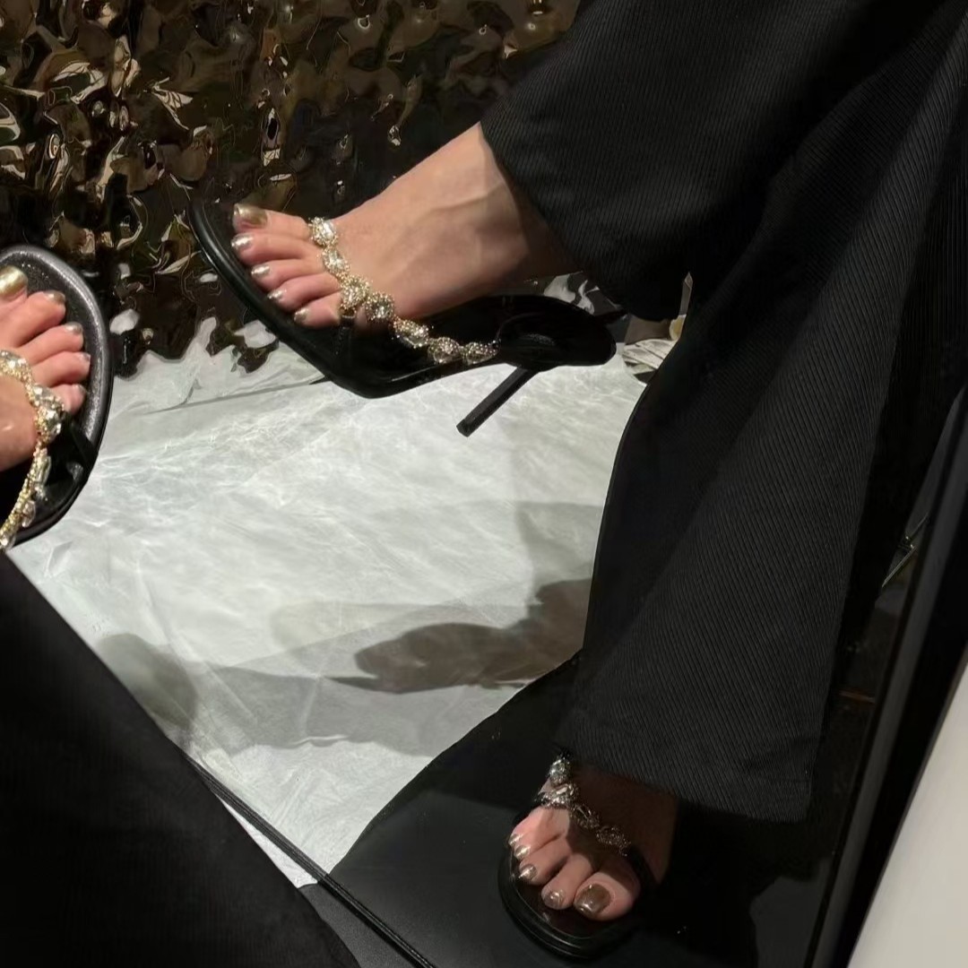 여성용 슬림 힐 샌들 2025 이른 봄 새로운 오픈 토 라인스톤 섹시한 연예인 골드 백 스트랩 하이힐