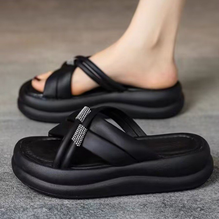 샌들과 슬리퍼 여성 여름 패션 아우터 2024 새로운 라인스톤 두꺼운 밑창 임산부 비치 샌들 하이 엔드 센스 슬라이드스토어 가기