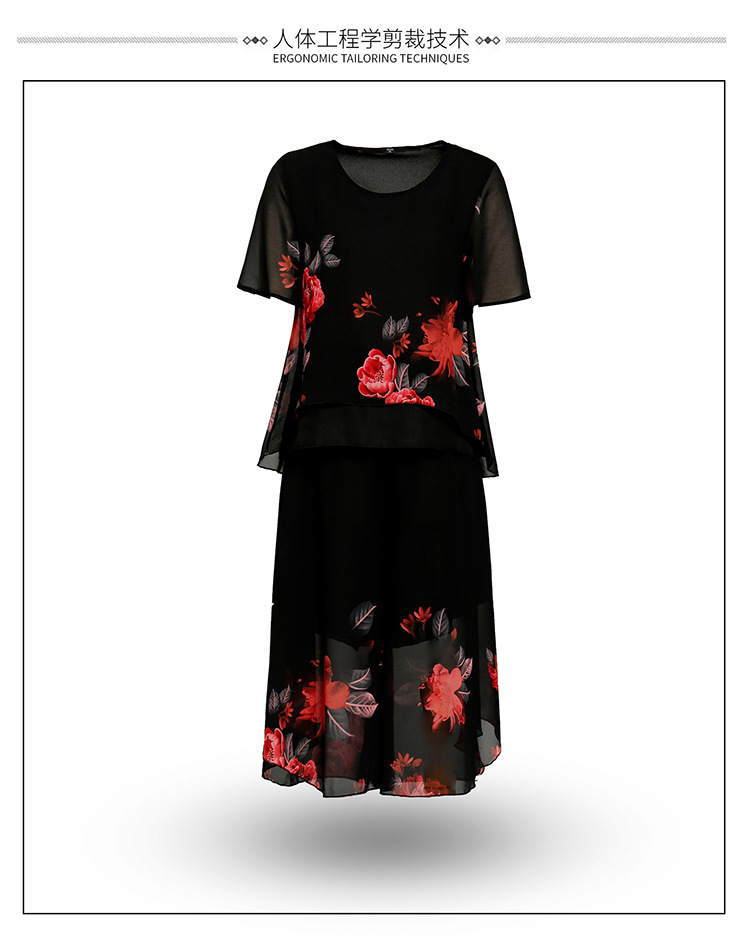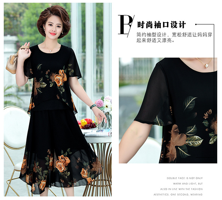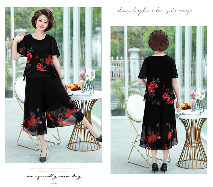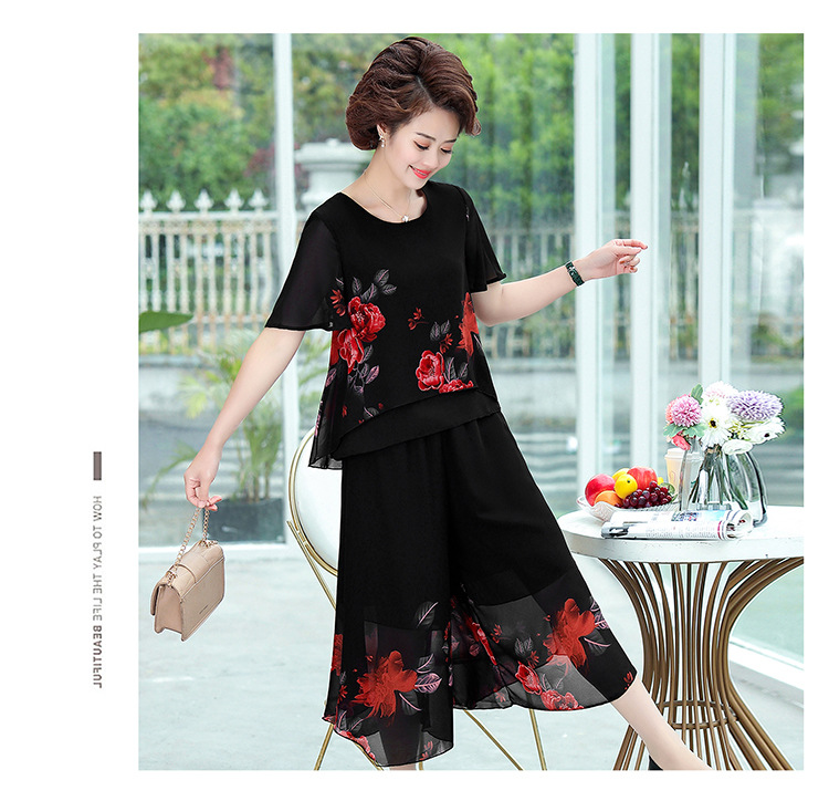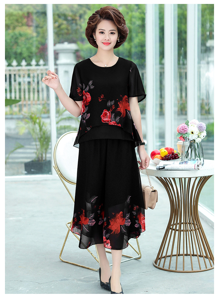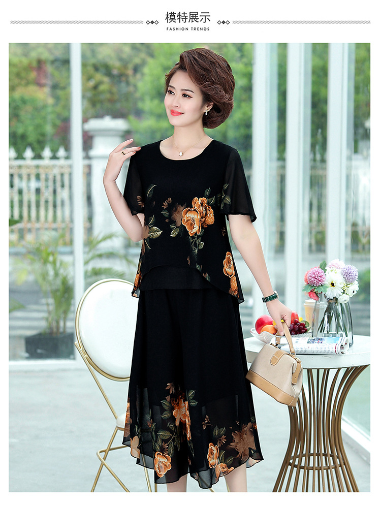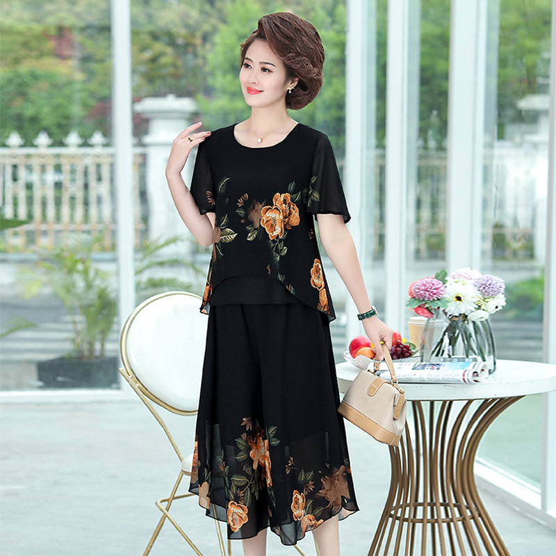 엄마 여름 스타일 정장 반팔 티셔츠 중년 여성 쉬폰 셔츠 스커트 바지 중년 및 노인 여성 투피스 세트