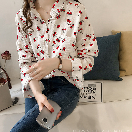 초가을 여성복 신상 긴팔 셔츠 여성 루즈핏 한국 스타일 달콤한 체리 프린트 셔츠 이너웨어 상의 초가을