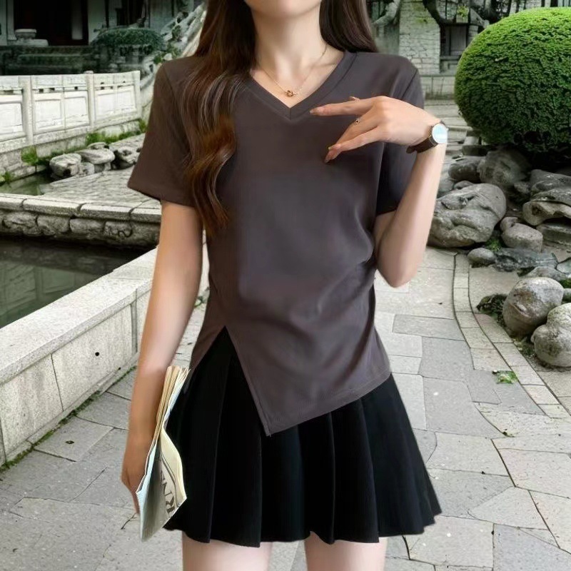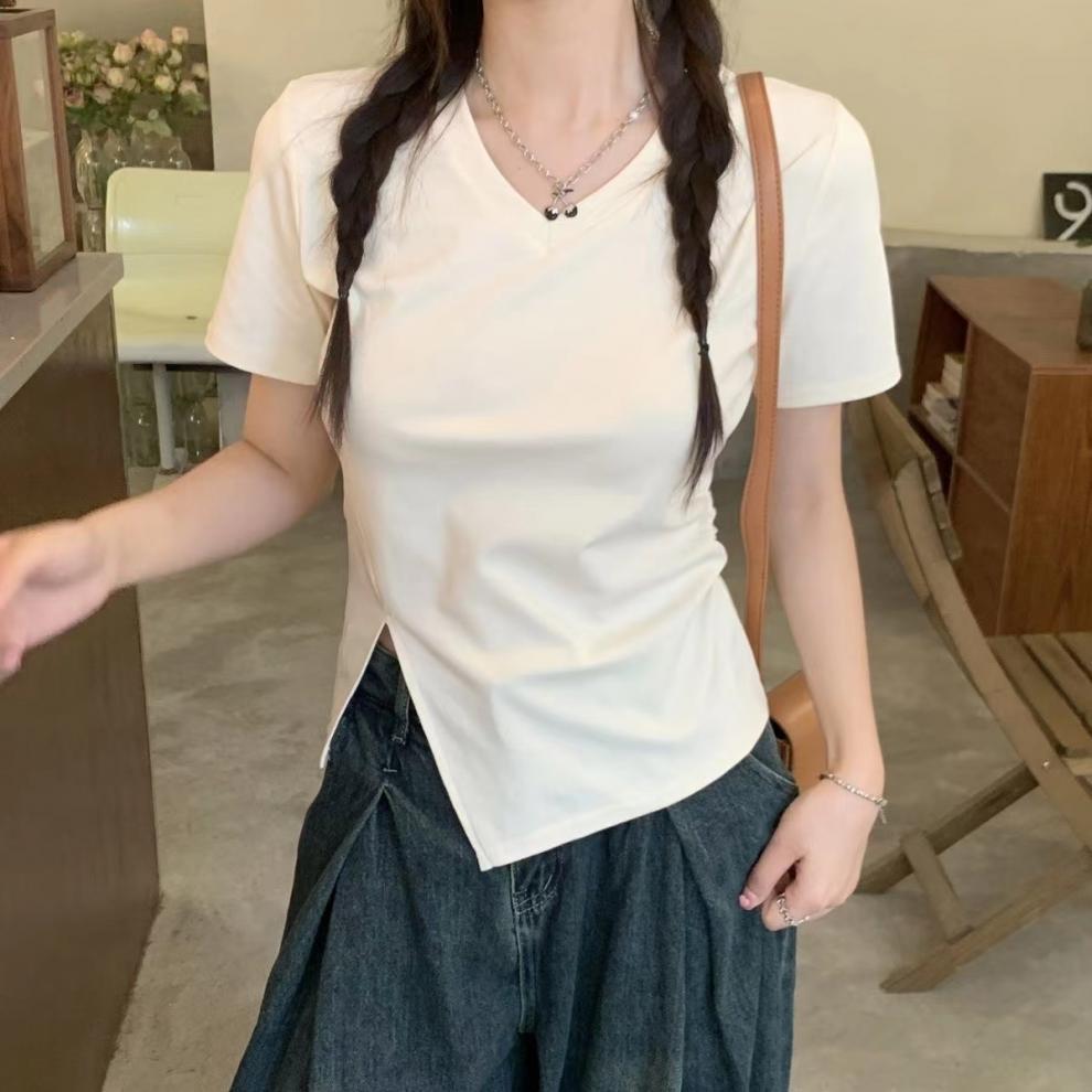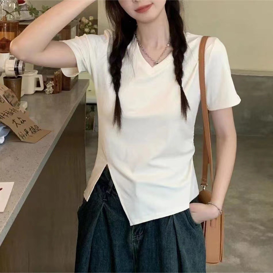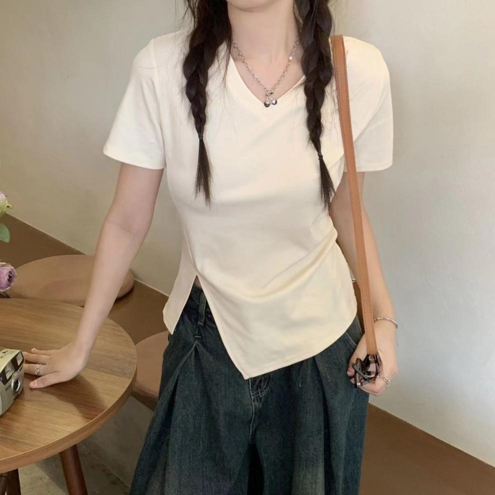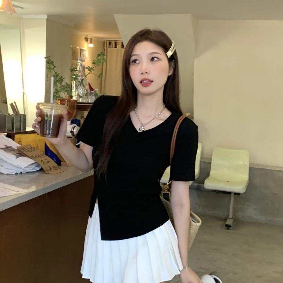 면 디자인 감각 플러스 사이즈 반팔 셔츠 여성의 여름 슬리밍 위장 불규칙한 어깨 탑 뜨거운 소녀스토어 가기
