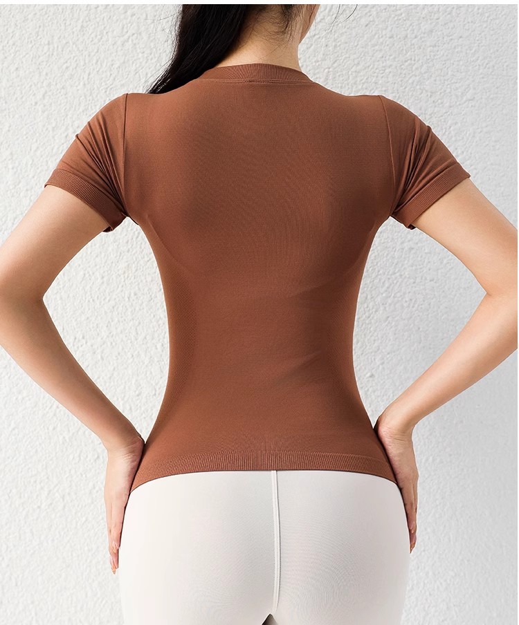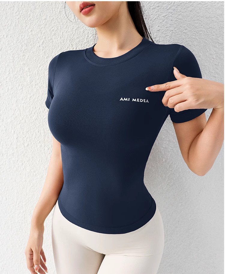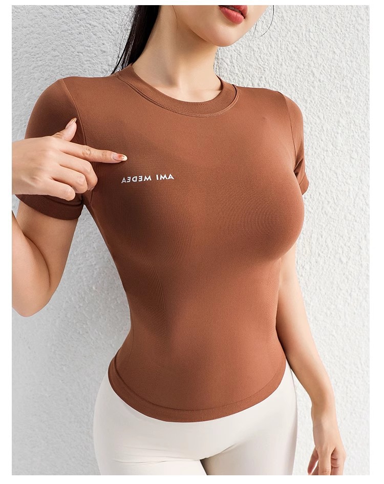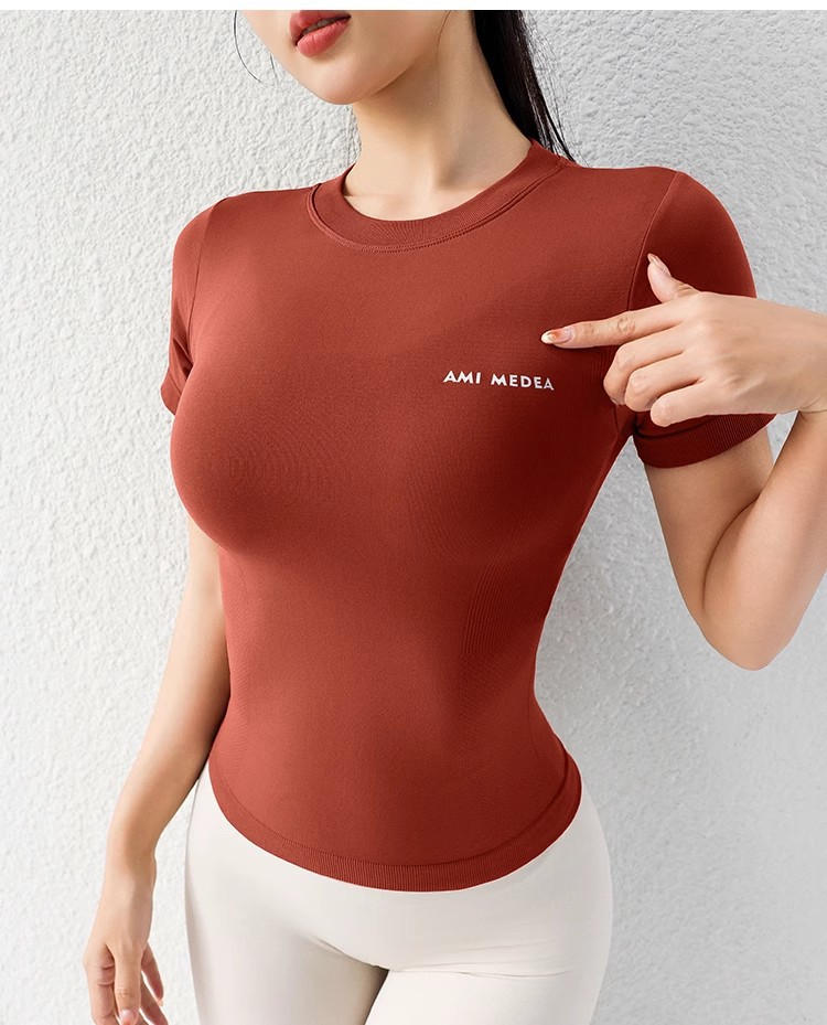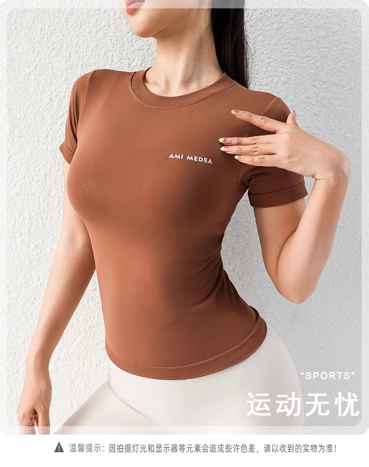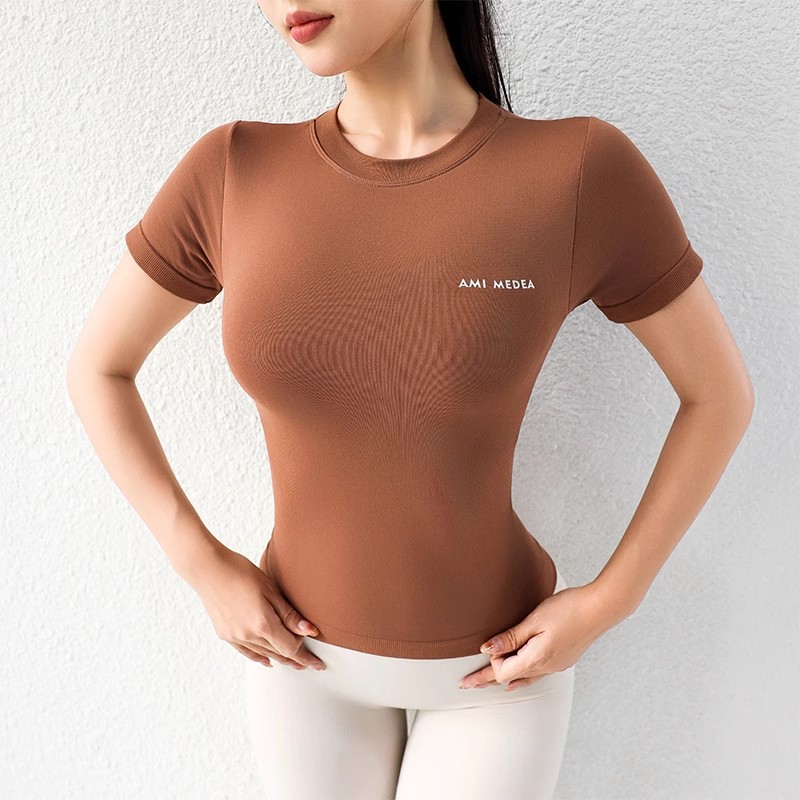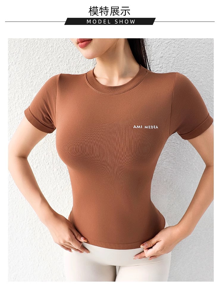AMI MEDEA 스포츠 반팔 꽉 끼는 달리기 원활한 피트니스 세트 티셔츠 짧은 솔리드 컬러 요가 세트 여성용 탑스토어 가기