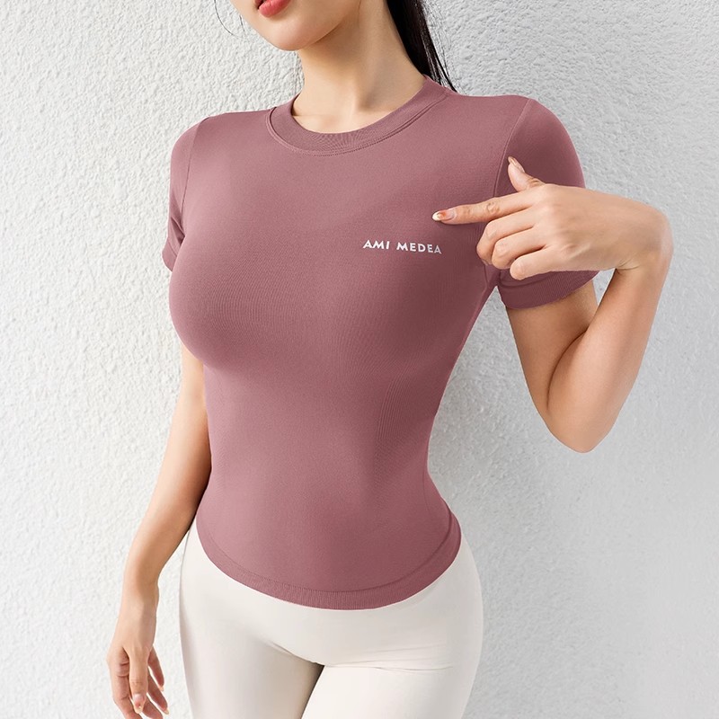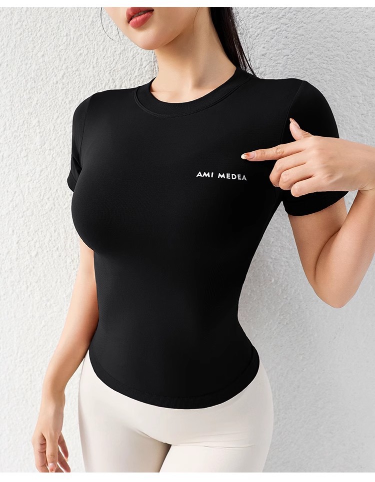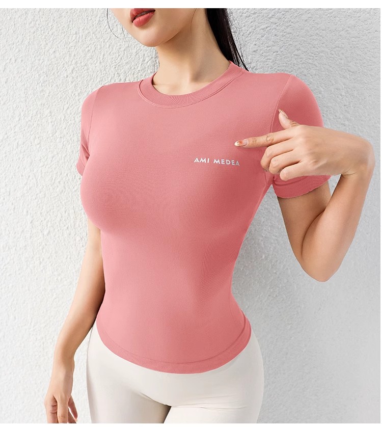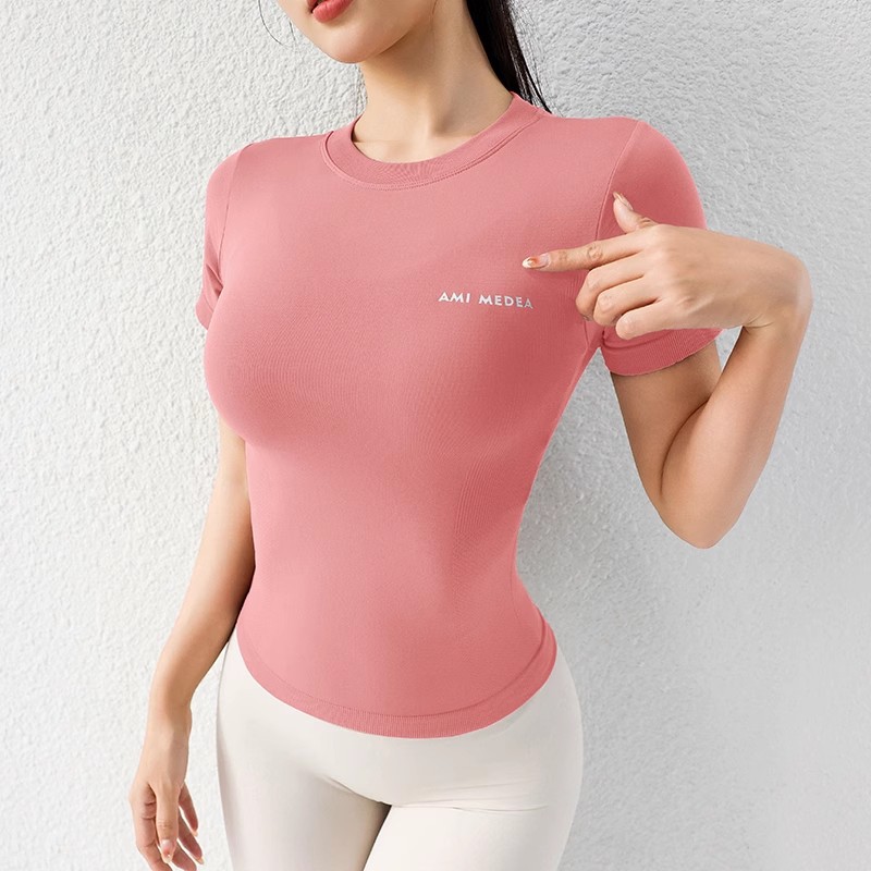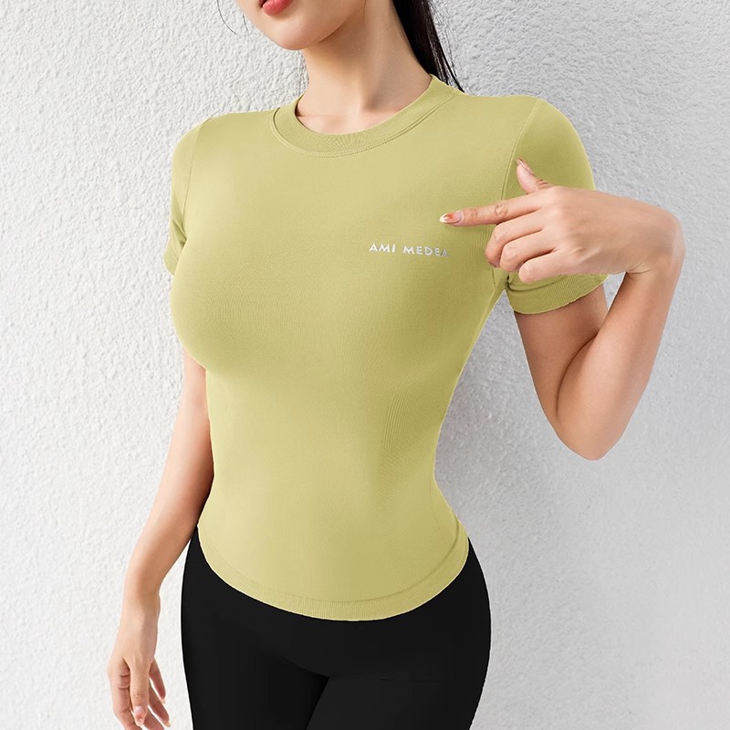 AMI MEDEA 스포츠 반팔 꽉 끼는 달리기 원활한 피트니스 세트 티셔츠 짧은 솔리드 컬러 요가 세트 여성용 탑