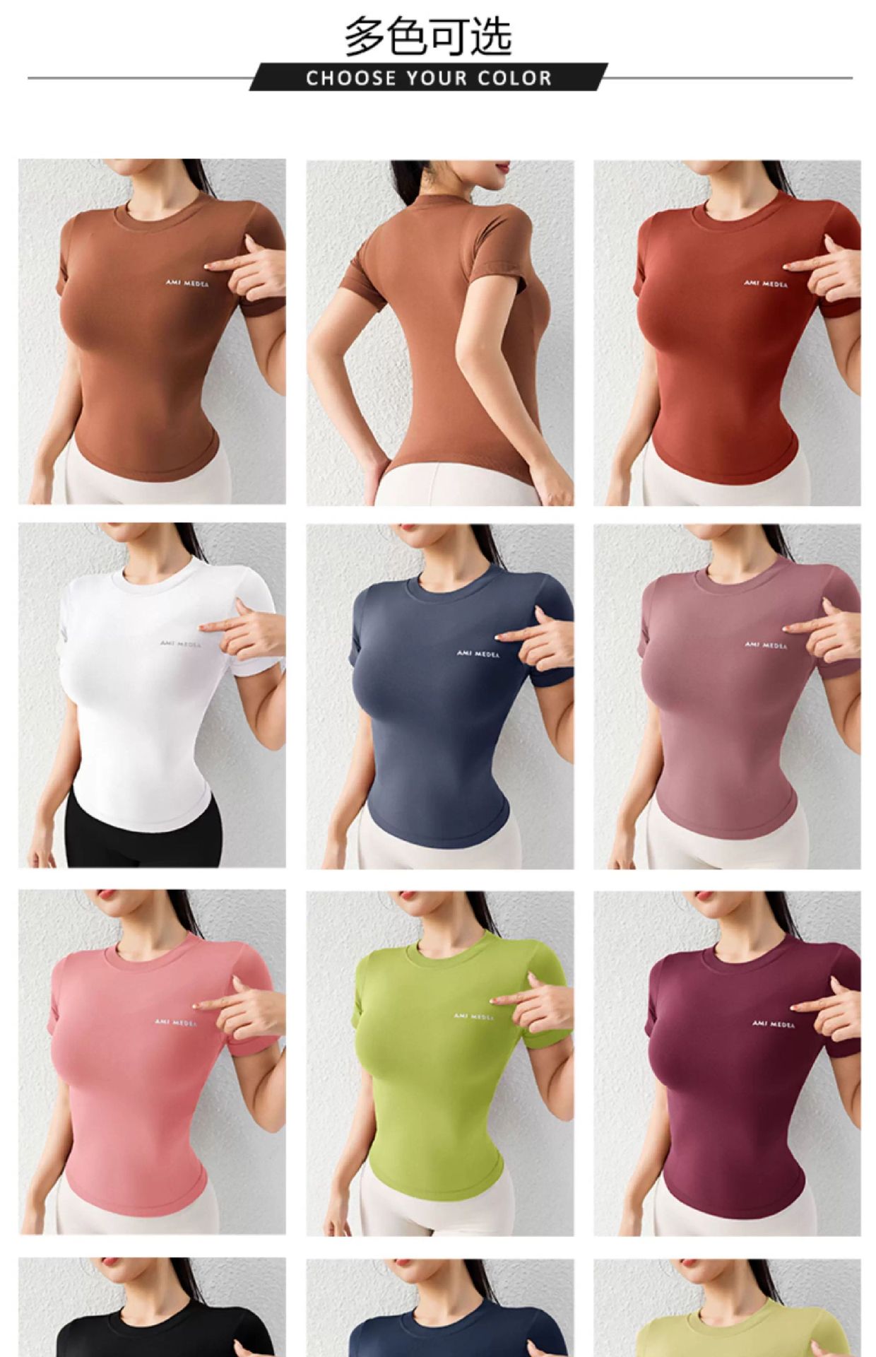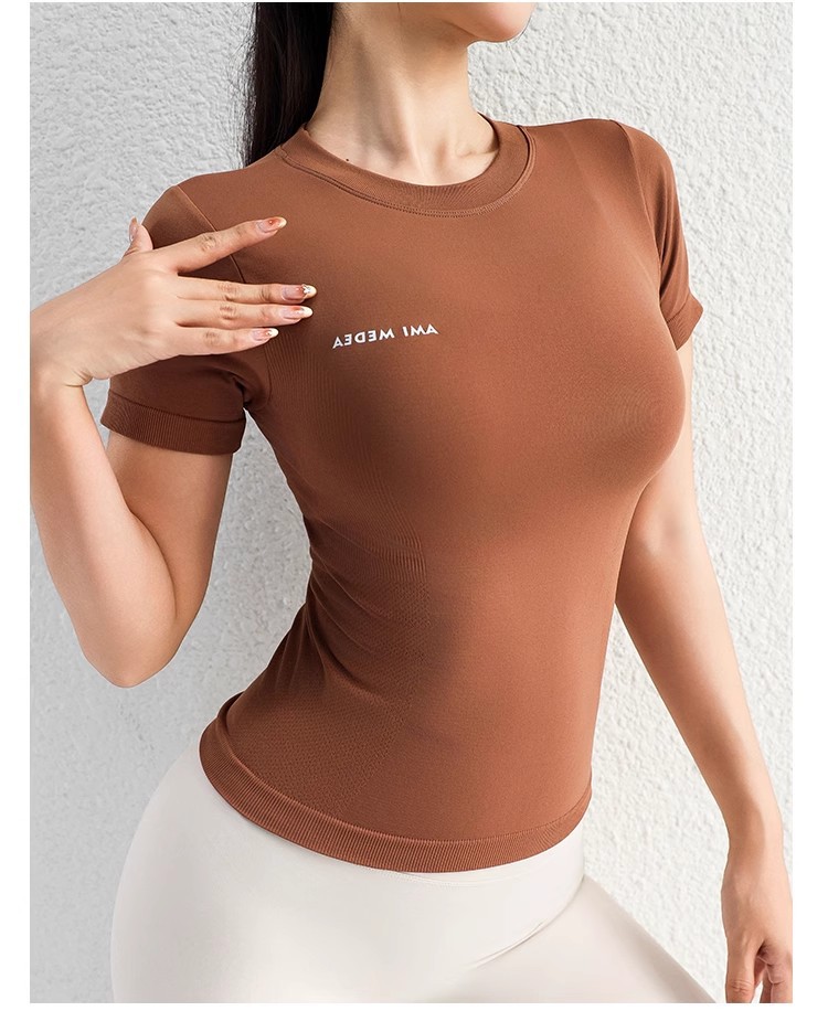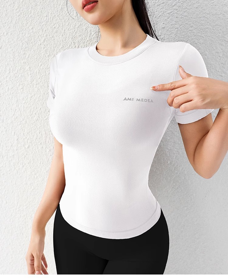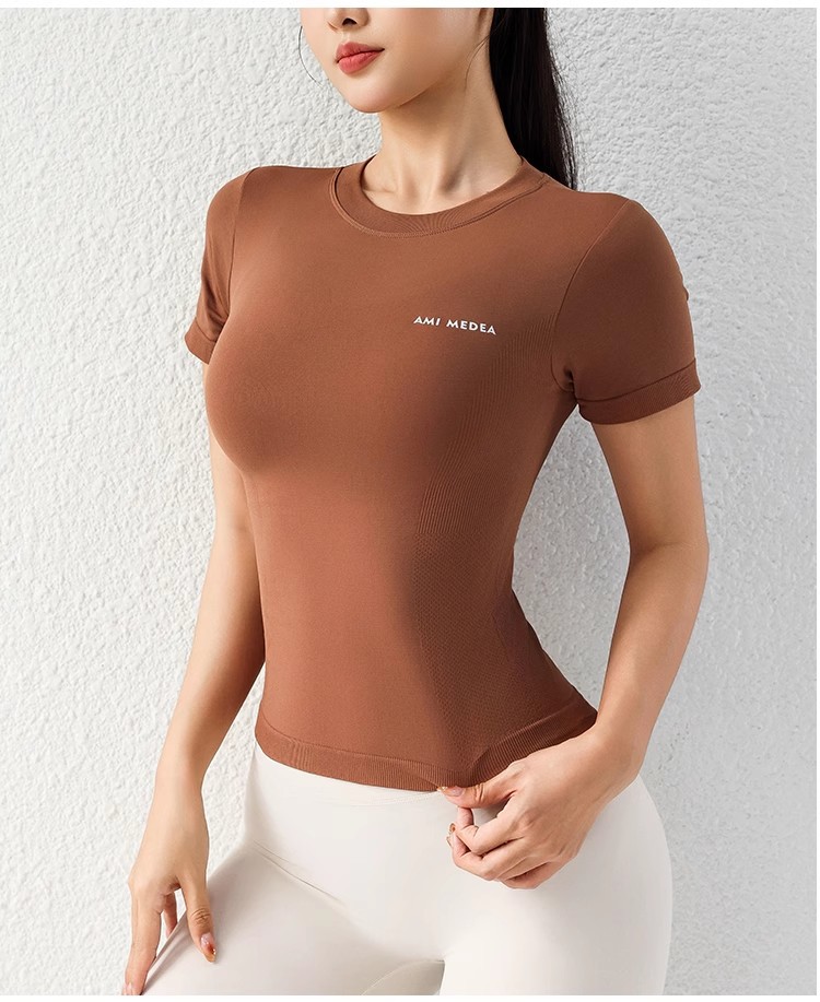 AMI MEDEA 스포츠 반팔 꽉 끼는 달리기 원활한 피트니스 세트 티셔츠 짧은 솔리드 컬러 요가 세트 여성용 탑