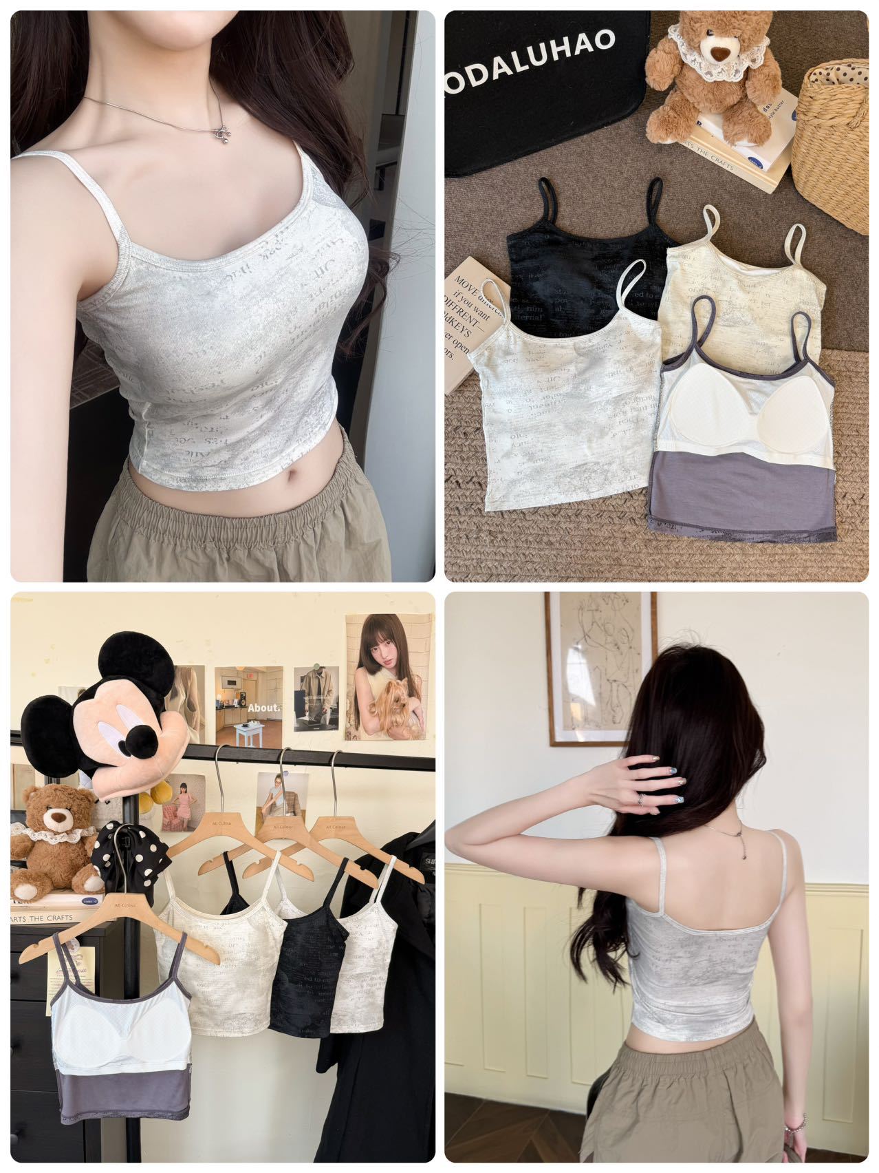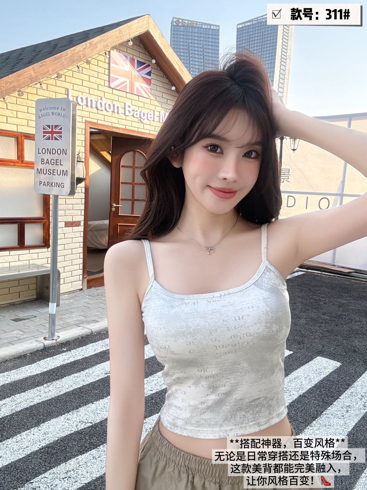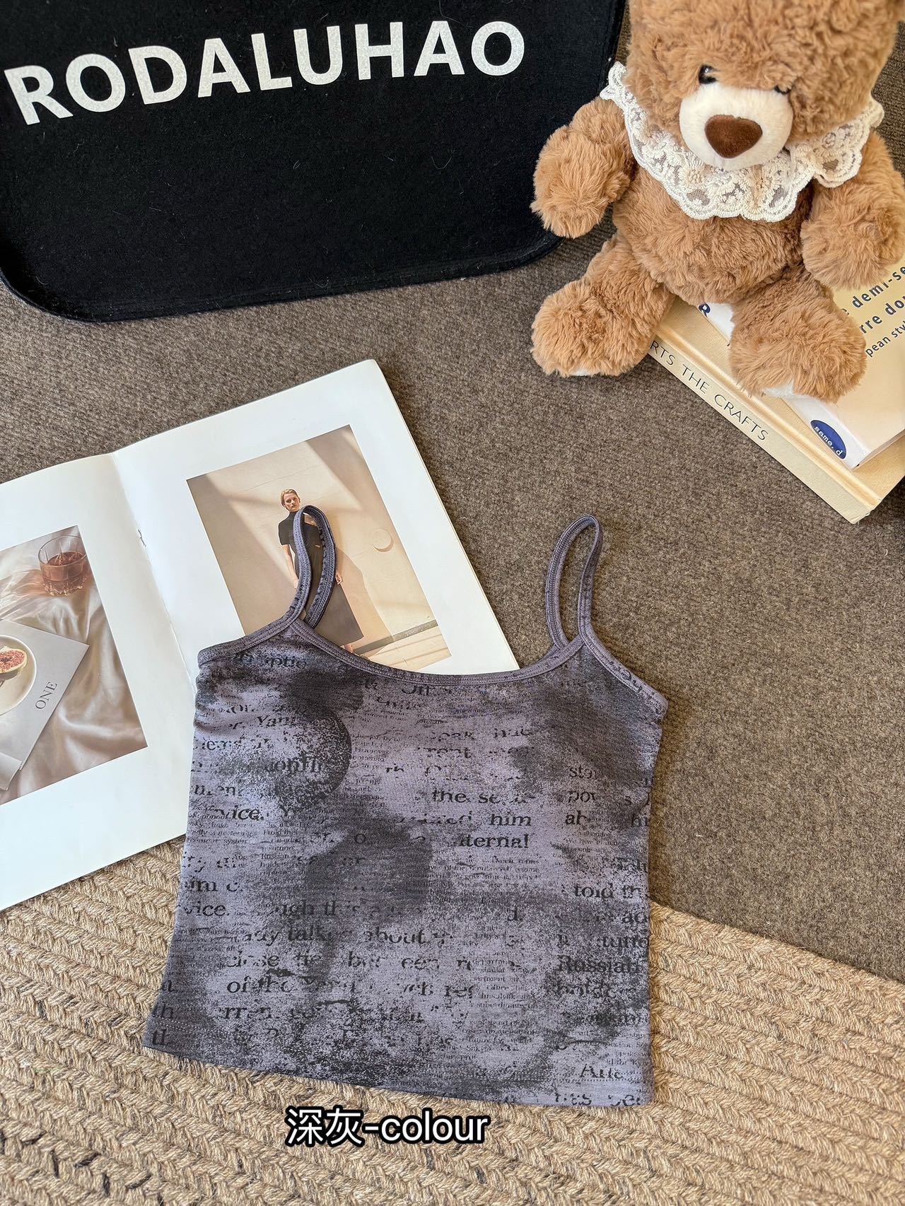 311 # 새로운 스타일의 프린트 레터 스파게티 스트랩 조끼, 여성스러운 슬림핏 짧은 미국식 이너탑(가슴 패드 포함)