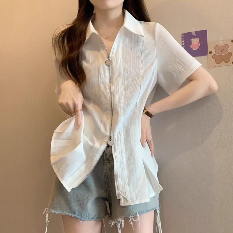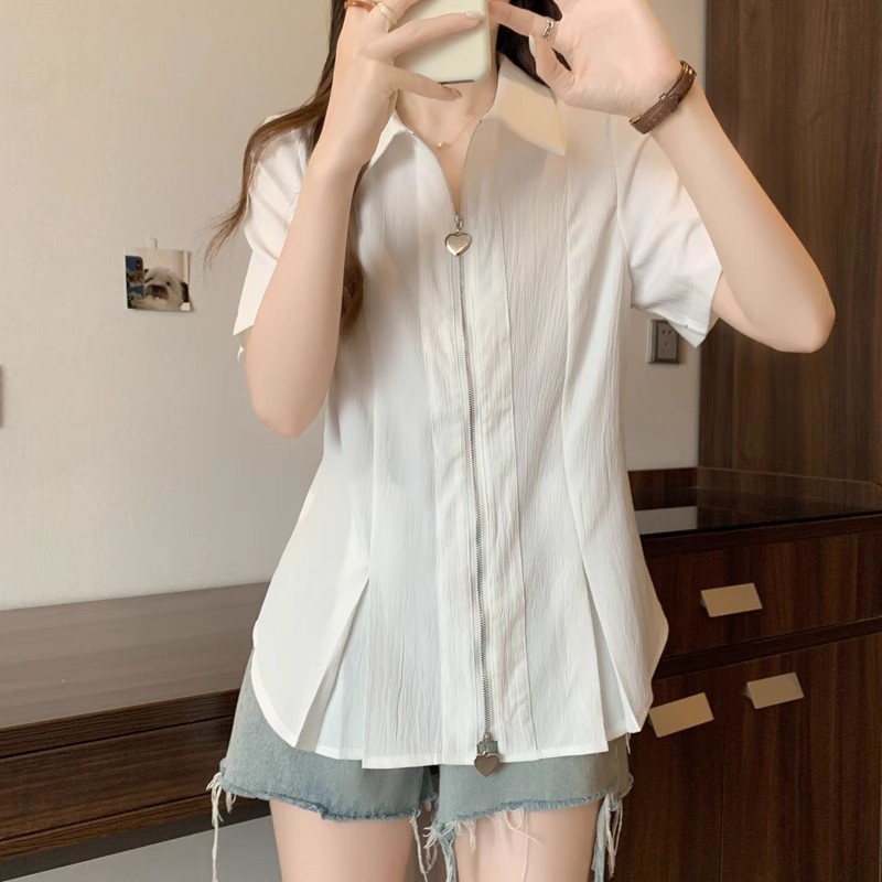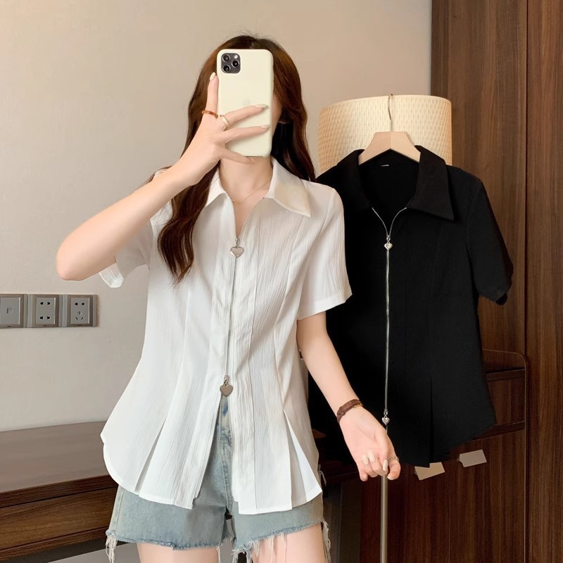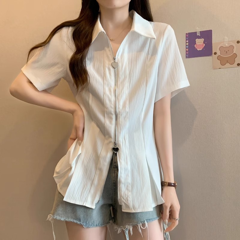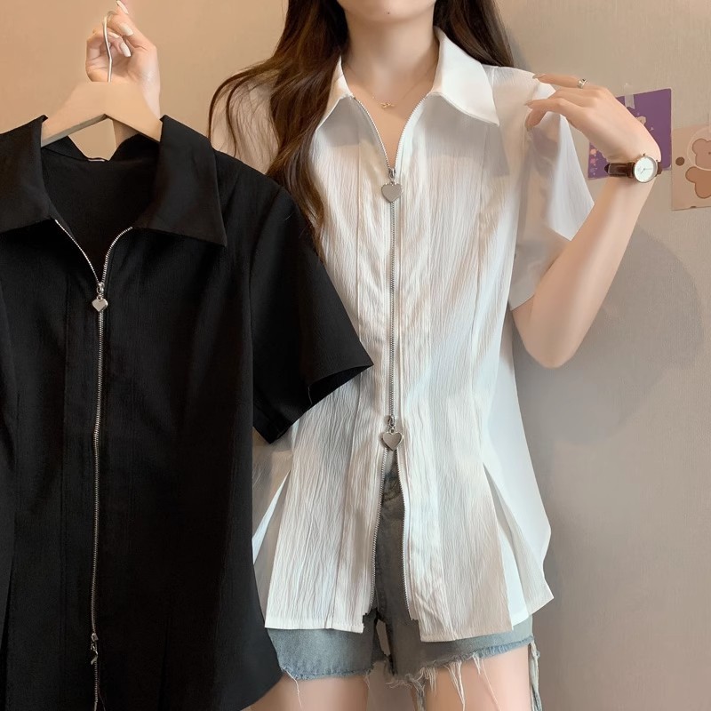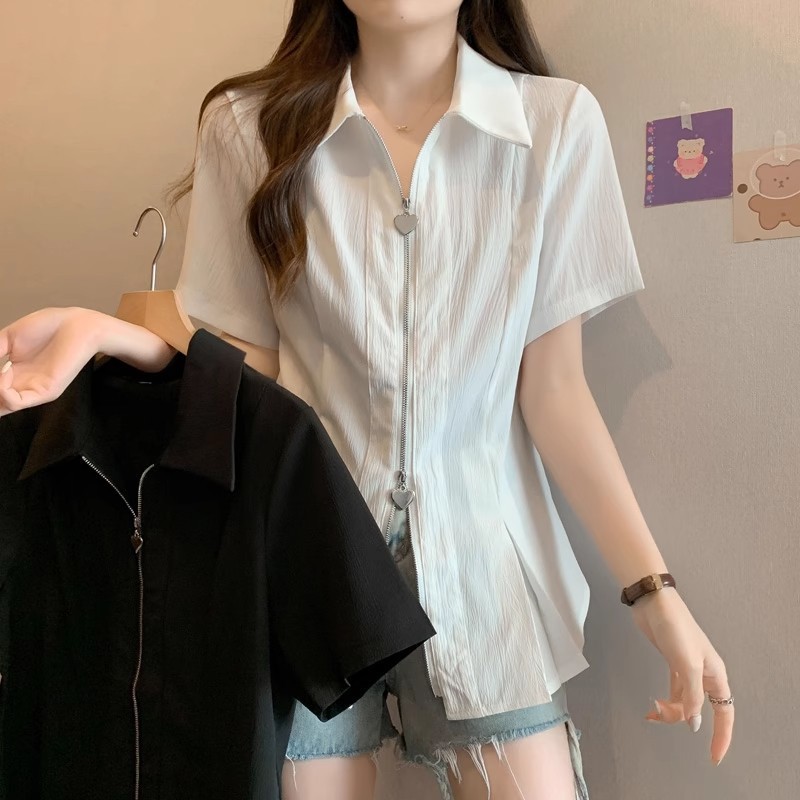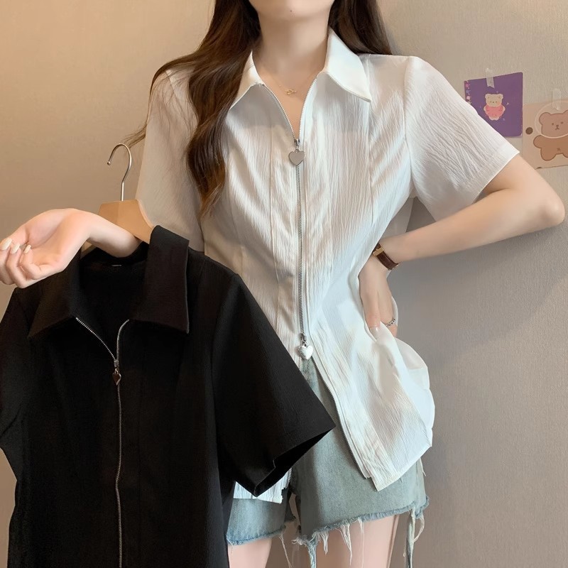 플러스 사이즈 칼라 더블 지퍼 화이트 반팔 셔츠 2024 여성을위한 새로운 여름 지방 슬림 배 덮개 탑