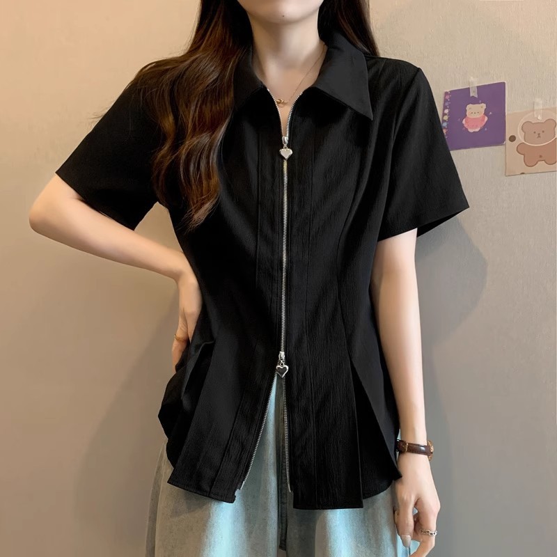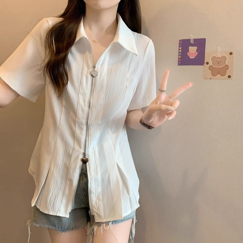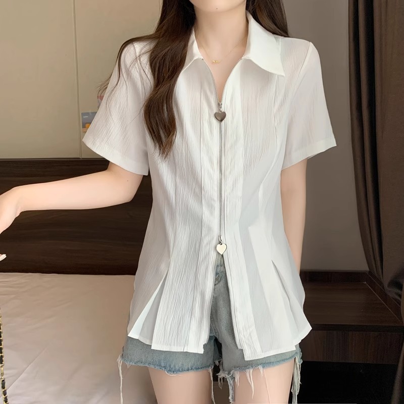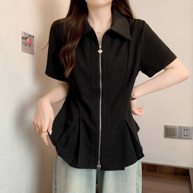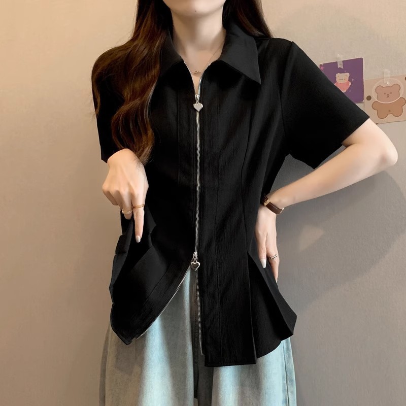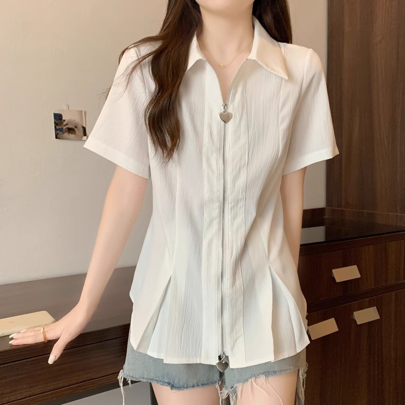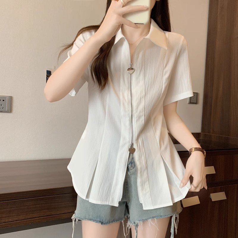 플러스 사이즈 칼라 더블 지퍼 화이트 반팔 셔츠 2024 여성을위한 새로운 여름 지방 슬림 배 덮개 탑