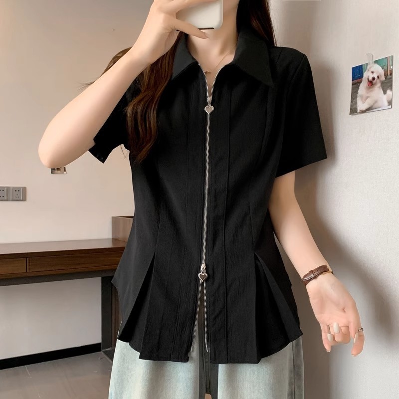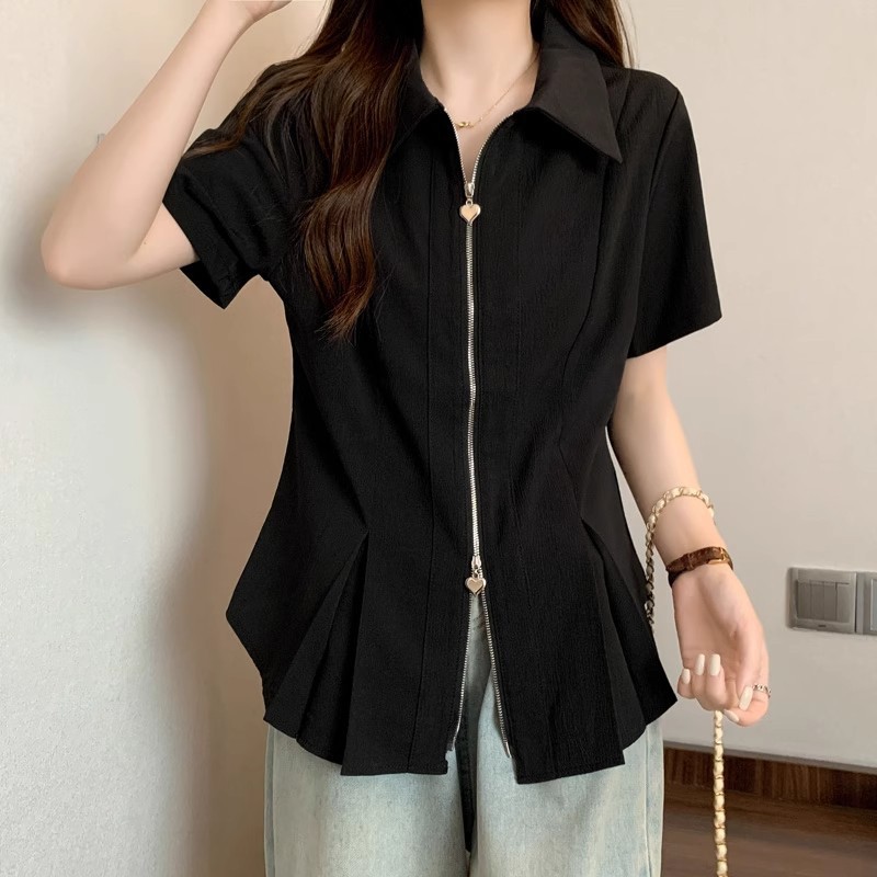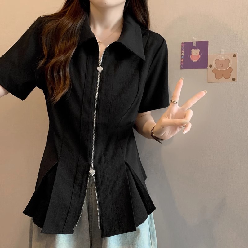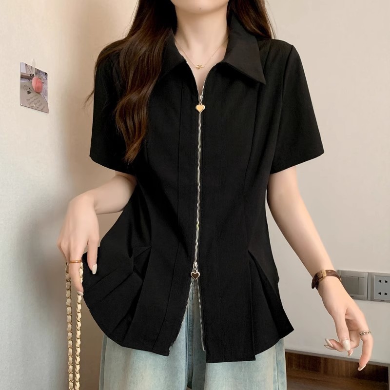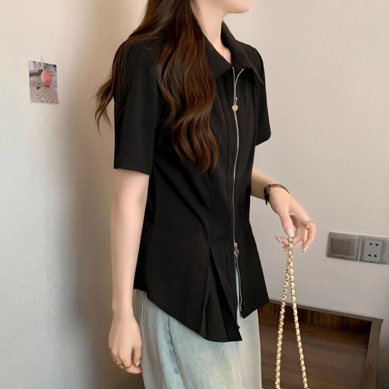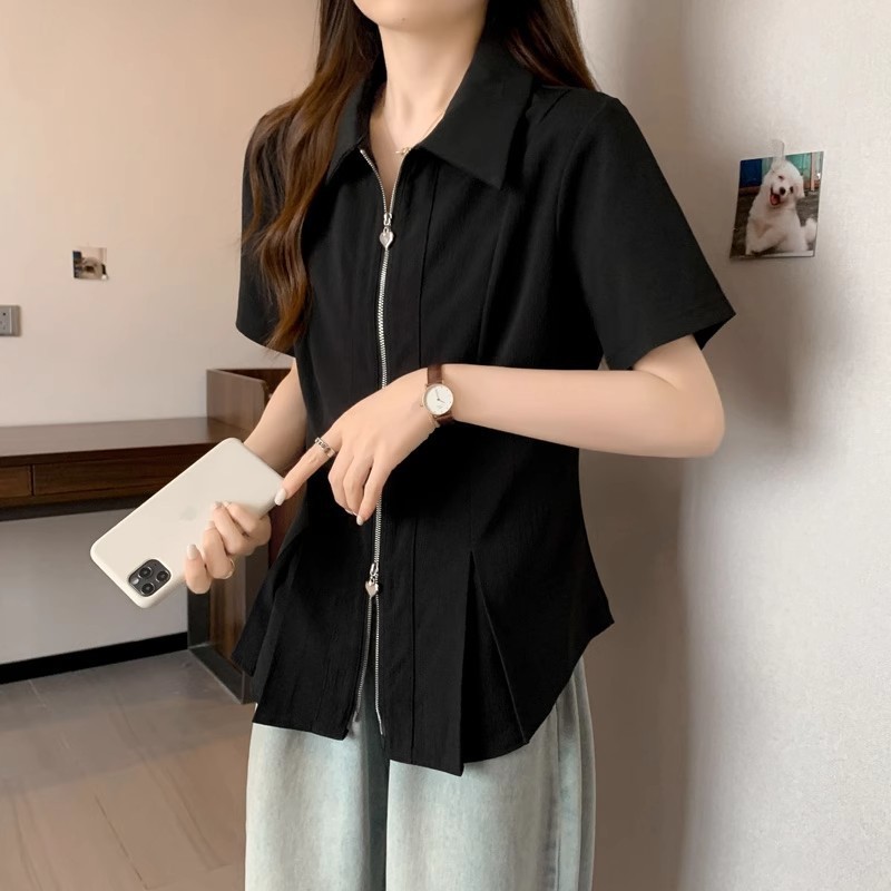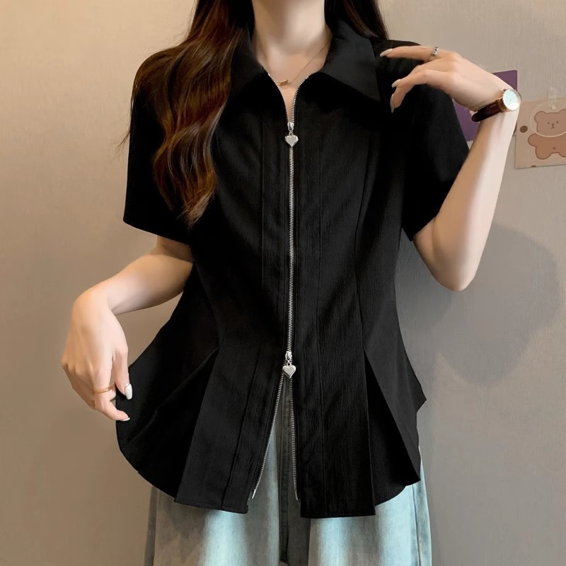 플러스 사이즈 칼라 더블 지퍼 화이트 반팔 셔츠 2024 여성을위한 새로운 여름 지방 슬림 배 덮개 탑