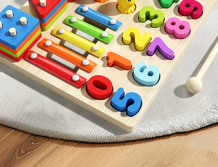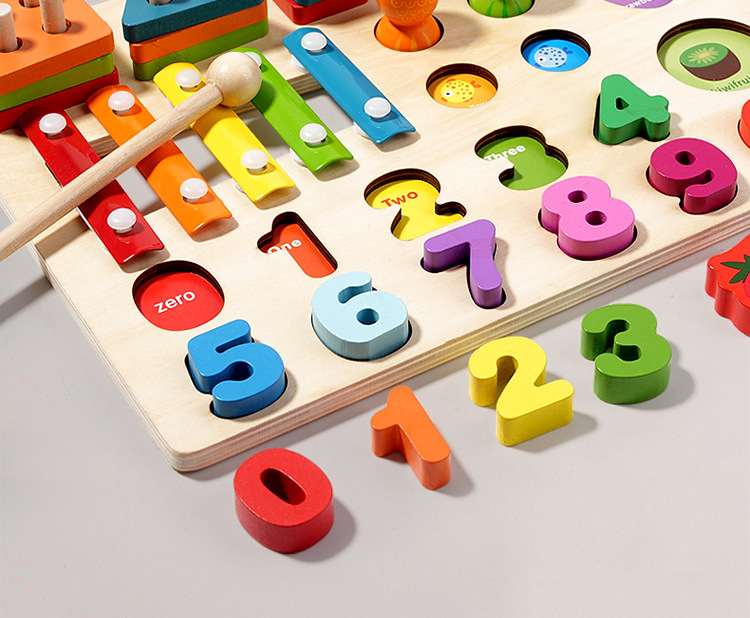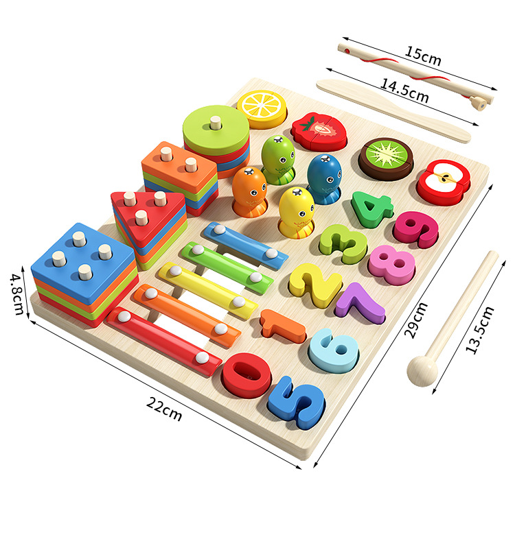 어린이 나무 장난감 낚시 세트 기둥 노크 디지털 퍼즐 5 대 1 모양 컬러 인지 절단 과일 장난감