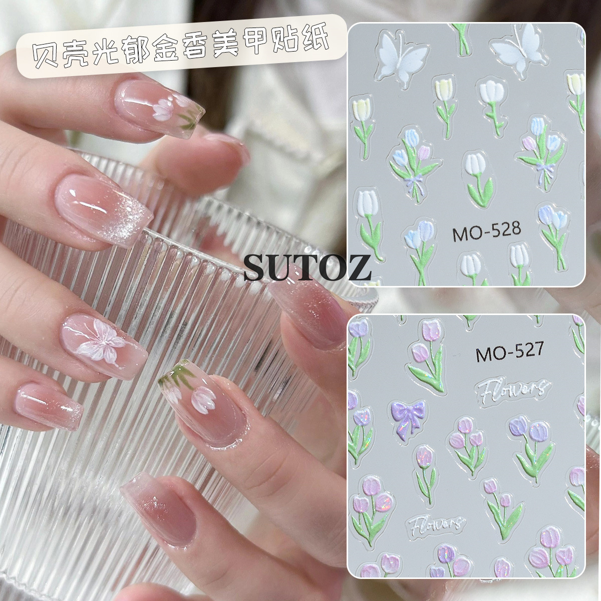 2025 새로운 네일 아트 스티커 작은 고구마 같은 스타일 신선한 쉘 라이트 튤립 엠보싱 네일 백 접착 스티커스토어 가기