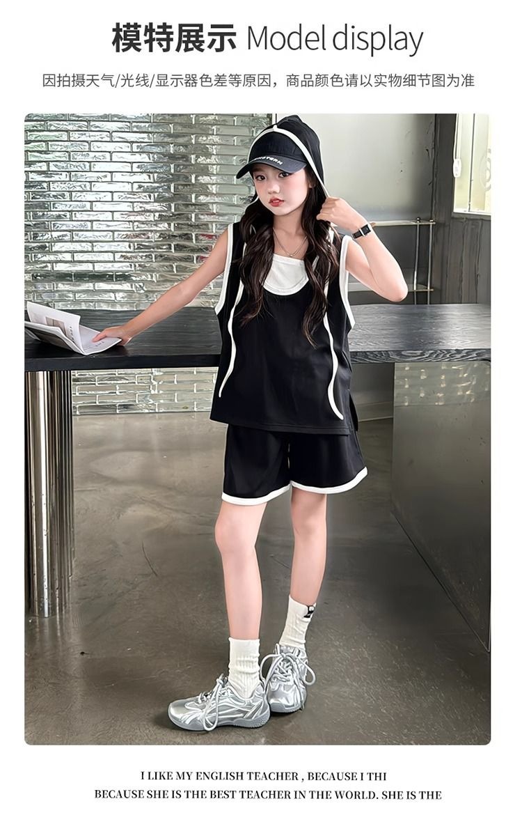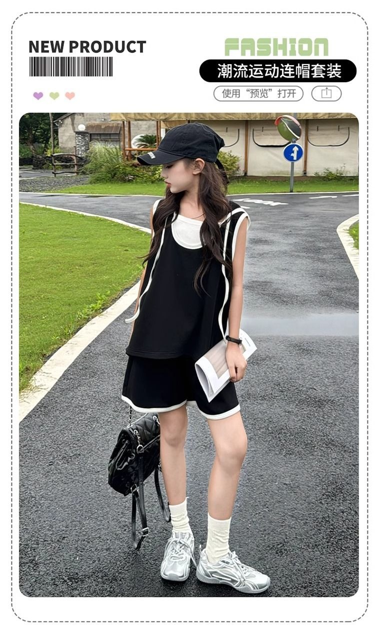 소녀 패션 캐주얼 스포츠웨어 2025 새로운 가짜 투피스 후드 민소매 톱 반바지 세트 큰 어린이 여름 원피스스토어 가기