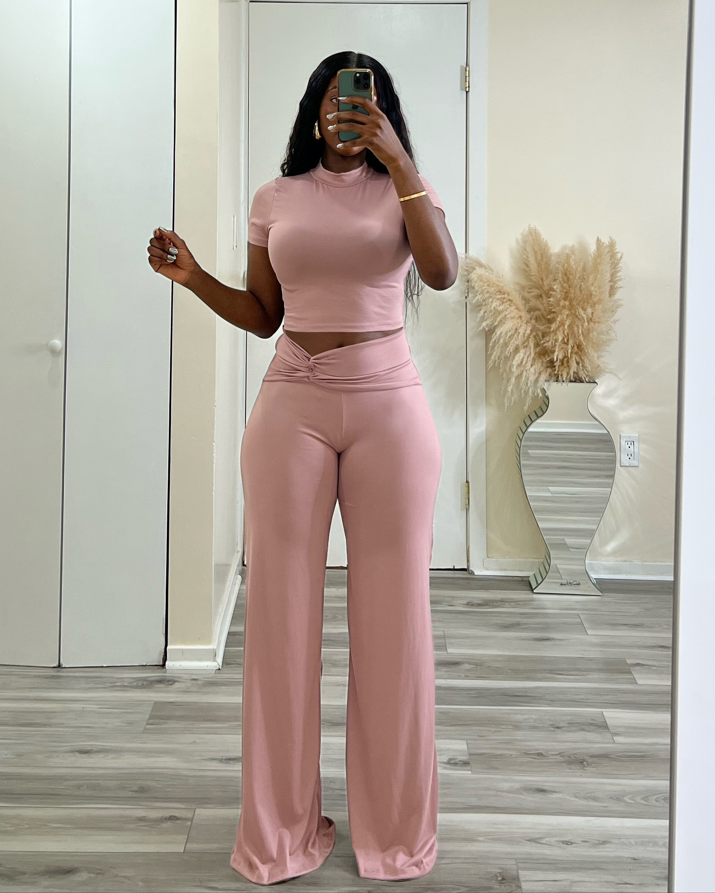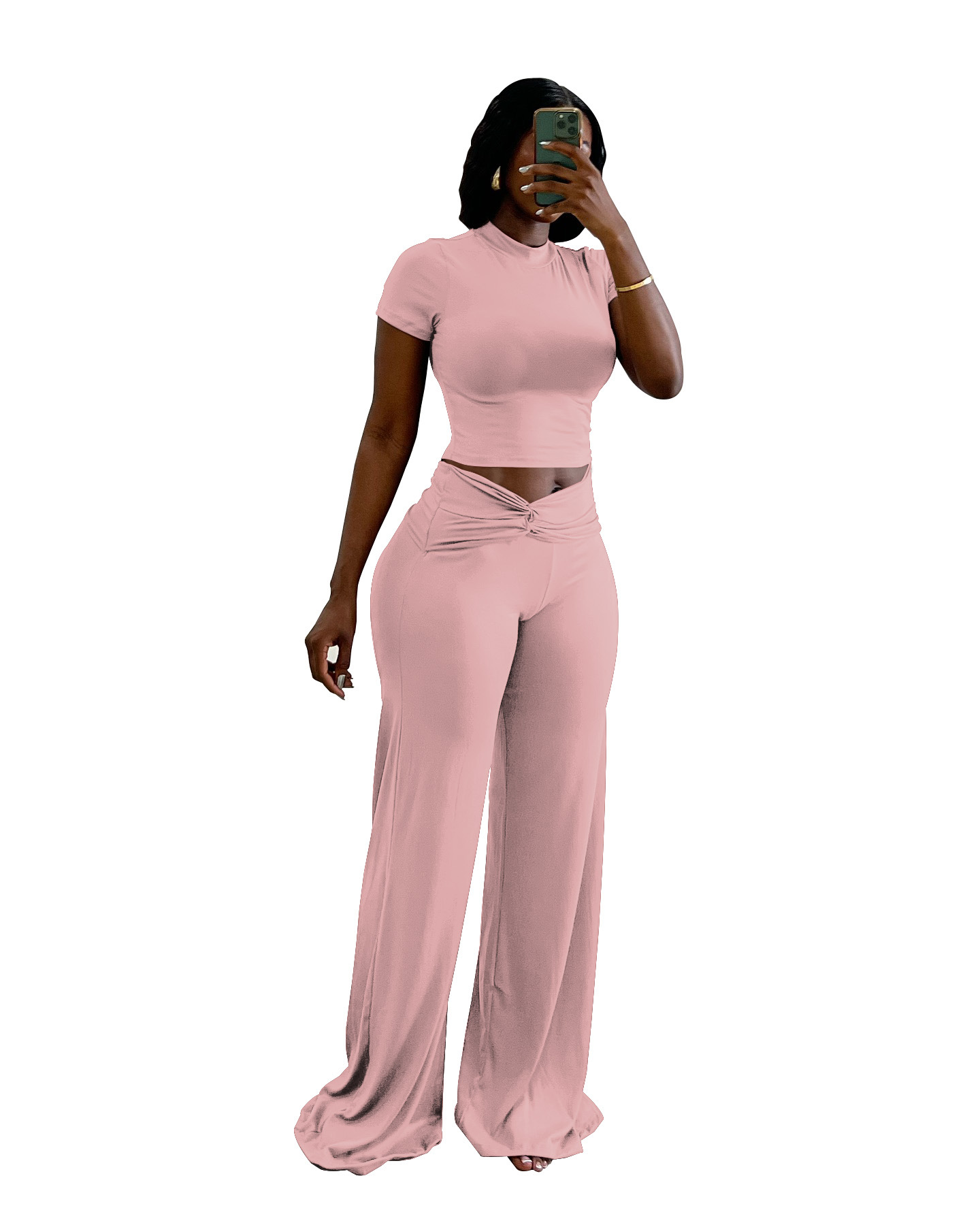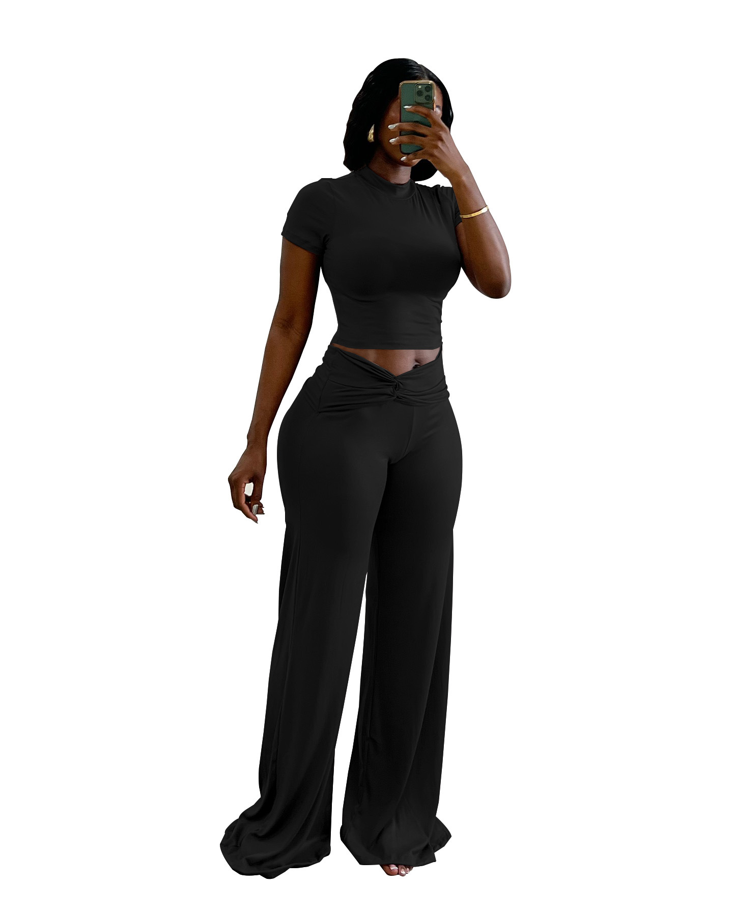 D10129 유럽과 미국의 아마존 25 여름 높은 허리 슬림 넓은 다리 바지 세트 솔리드 컬러 높은 탄성 꼬임 투피스 세트스토어 가기