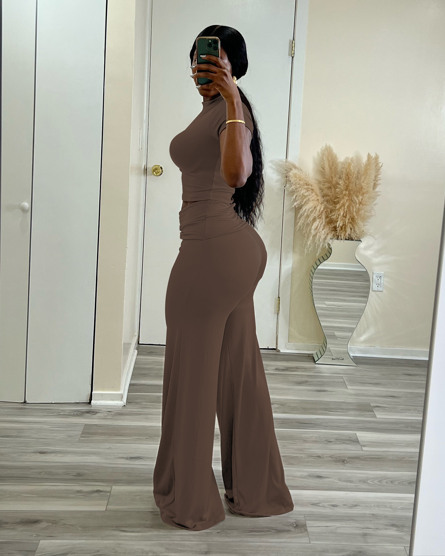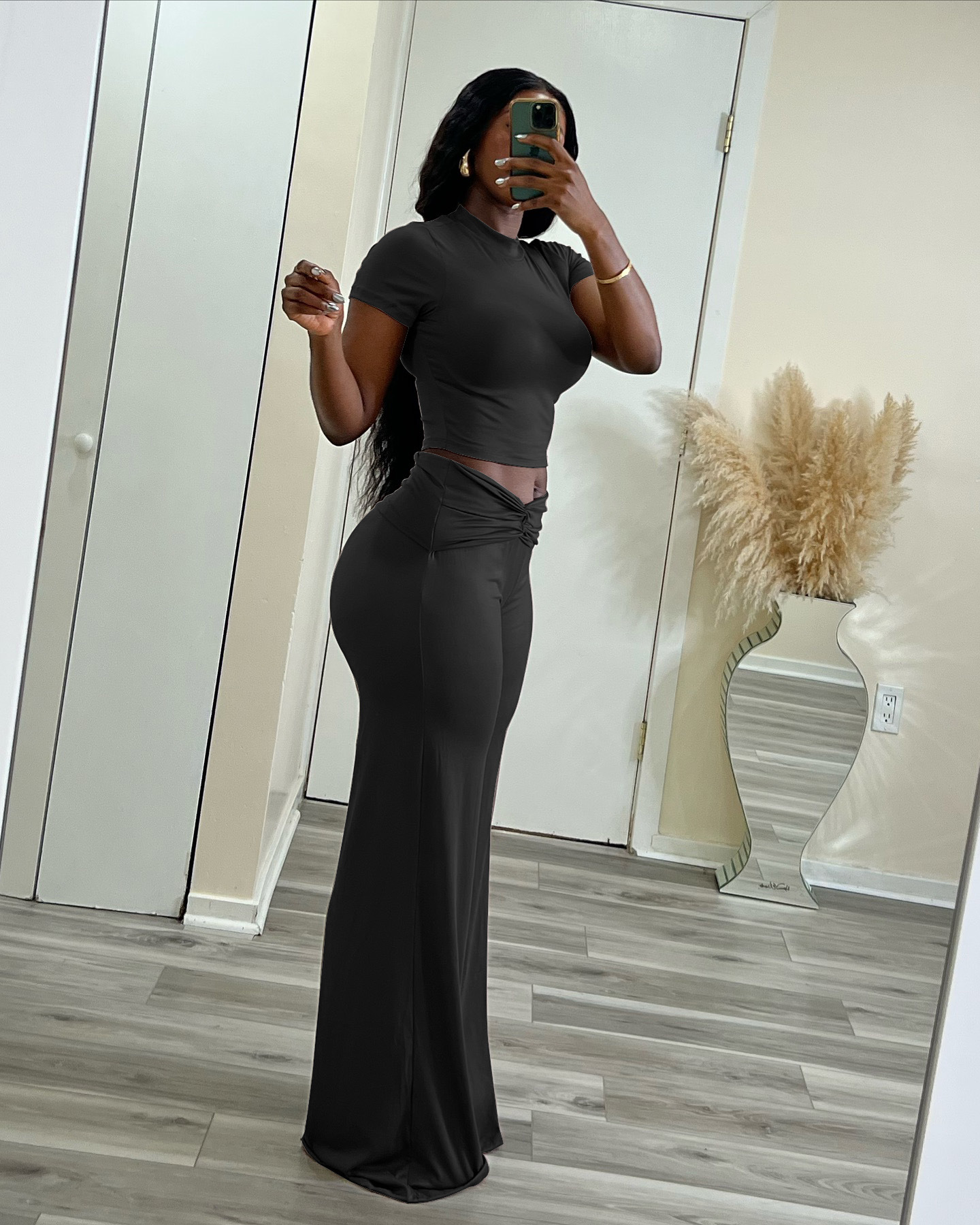 D10129 유럽과 미국의 아마존 25 여름 높은 허리 슬림 넓은 다리 바지 세트 솔리드 컬러 높은 탄성 꼬임 투피스 세트