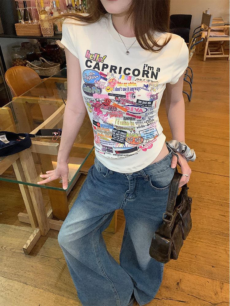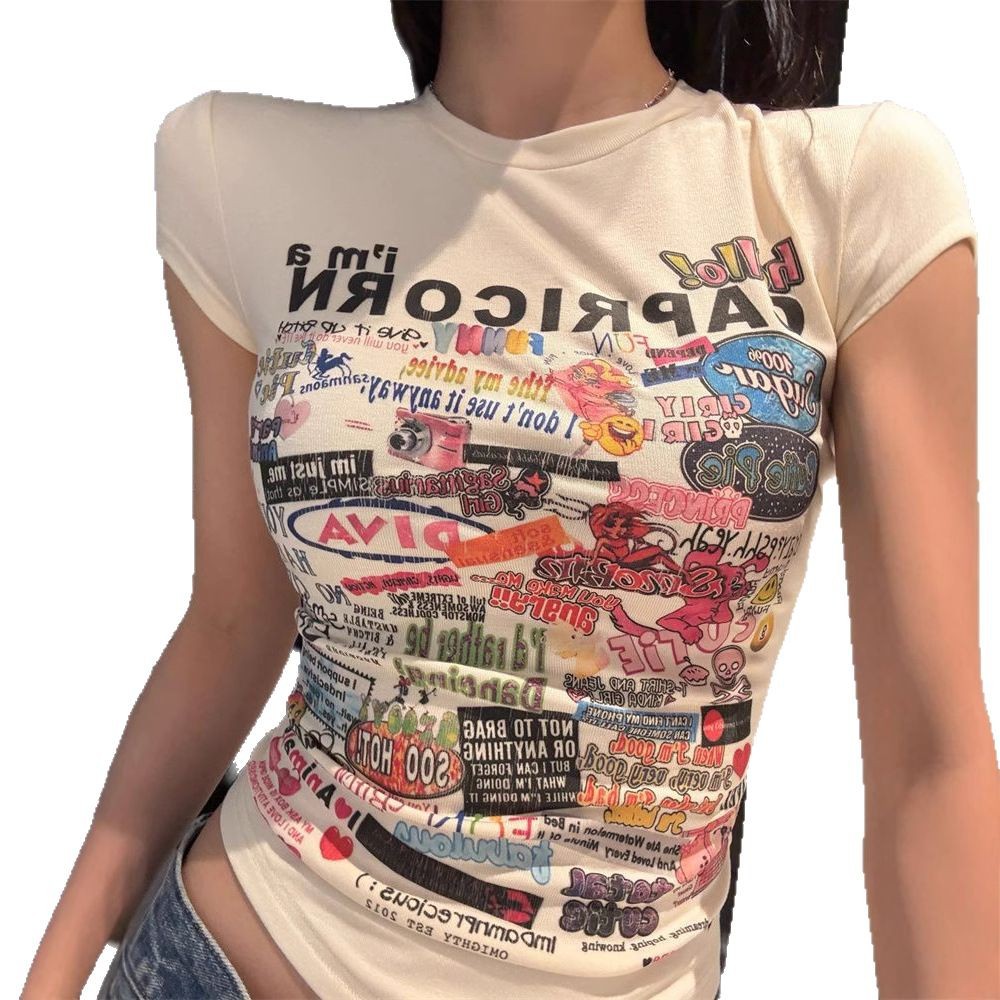 오리지널 패브릭 라운드 넥 짧은 프린트 티셔츠 여성용 봄과 여름 슬림 핏 숄더 아메리칸 스타일 레트로 슬리밍 반팔 탑