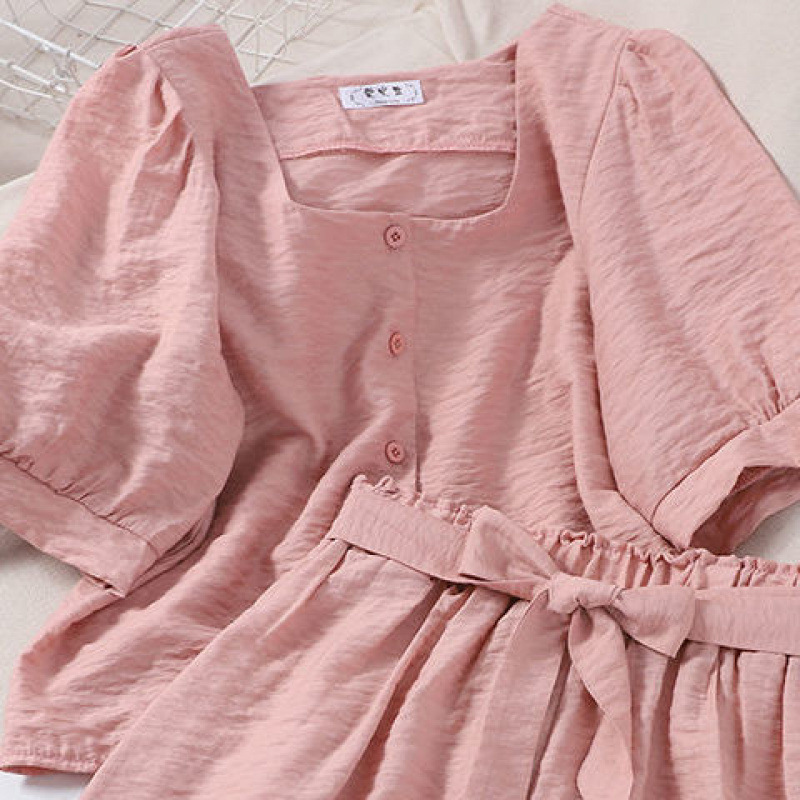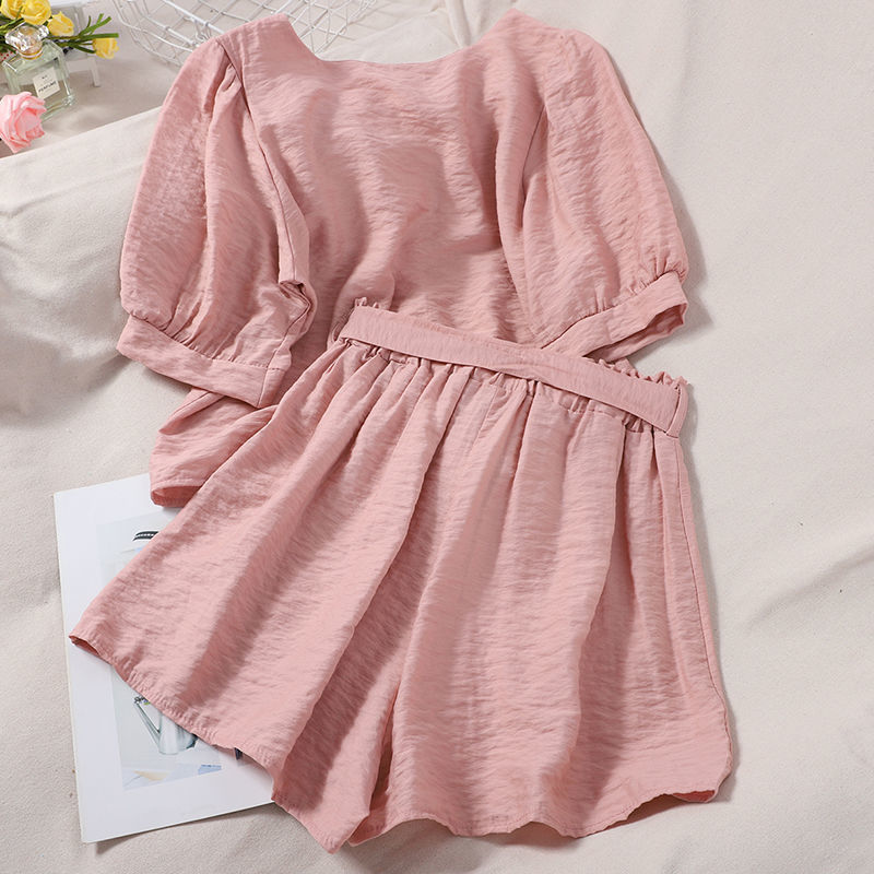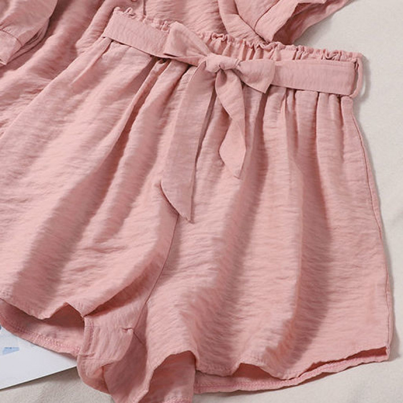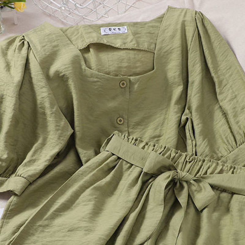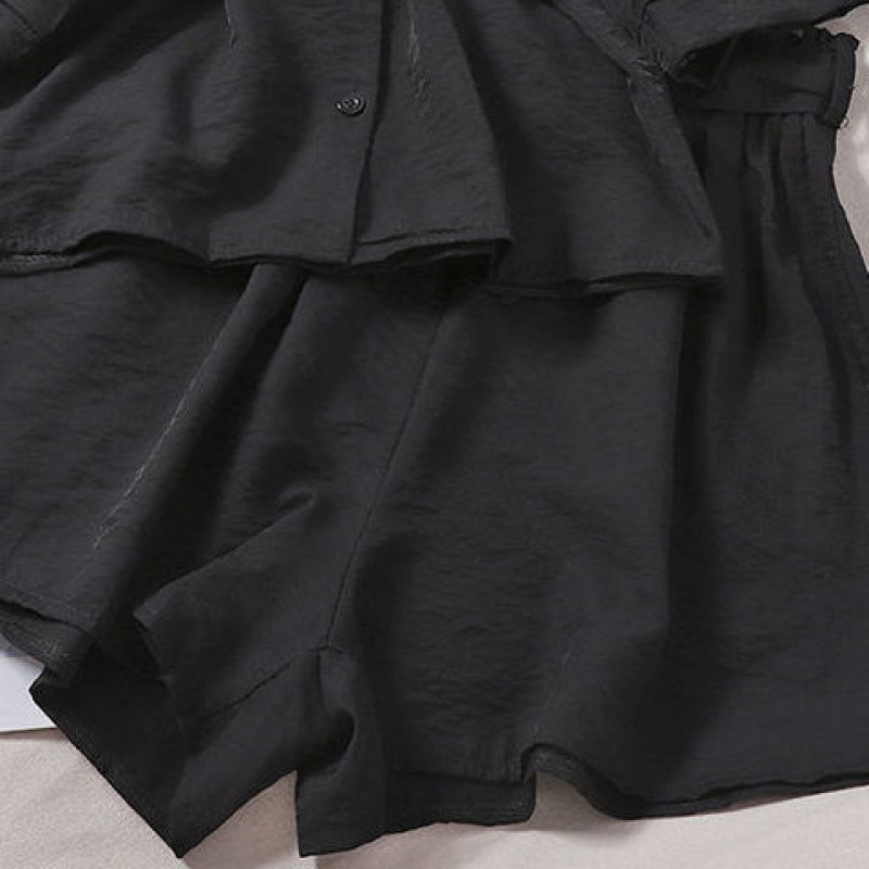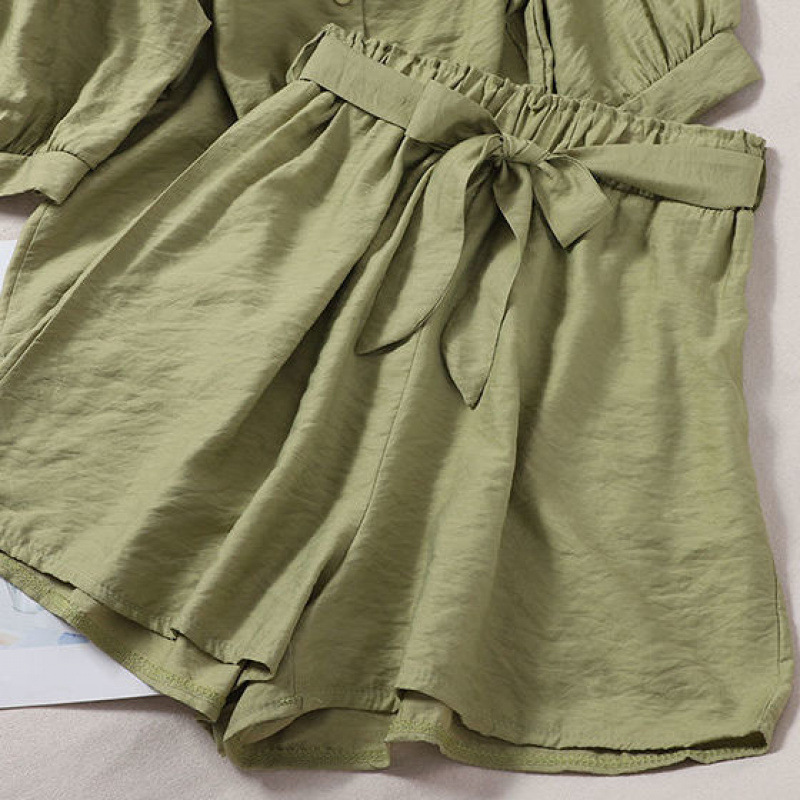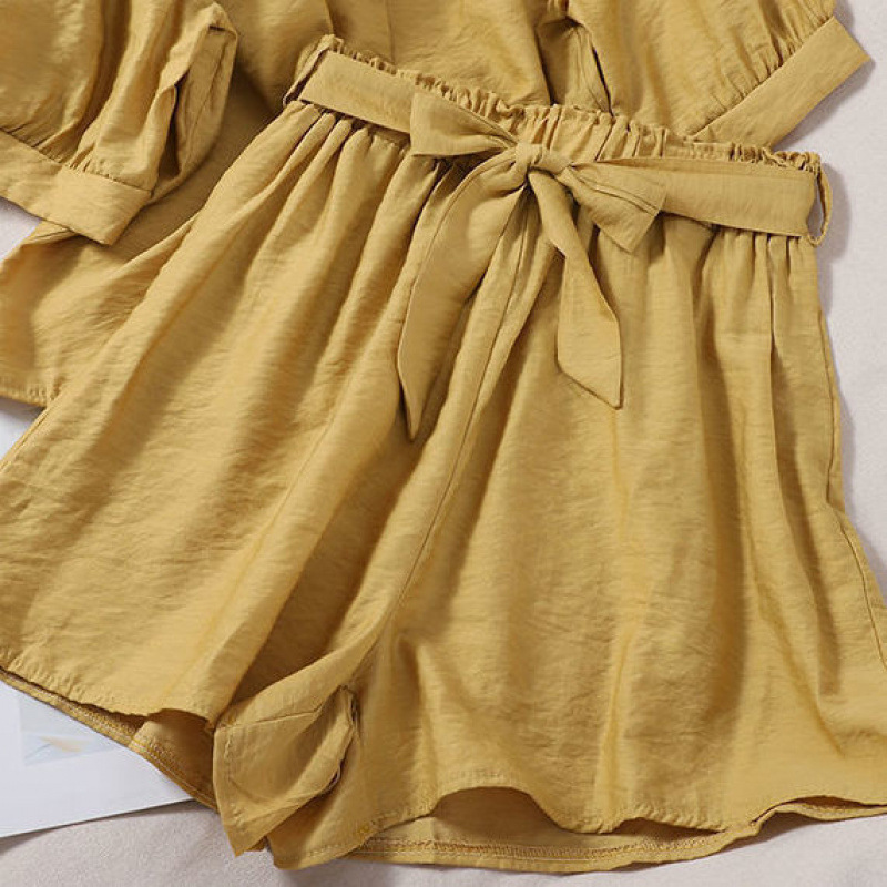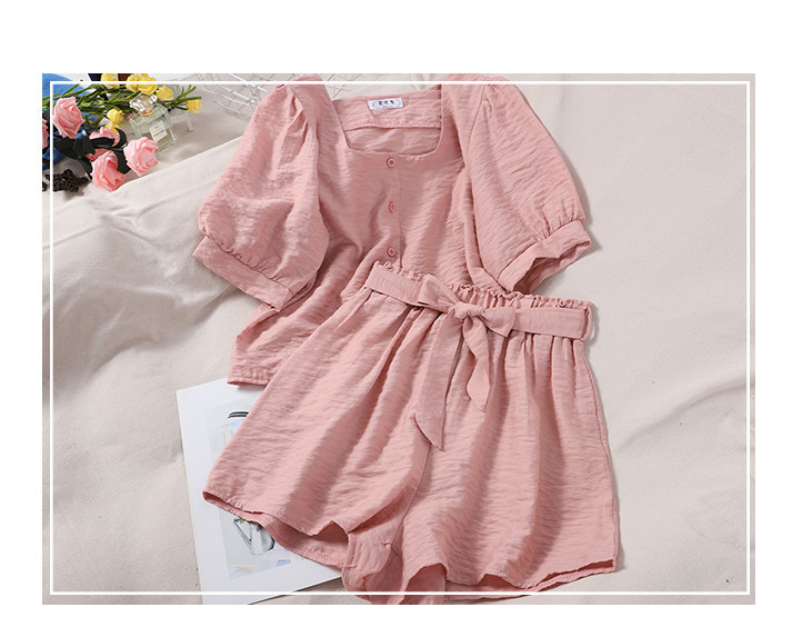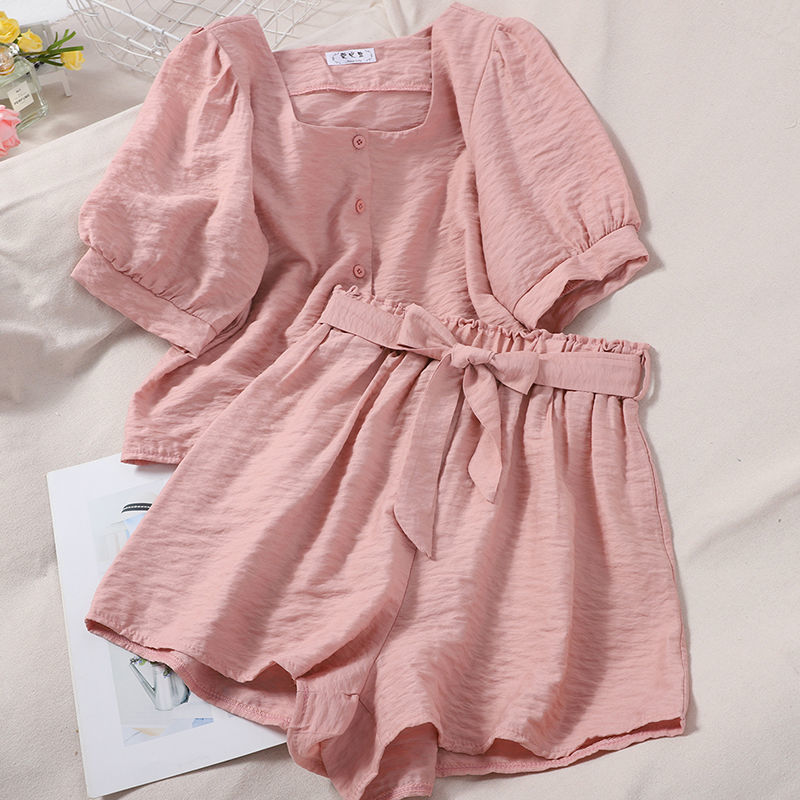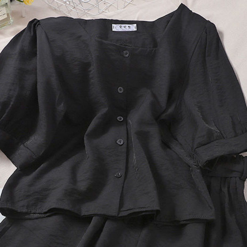 세트 여성 여름 새 광장 칼라 퍼프 슬리브 반팔 반팔 단발 높은 허리 와이드 레그 반바지 작은 투피스 세트스토어 가기