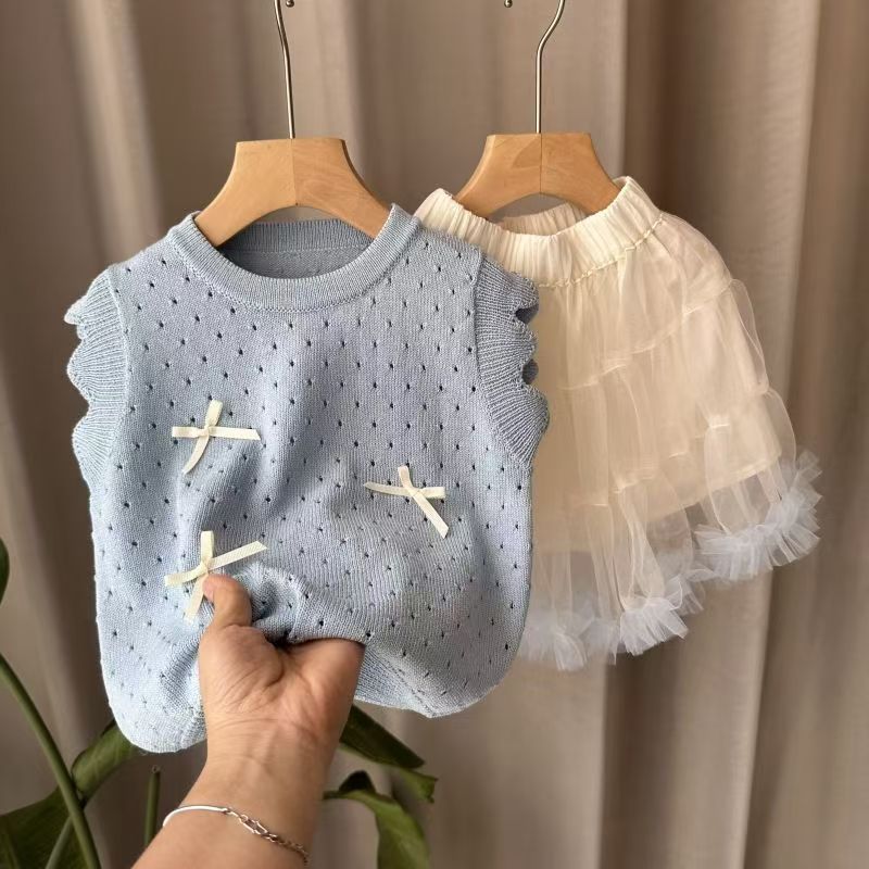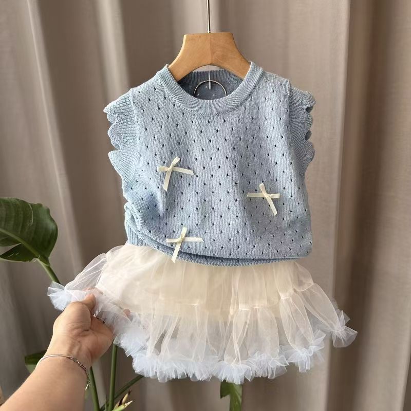 여자 여름 얼음 실크 탑 거즈 스커트 정장 2025 니트 스웨터 유행 아기 소녀 여름 투피스 스커트 유행