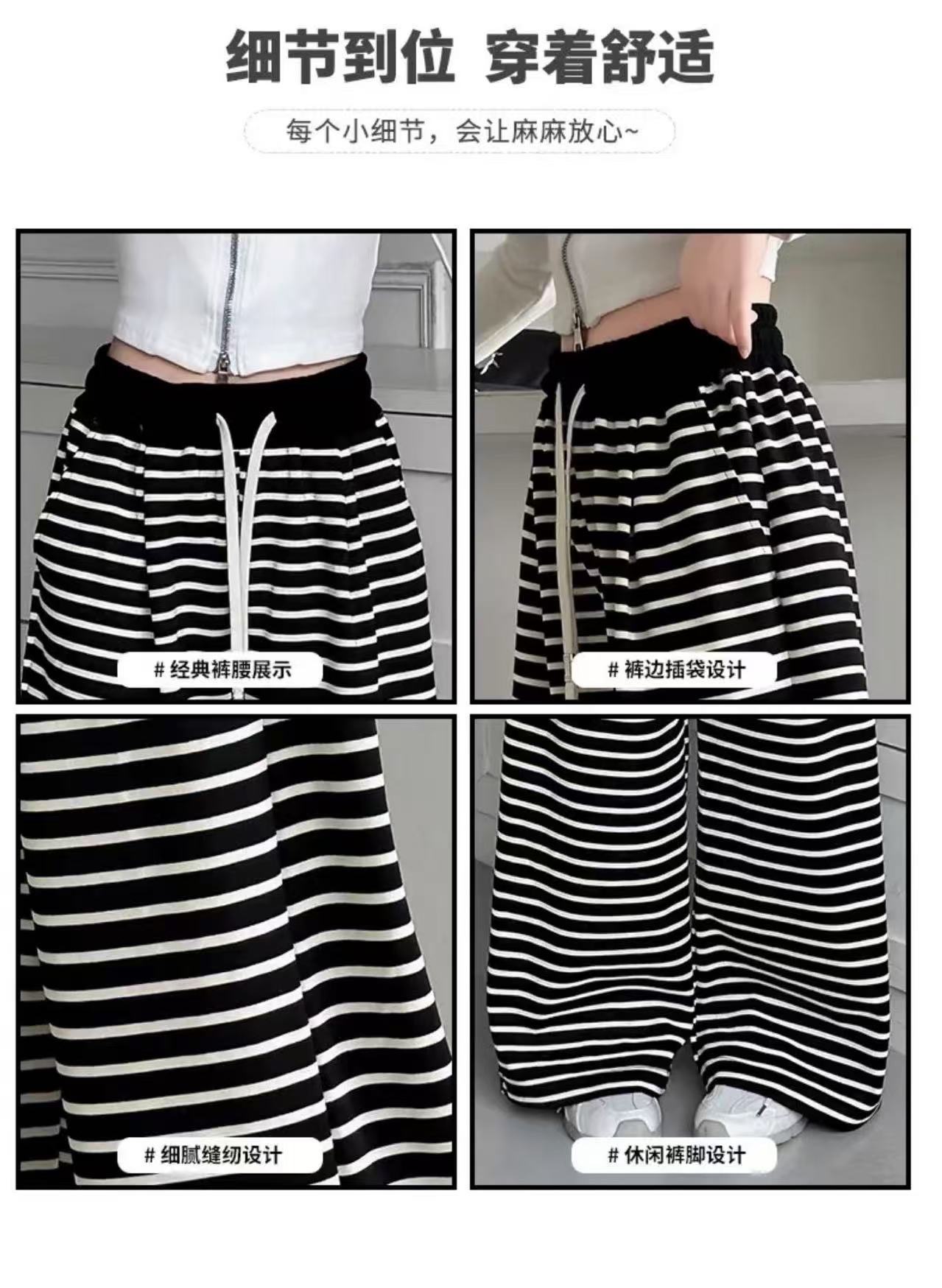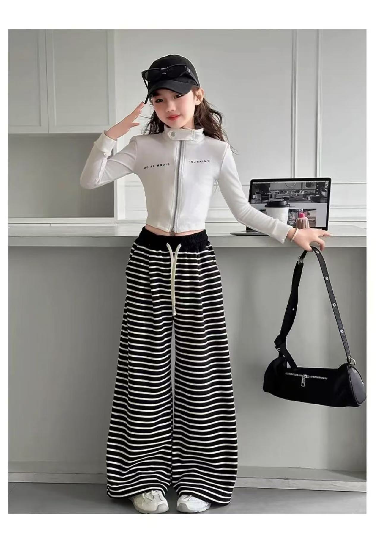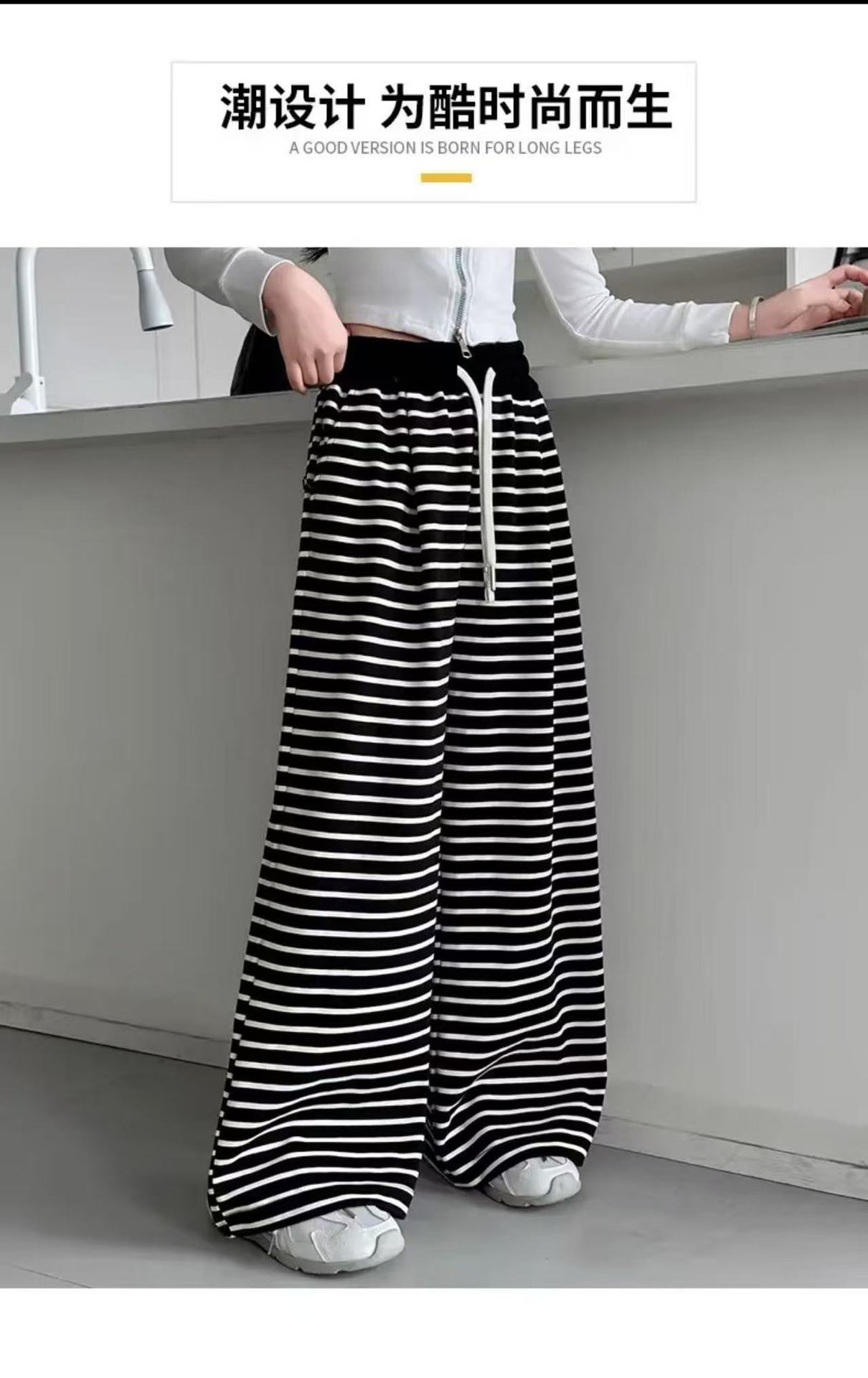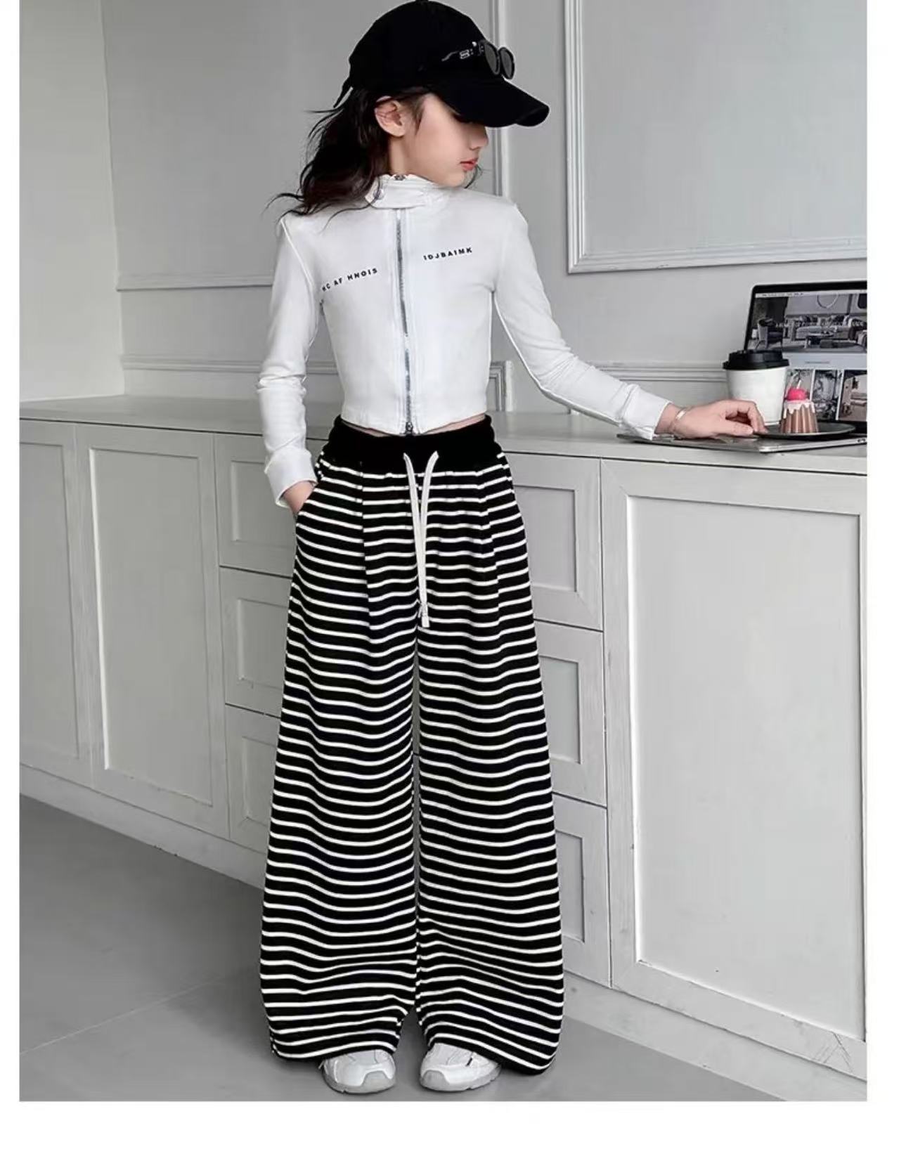 • 흰색 스트라이프 스트레이트 팬츠(드로스트링 및 포켓 있음)