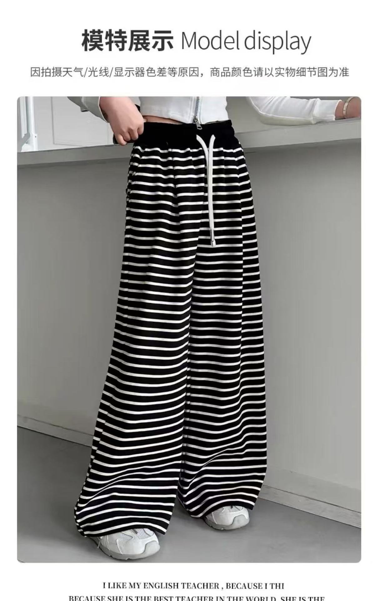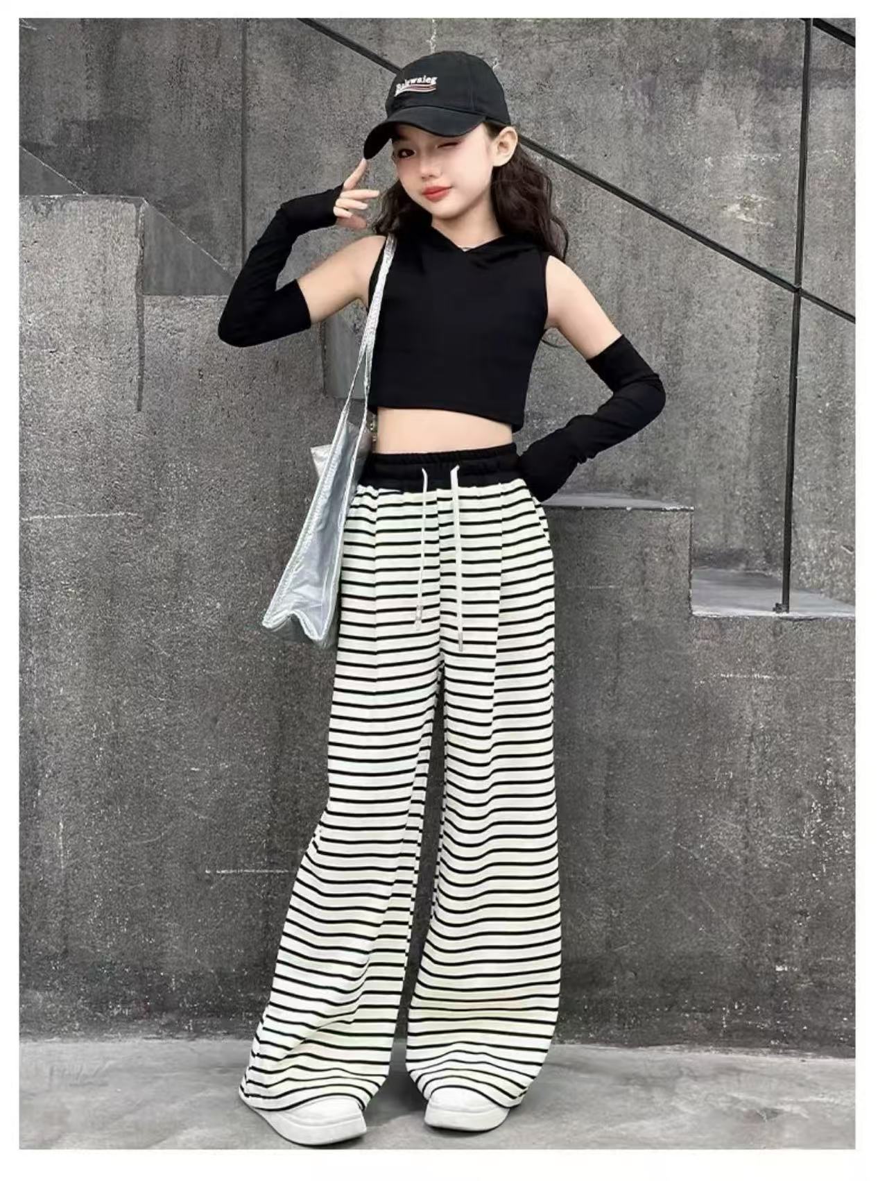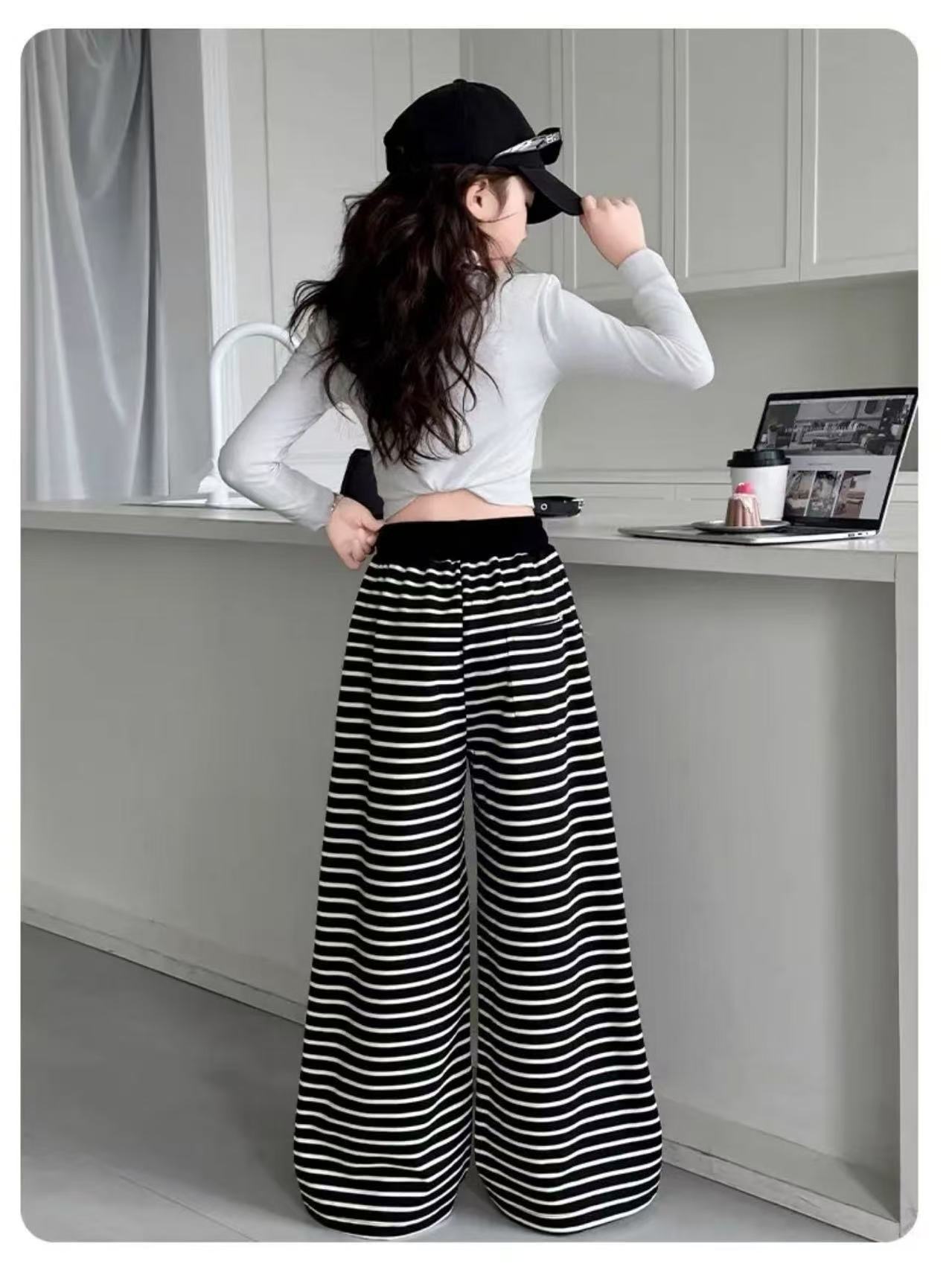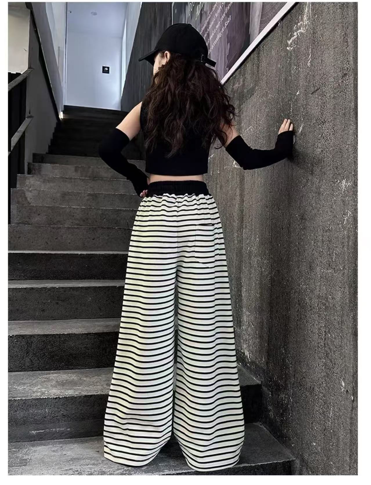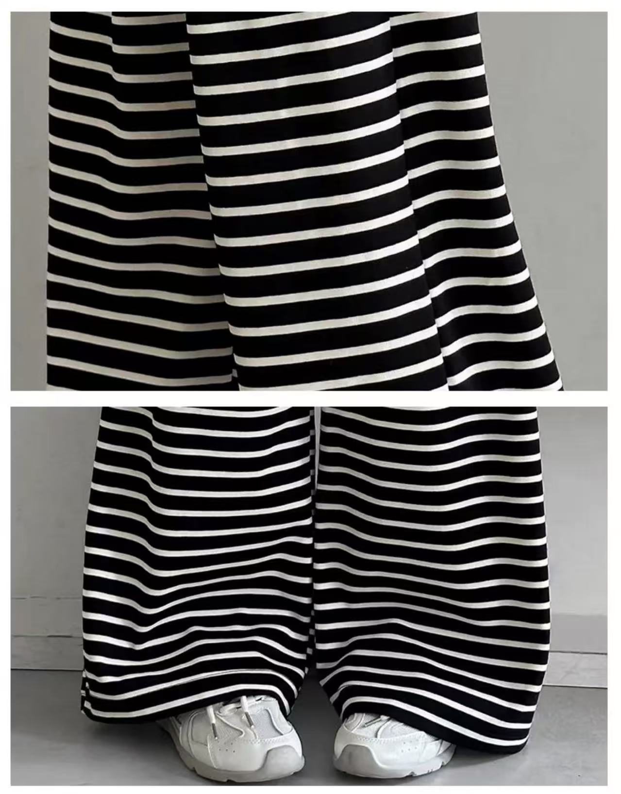 • 스트라이프 스트레이트 팬츠 - 블랙 (끈 없음, 주머니 없음)