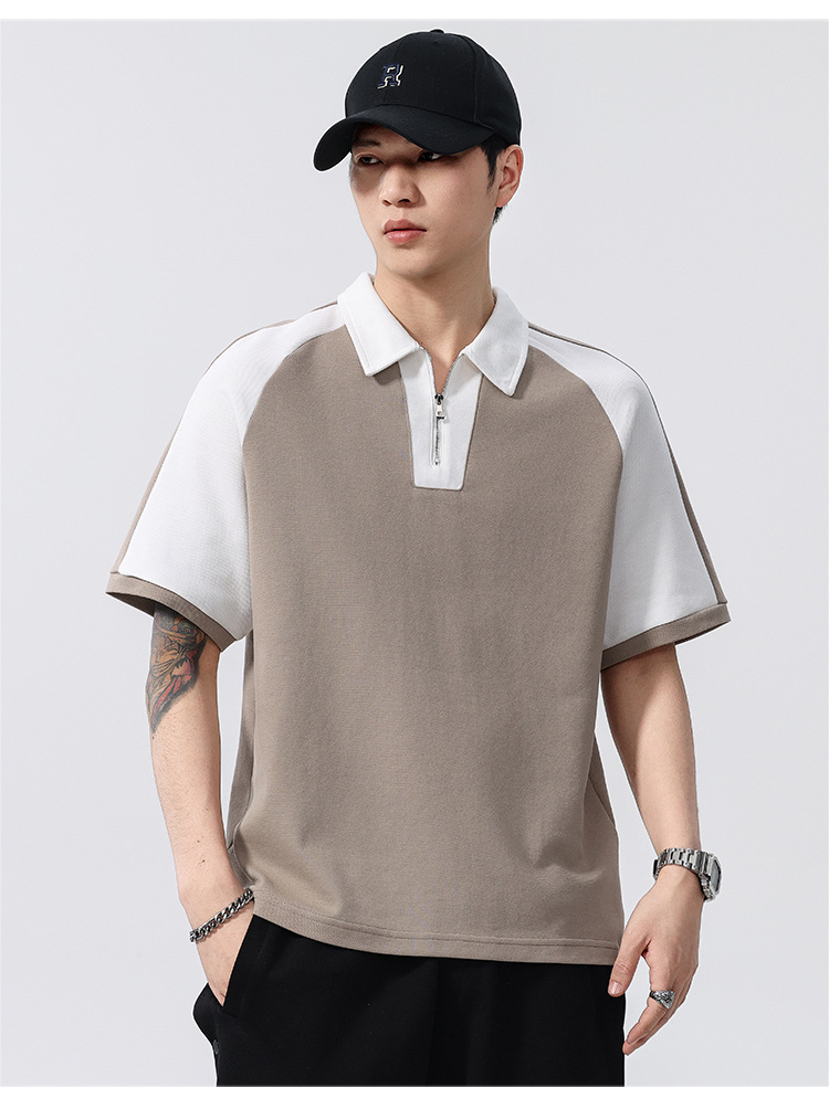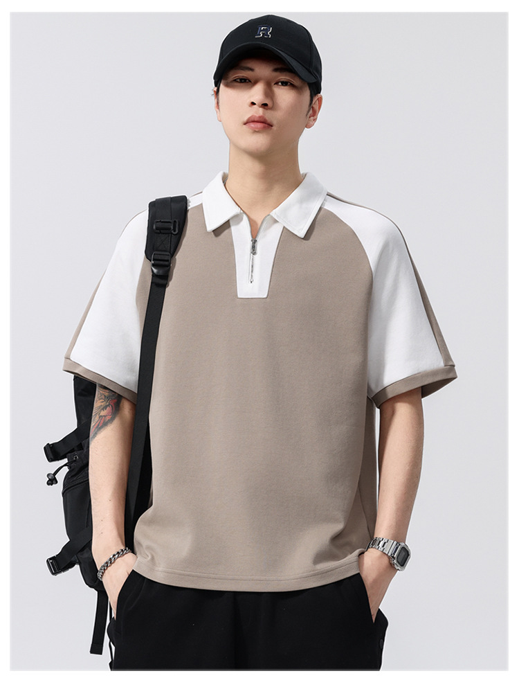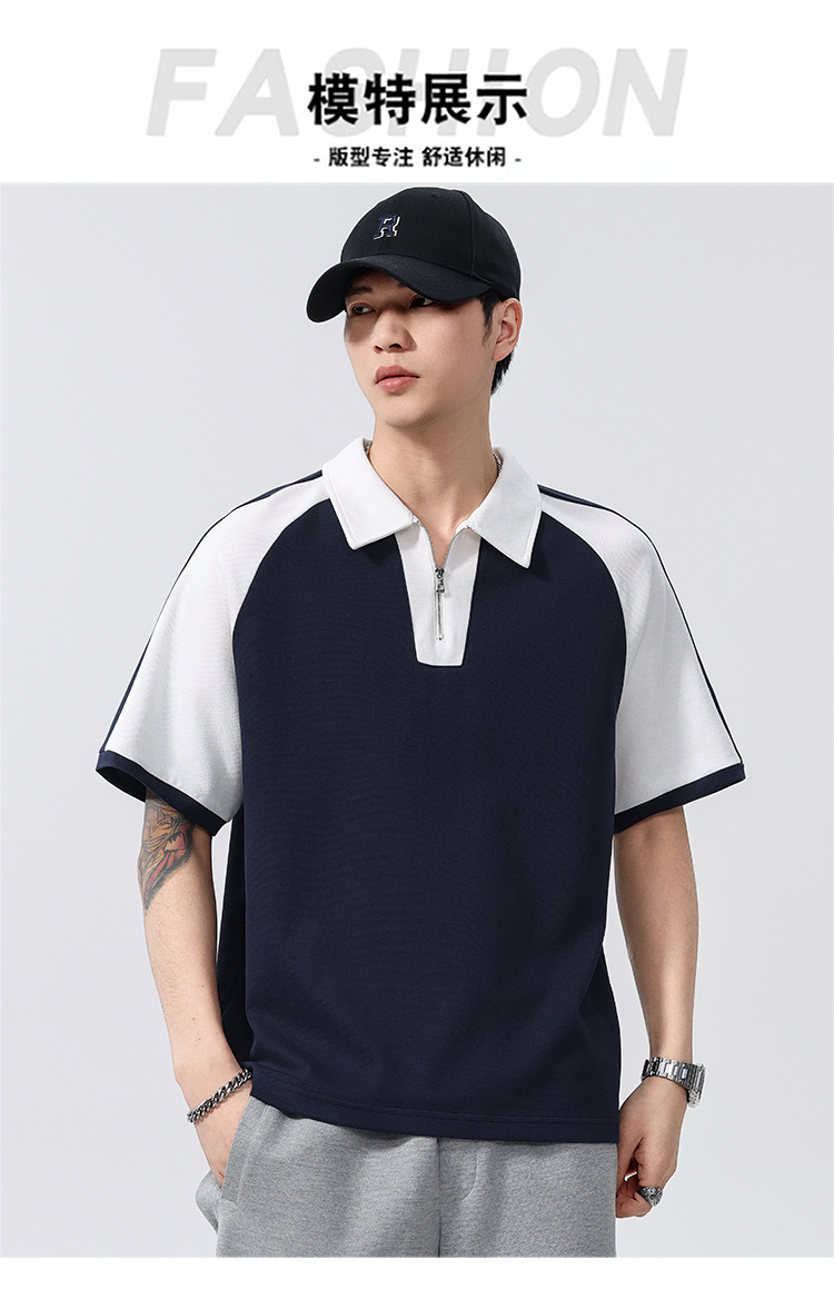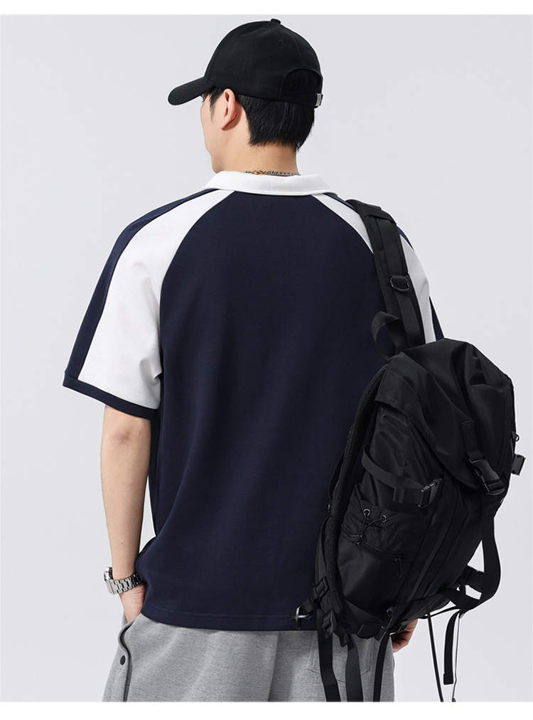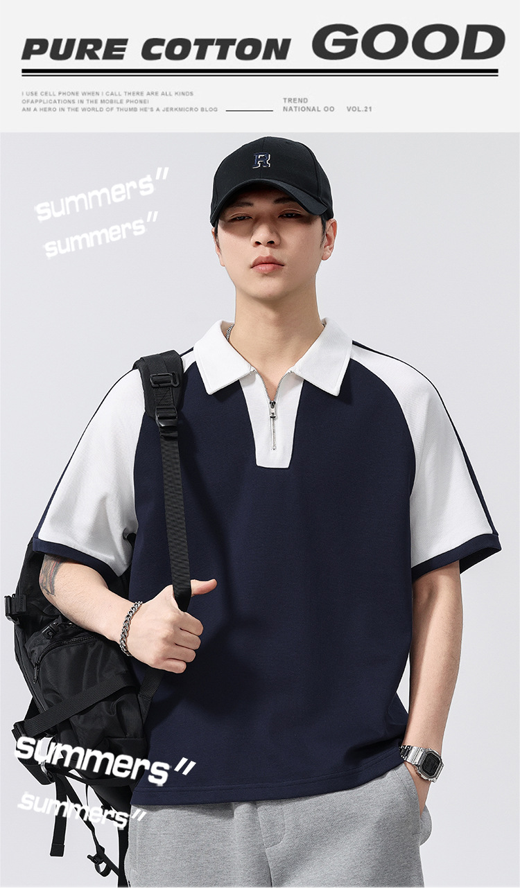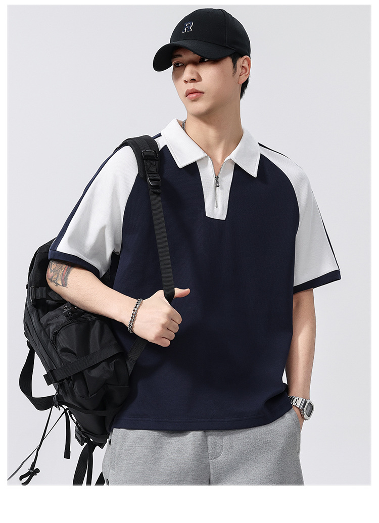 ShichengbackSummer 새로운 컬러 블록 폴로 셔츠 반팔 느슨한 캐주얼 티셔츠 반 지퍼 남성용 탑
