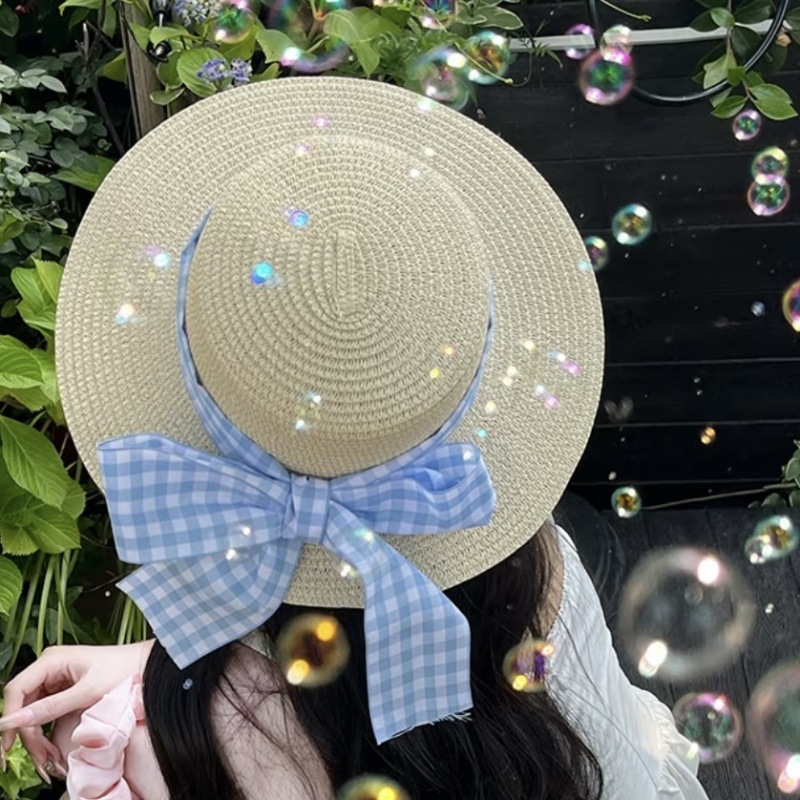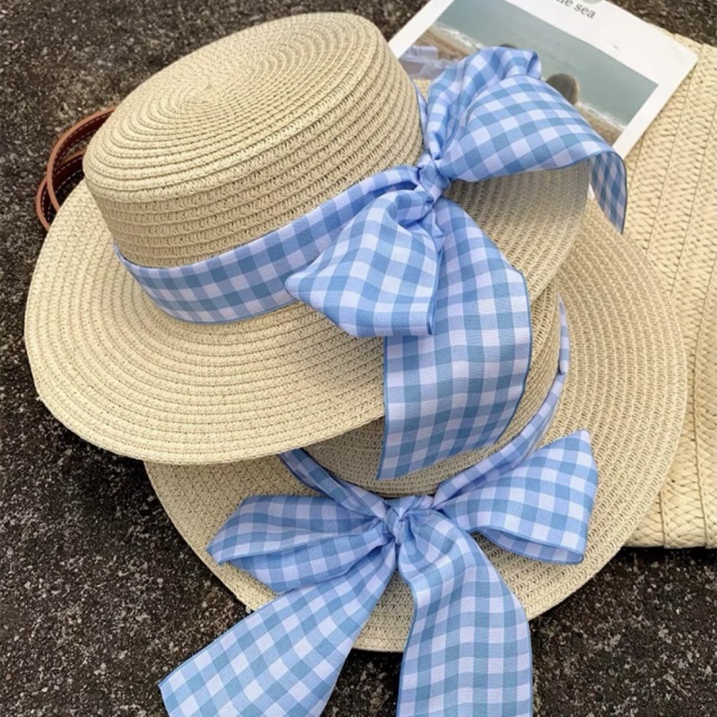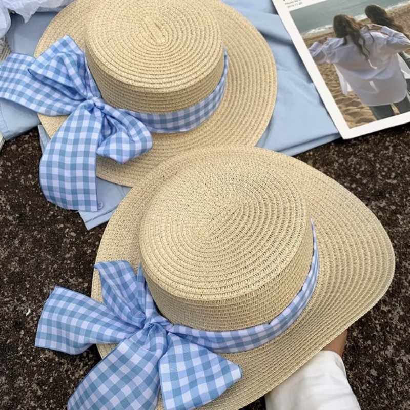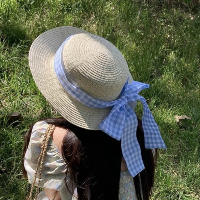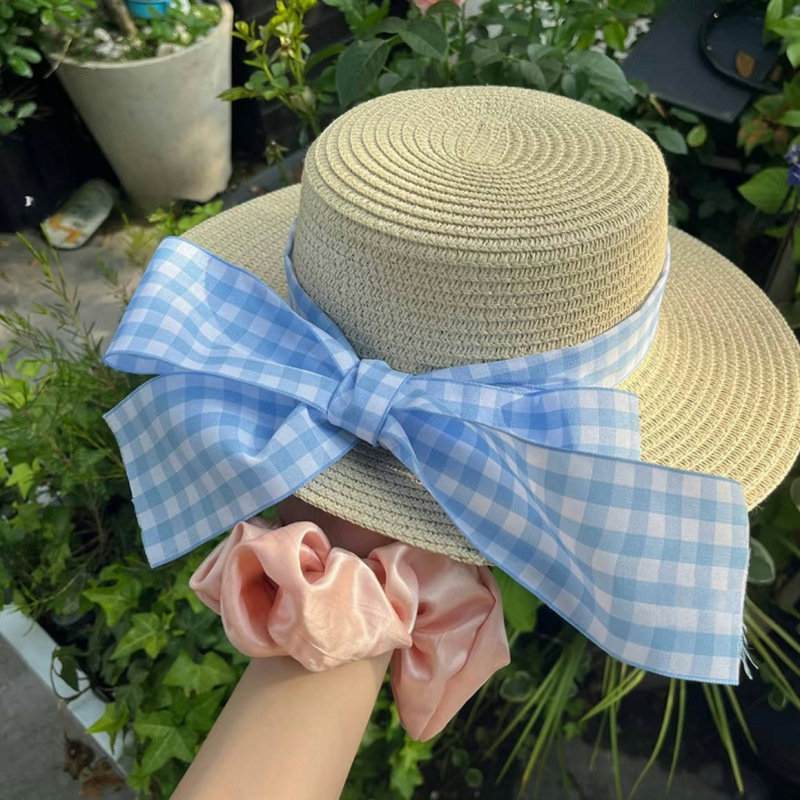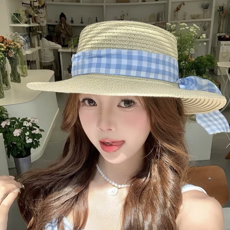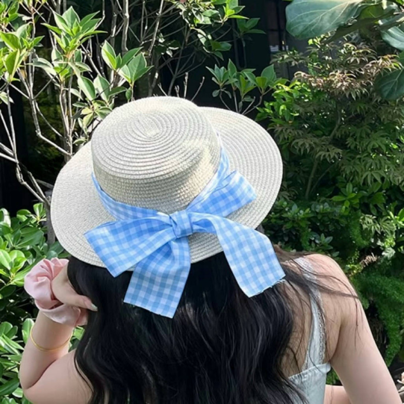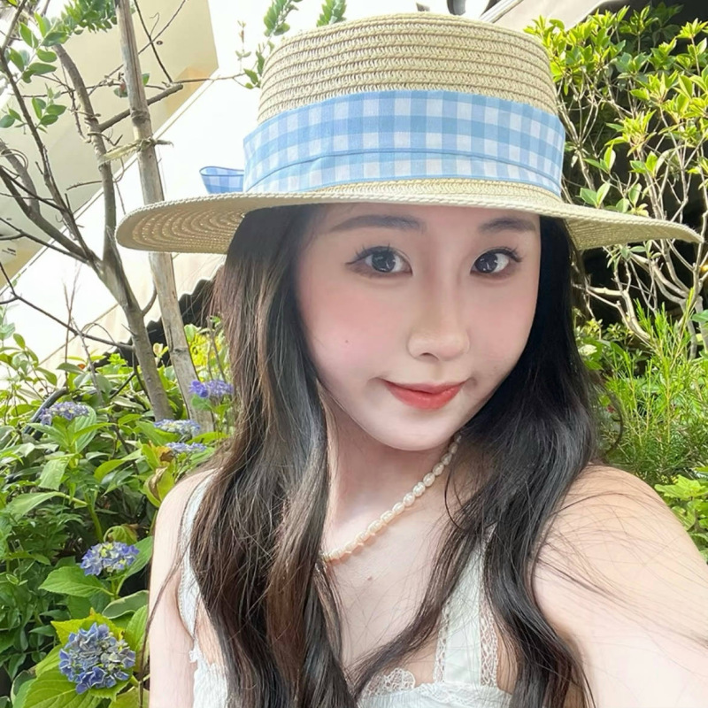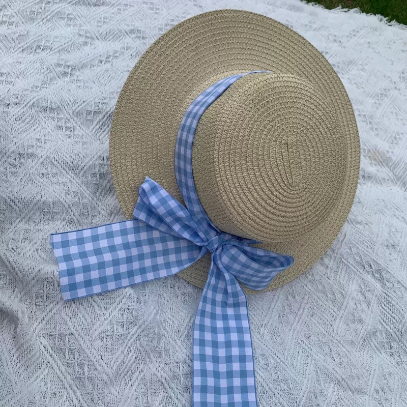 • 플랫 블루 체크 무늬 밀짚모자