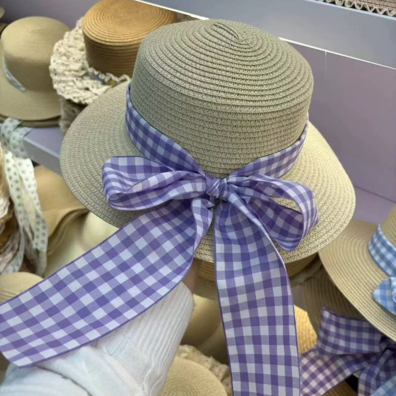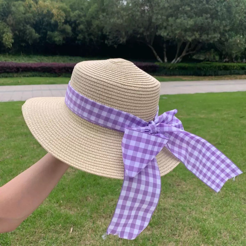 • 플랫 에지 퍼플 체크 무늬 밀짚 모자