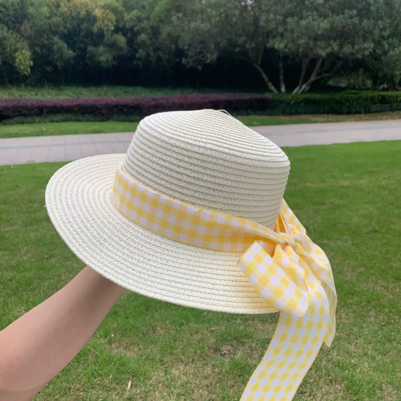 • 플랫 에지 옐로우 체크 무늬 밀짚 모자