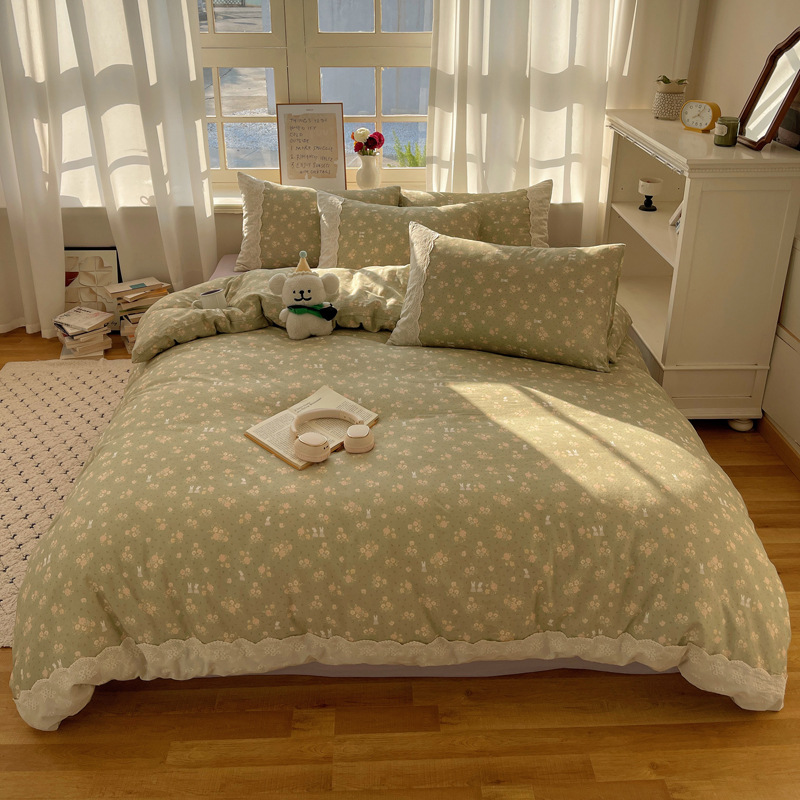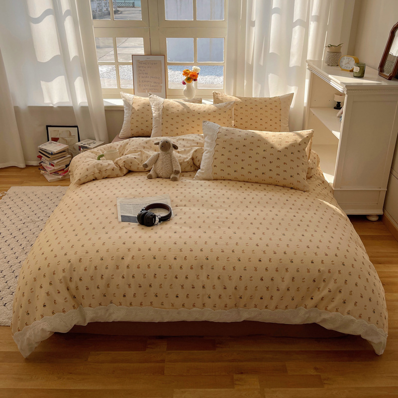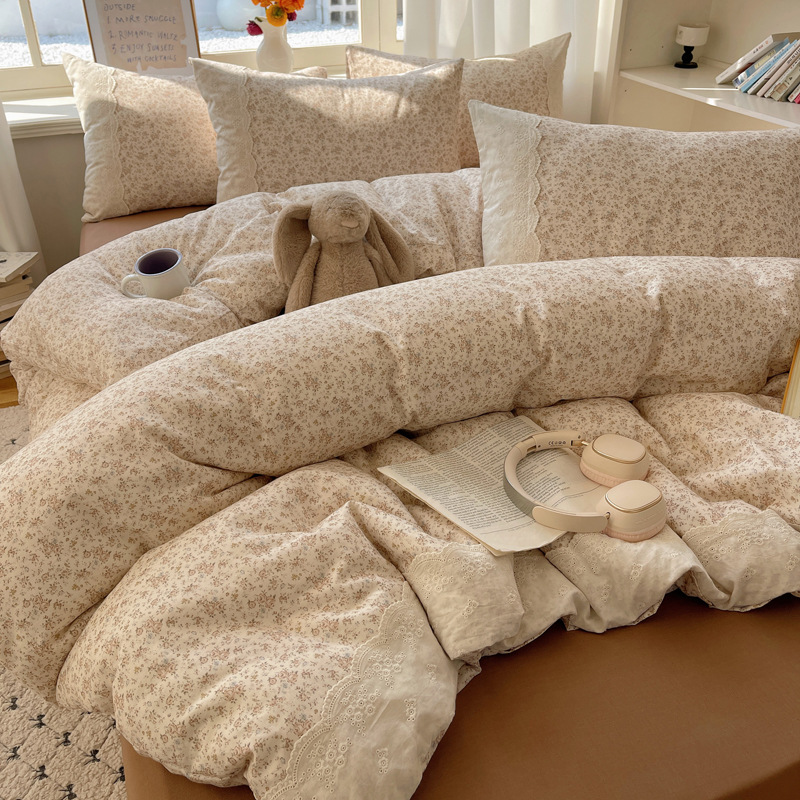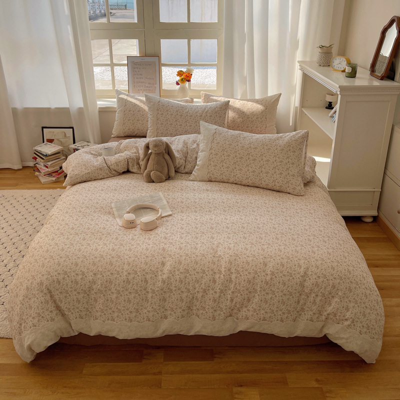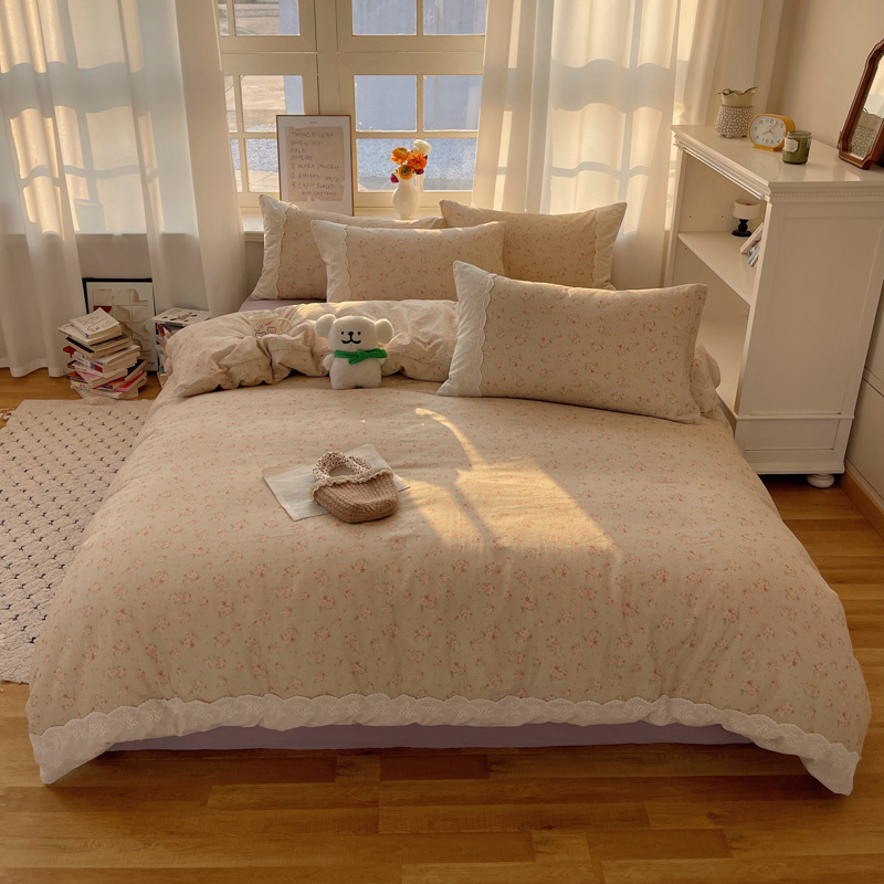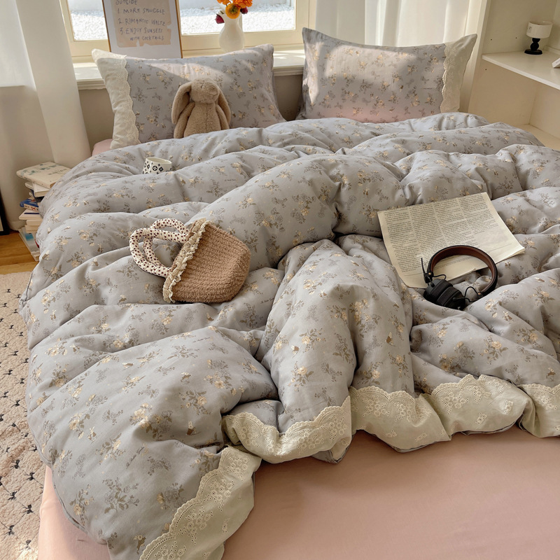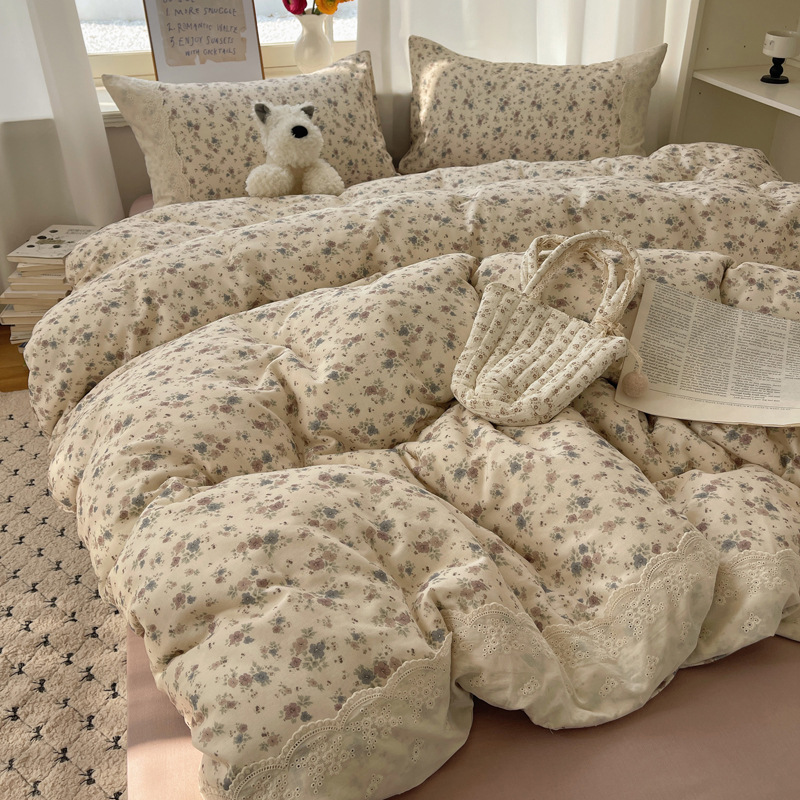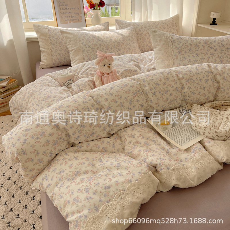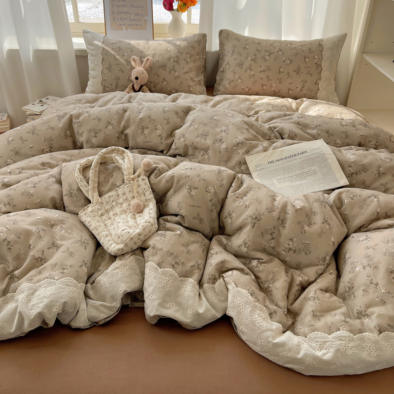 프랑스 스타일 면 꽃 더블 레이어 원사 4 조각 세트 빈티지 레이스 코튼 퀼트 커버 작은 신선한 스타일 기숙사 3 조각 세트스토어 가기