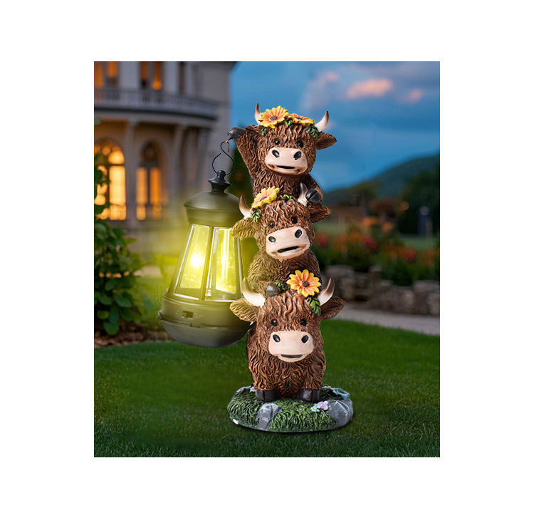 국경을 넘는 야크 환영 표지판 정원 조각품 장식품 하이랜드 소 태양광 정원 장식 야외 장식 레진 공예품