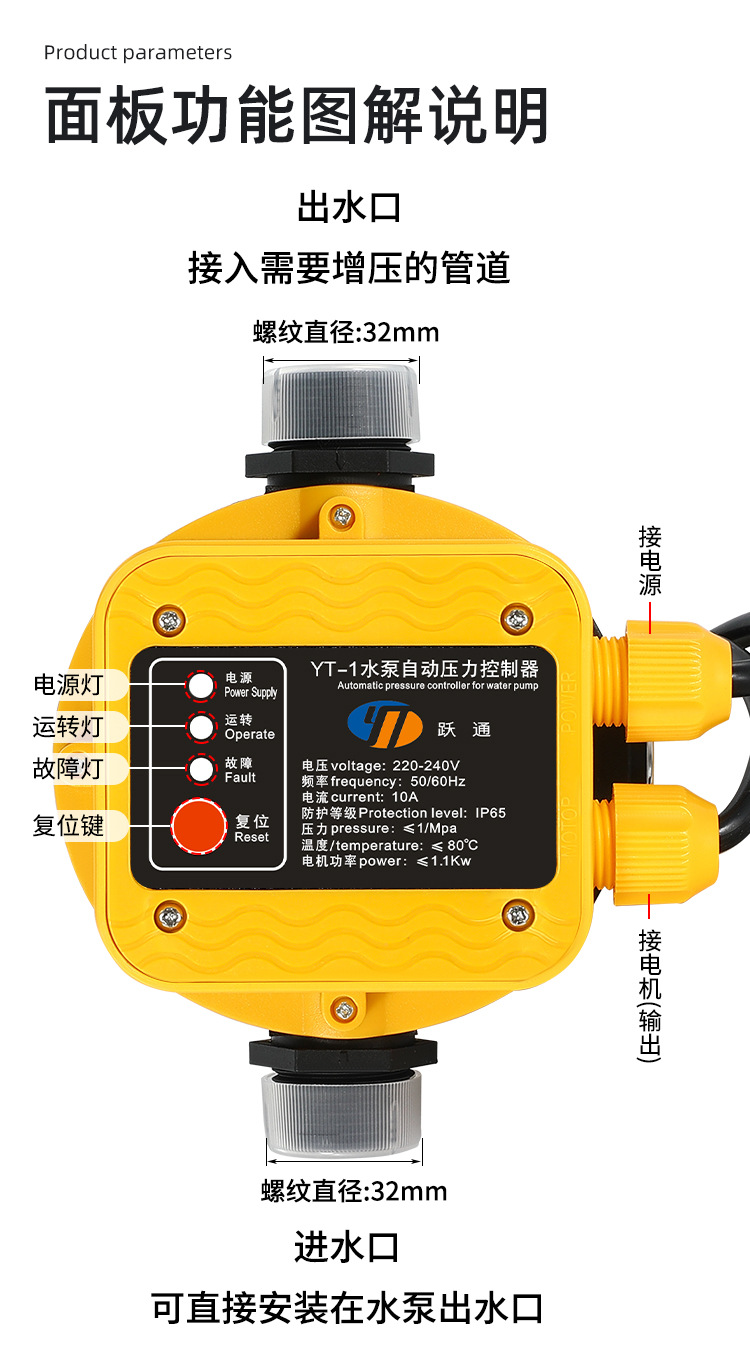 • 2.2KG 워터 펌프 헤드가 25m을 초과하면 압력을 조절할 수 없습니다.