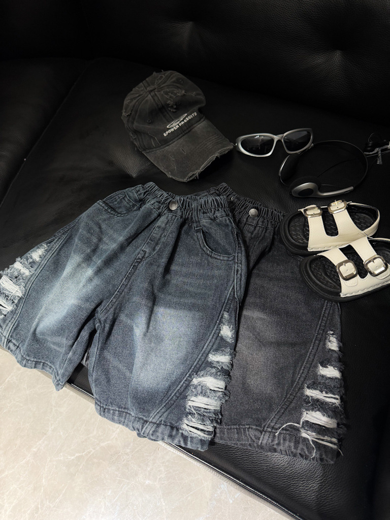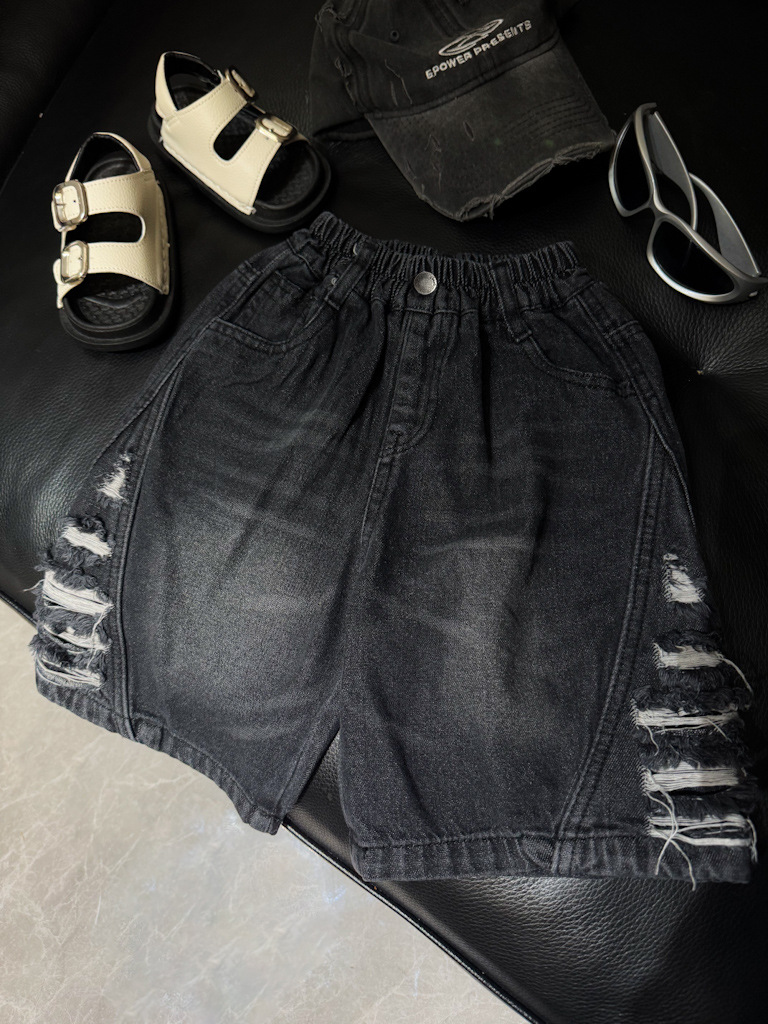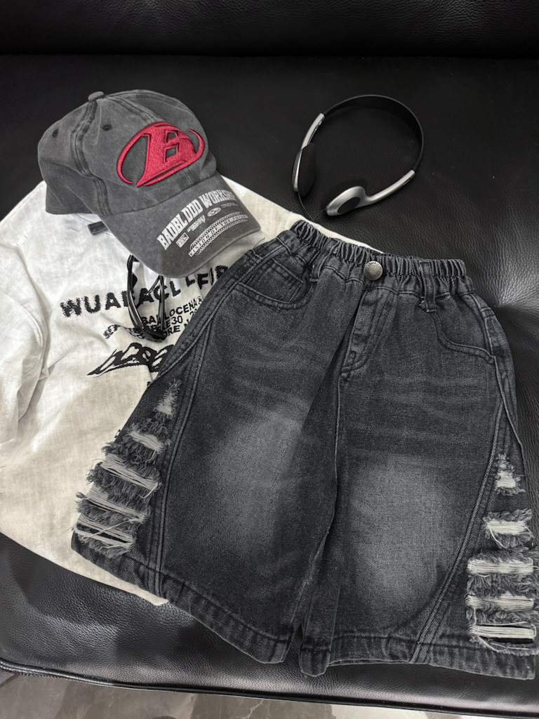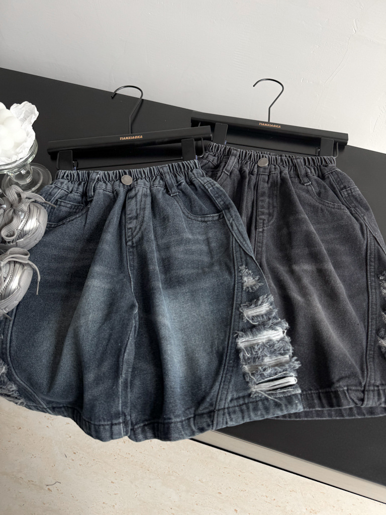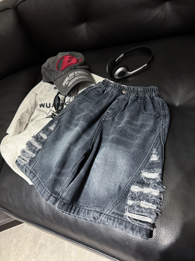 2025년 여름 신상 남녀 아동용 데미지 워싱 데님 반바지 루즈핏 트렌디 쿨 스타일 안감 있는 아동복 도매스토어 가기